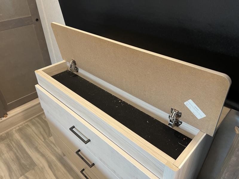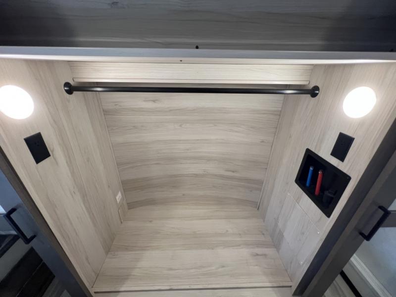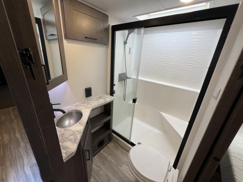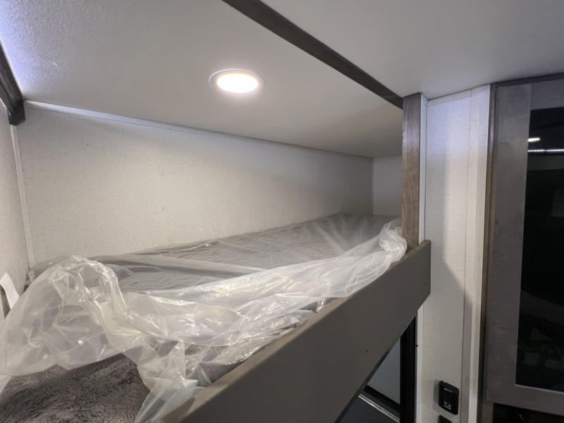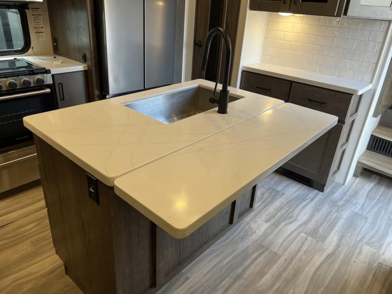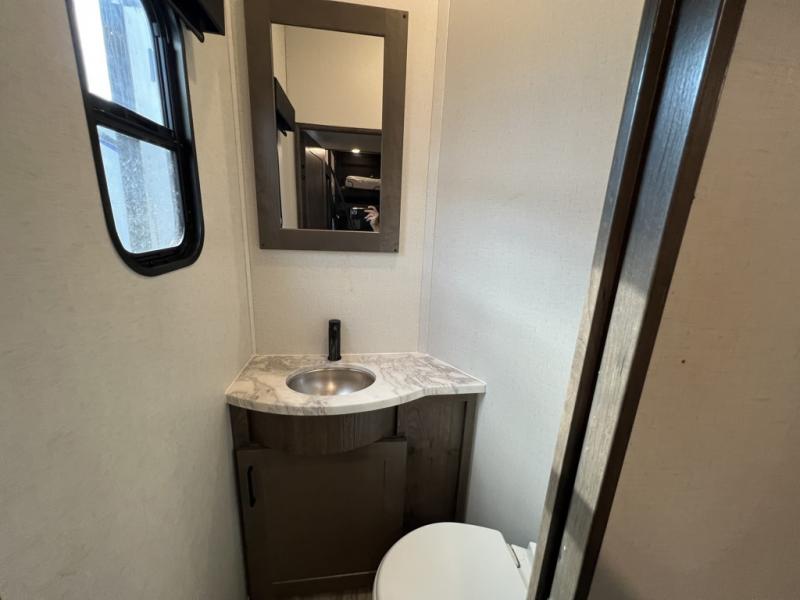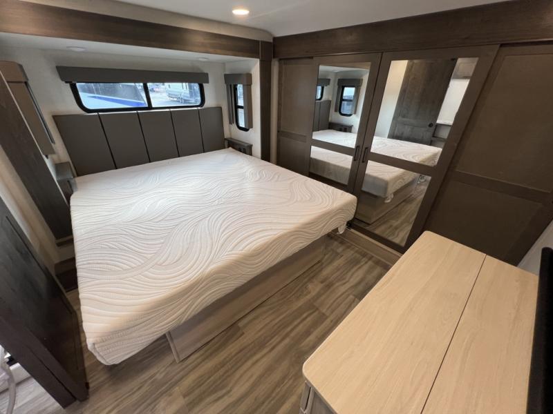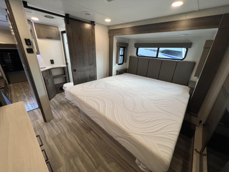 You can easily load up your toys into the 15' garage area of this toy hauler with the 8' weather resistant ramp door and keep them filled with the dual 30 gallon fuel tanks! Once you unload your toys from the garage area, you can set up the opposing HappiJac sofas with a queen mattress above them, the loft that open to the living room, and the half bathroom. The kitchen has everything you need to prepare your best meals including two hutches, three pantries, and a kitchen island with two bar stools to enjoy your morning coffee and eggs. The dual entry bathroom has a 48" x 30" shower and leads directly into the front private bedroom. Inside the bedroom is a king bed slide for more walking around space, a flip top dresser, and a front wardrobe that has an area prepped to add the optional washer and dryer.