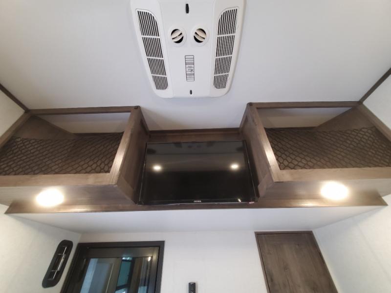The whole gang will love camping in this toy hauler! There is 13' of garage space to store your off-road toys and once you have arrived at your destination you can set up the HappiJac roll-over sofas with a queen bed above them and the loft which opens to the living area. With two full bathrooms, everyone will stay squeaky clean. The chef can prepare their best meals with the kitchen island, three burner cooktop, and 17 cu. ft. stainless steel refrigerator while others play games at the table and chairs or relax by the fireplace on the sofa. The front private bedroom has a king bed slide for more walking around space, a flip top dresser, and a front wardrobe that is prepped to add an optional washer and dryer, plus it has an entrance into the dual entry bathroom!