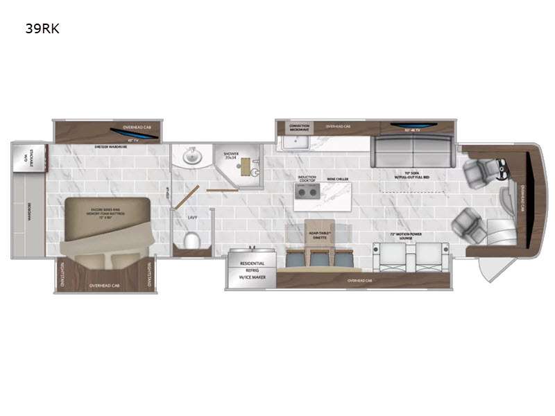 Pack your bags and fuel up this motorhome for a comfortable road trip excursion! You can rest up each night on the Encore Series king memory foam mattress in the rear private bedroom and enjoy clean clothes throughout with the stackable Samsung washer and dryer next to the wardrobe. A guest or two can even tag along and sleep on the 70" sofa with pull-out full bed. A separated bathroom makes it nice and convenient for one person to freshen up in the 39" x 34" shower with a seat while another uses the toilet with a privacy door. Your beverages can be stored in the wine chiller under the kitchen island to free up space in the residential refrigerator which also has an ice maker. Once you have prepared a delicious home cooked meal with the two burner induction cooktop, you can enjoy it at the adaptable dinette!