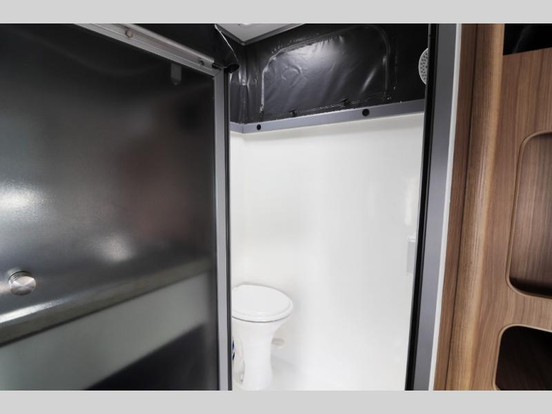 Full fiberglass wet bath with ventilation and toilet — all the comforts of home on the road.