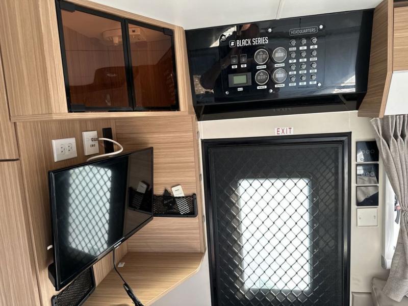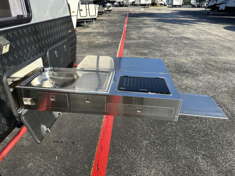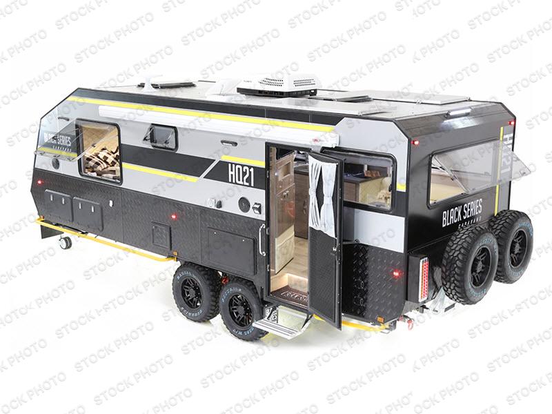 The Black Series Camper HQ Series travel trailers are one-of-a-kind! You won't find many more trailers like these out on the market. Built for the extreme camping enthusiast, the HQ Series is off-road and off-grid friendly. These rugged trailers have aluminum composite panels with added aluminum diamond plating for added strength and a stone guard/skid guard that adds protection for the bottom edge of the trailer. The Eurovision windows have a fly screen and privacy shades, and there is also a tri-lock security door with locking fly screen. An amazing feature that comes on each of the models is the outdoor kitchen which has a stainless steel sink slide, a propane stove, and a large prep table, and the roof-mounted solar panels are amazingly useful for those off-grid trips.