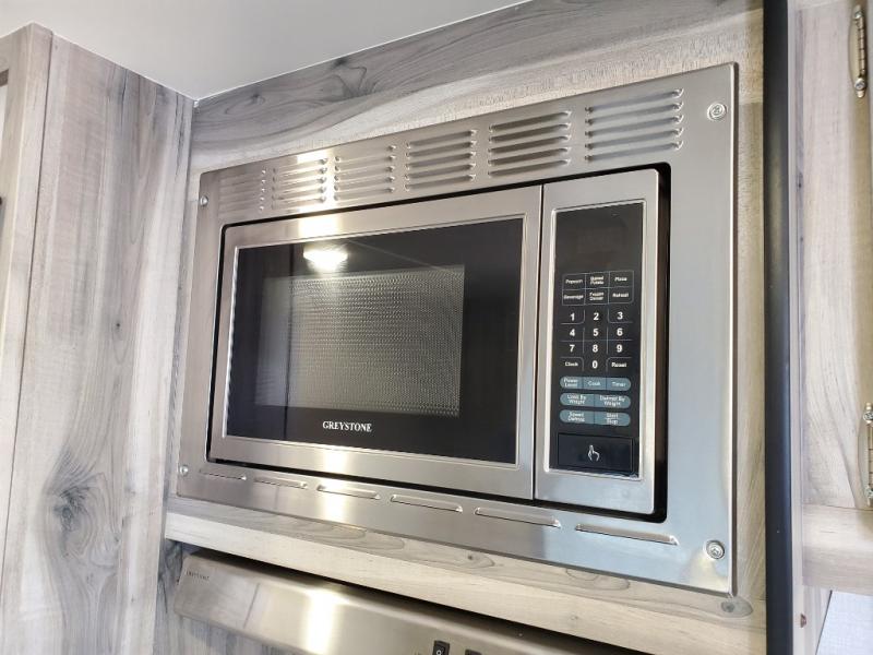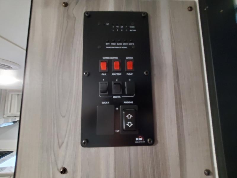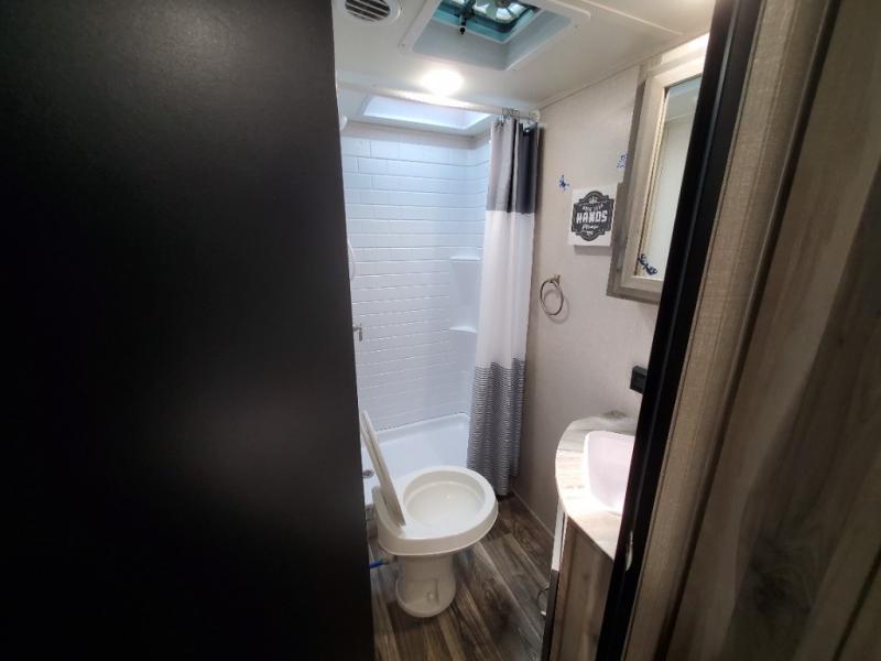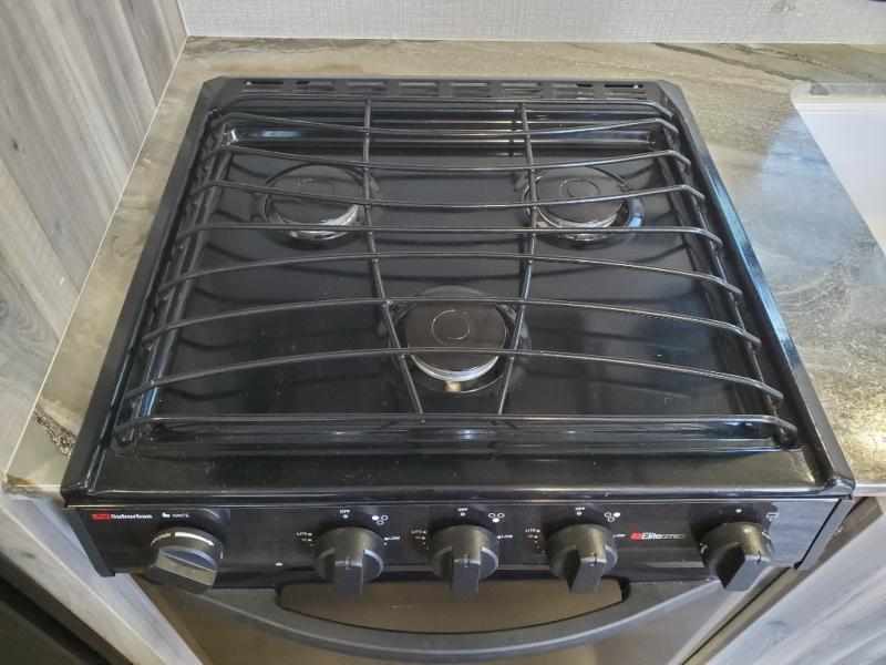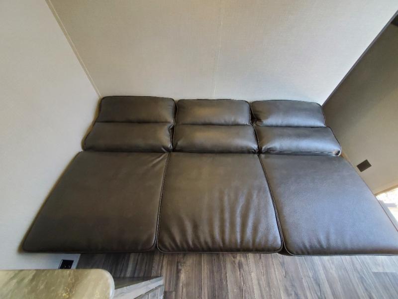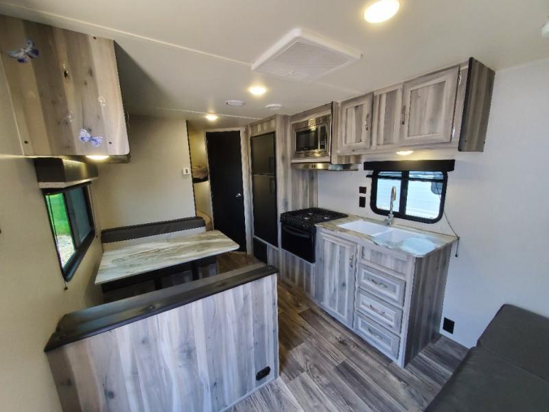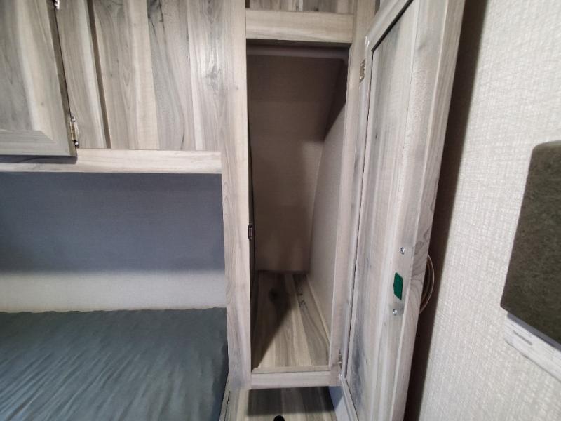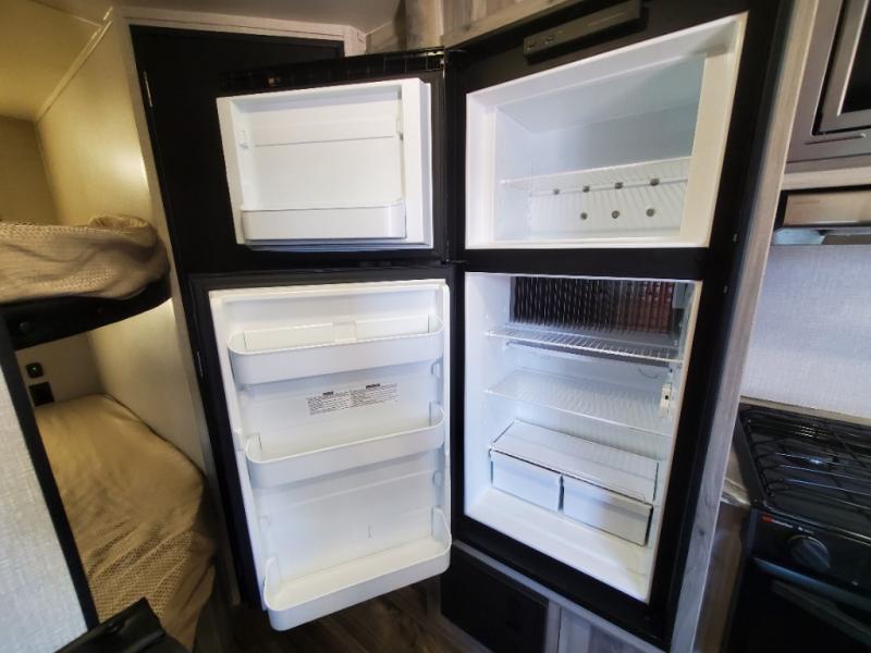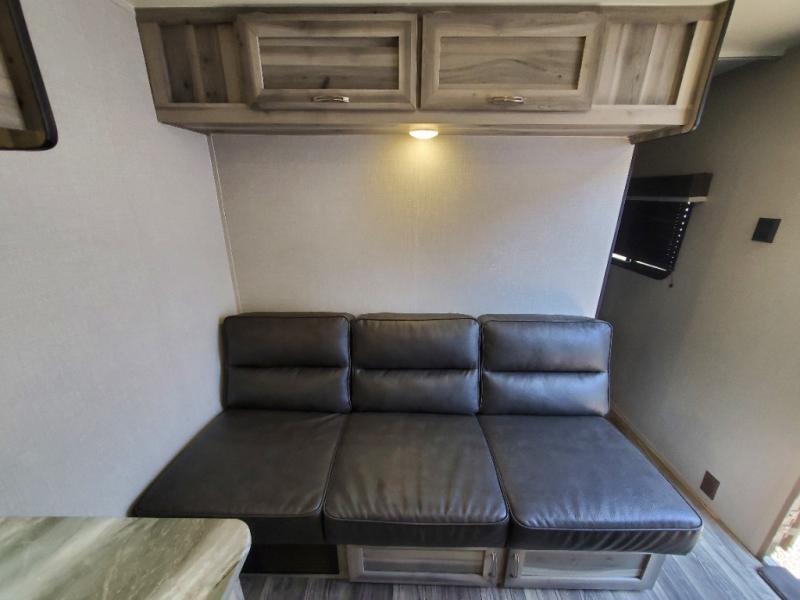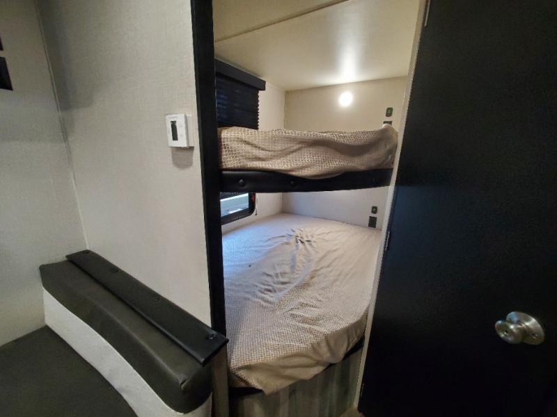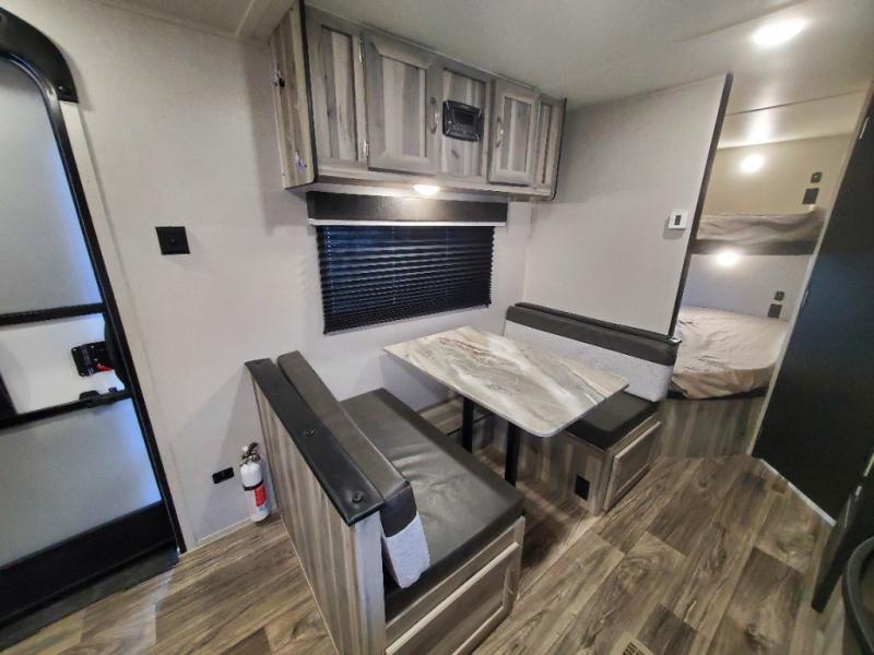 With a set of double bunk beds, the whole family can join in on the adventure in this travel trailer! The rear corner bathroom has a tub/shower to rinse off in and an optional skylight that can be added for natural lighting. Start and end your days with full bellies thanks to the three burner cooktop and 10.6 cu. ft. refrigerator. You can even bring along another guest or two to sleep on either the sofa or the booth dinette. The front private bedroom has a queen bed with wardrobes on either side to keep your clothes out of the way!