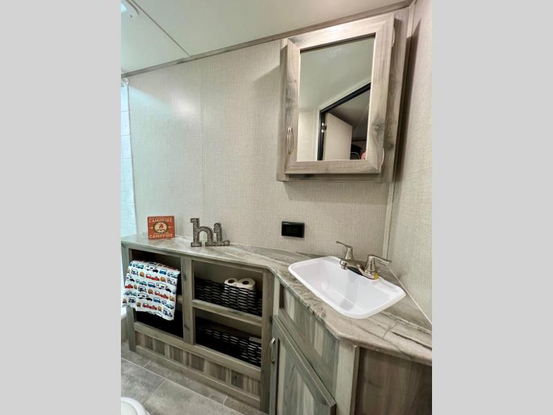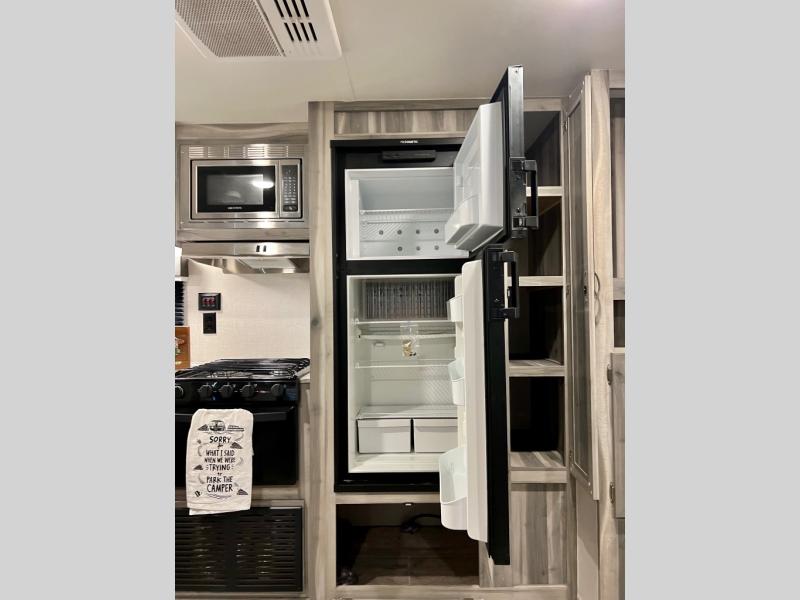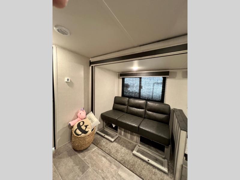 Everyone will have a comfortable place to lay their heads at night in this travel trailer! From the front private bedroom with a queen bed to the rear corner double bunk beds, plus the booth dinette and sofa can transform into extra sleeping spaces. You can prepare a delicious home cooked meal with the three burner cooktop or add the optional bumper mount grill with swing arm to grill up some juicy burgers while feeling the sun on your face!