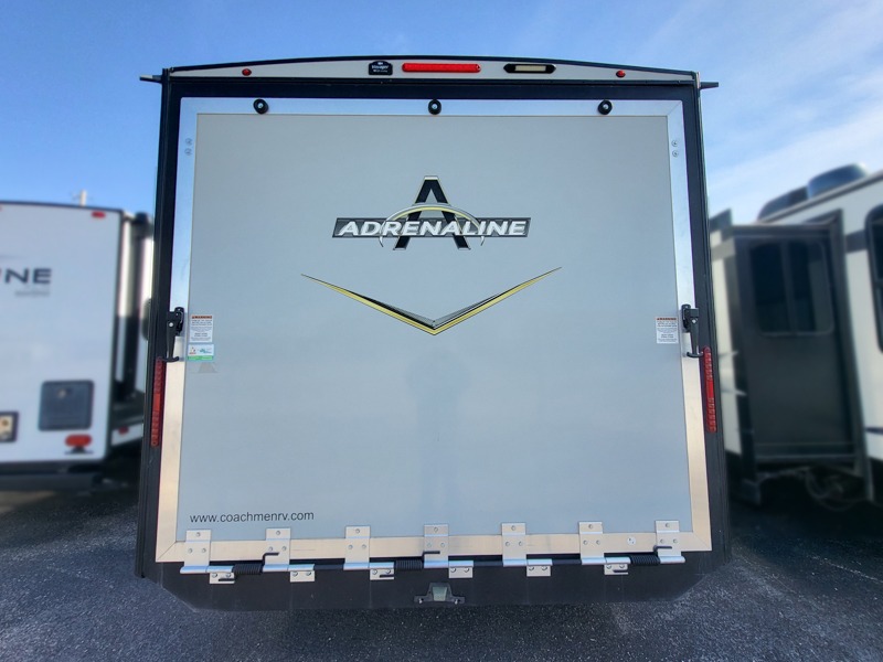 With any Adrenaline toy hauler travel trailer by Coachmen, the required Exterior Value package includes a one-piece Tufllex PVC roof membrane, a fiberglass front cap with rock guard to help against road debris, heavy duty Dexter axles with Nev-R-Adjust brakes and E-Z Lube, and aluminum wheels. Some exterior standards include a heated and enclosed underbelly, a patio ready ramp door with cables for an outdoor above ground space to enjoy, a power tongue jack for easy setup, and an outside spray port to clean off your toys. The interior standards include HD rubberized oil/gas/moisture resistant flooring in the garage area, shaker style cabinets and doors, a rear detachable screen, and USB charging ports in multiple locations for your electronics to mention a few.