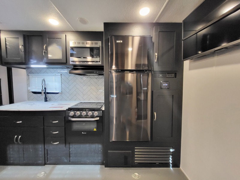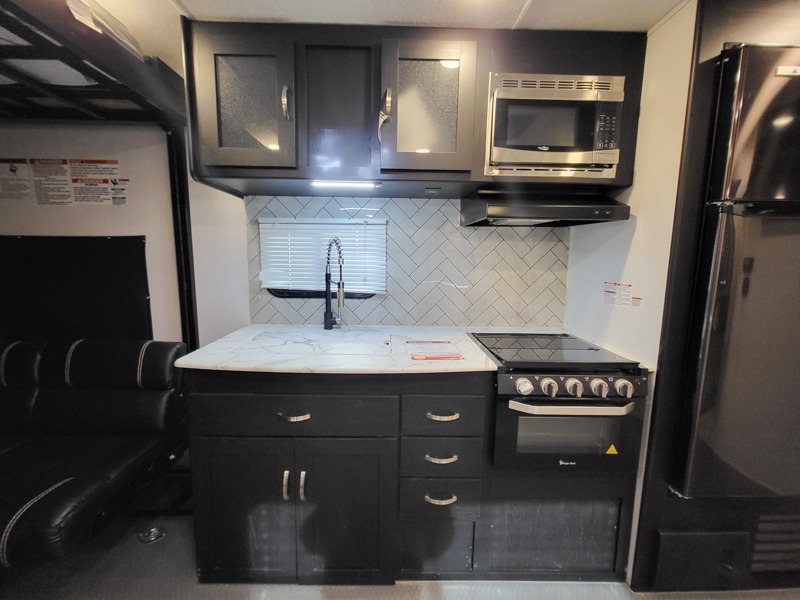 Whether you hit the trails or relax indoors, you will love having this travel trailer at the campsite! After you've unloaded your dirt bikes from the 15' 9" garage, enjoy lunch on the roll-over sofas with a dinette. You may even decide to check the weather on the 39" LED HDTV before heading out to find a trail. This trailer includes a dual entry bath with a shower skylight for extra standing space and the front master bedroom will provide complete comfort with its king bed. And you can choose a few options to add such as an electric bed over the sofas for more sleeping space, a 30 gallon fuel tank to keep the toys running the whole trip, plus more if you like.