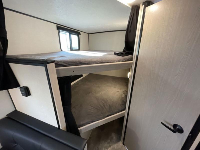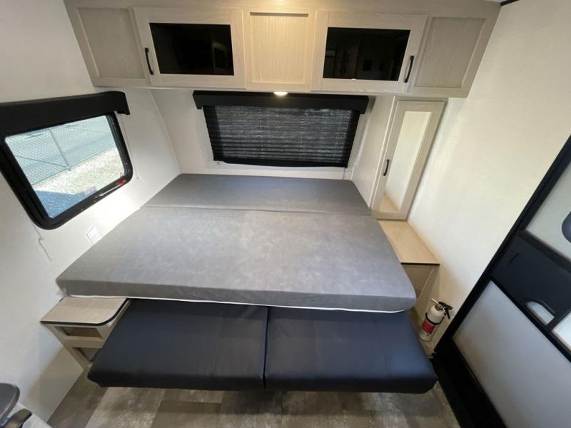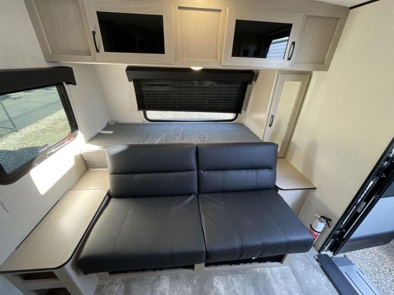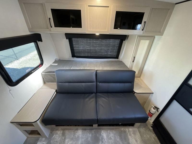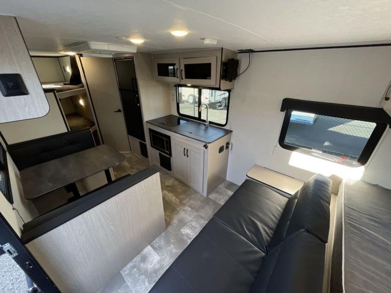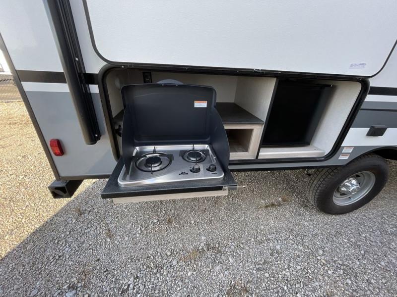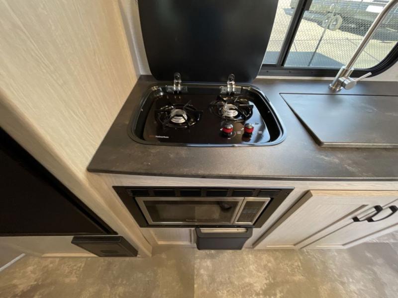 This travel trailer offers versatility with a front Murphy bed! Depending on what time of day you enter the unit will determine whether you see the bed or the sofa. There is a rear corner double bed bunk above a lower flip up double bed and a booth dinette that can transform into an extra sleeping space when you're not using it to enjoy a meal or play a card game. Everyone can stay clean with tub/shower in the rear corner bathroom and their bellies full with the two burner cooktop and 6 cu. ft. gas/electric refrigerator. You can even cook outdoors with the exterior camp kitchen while staying protected by the power awning with LED lighting!