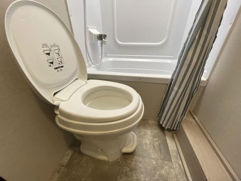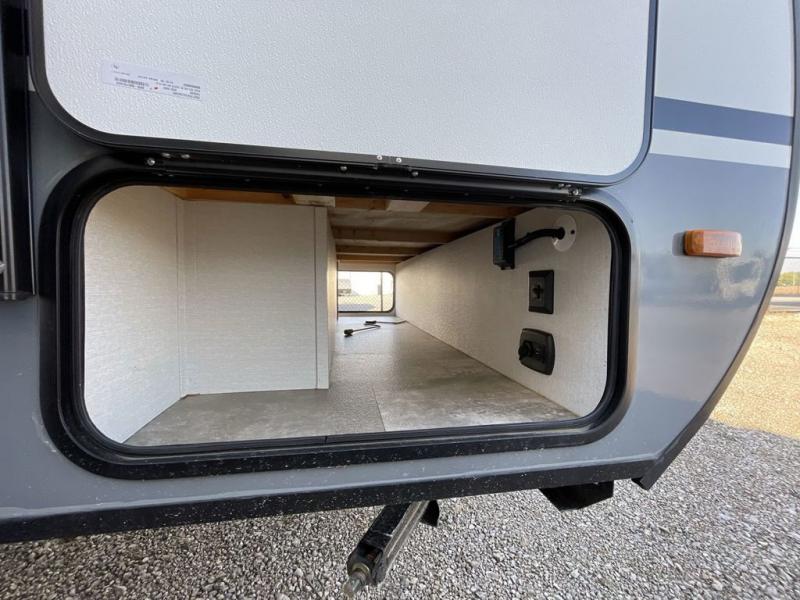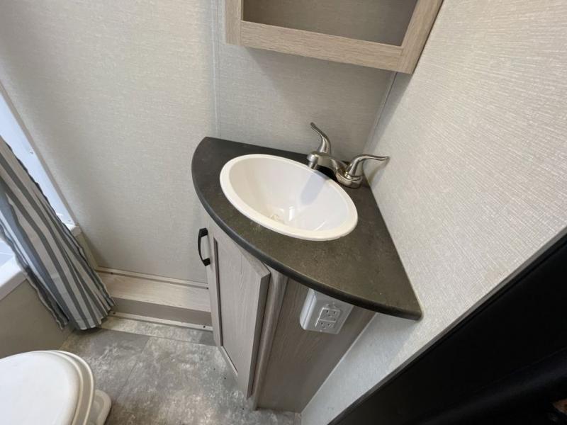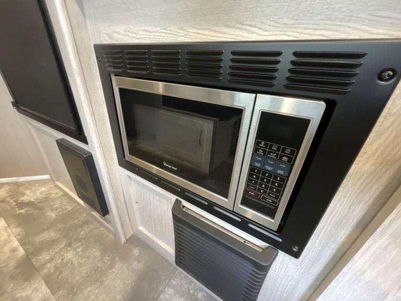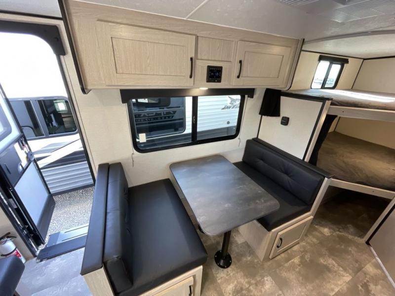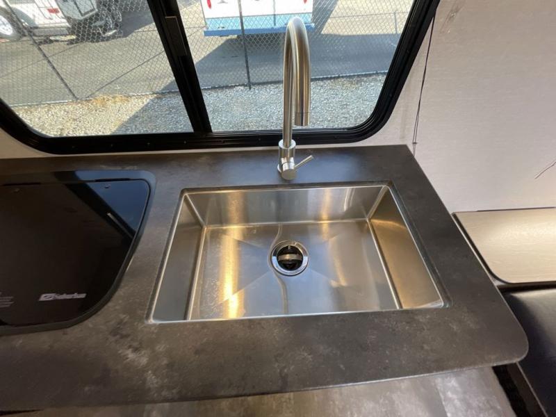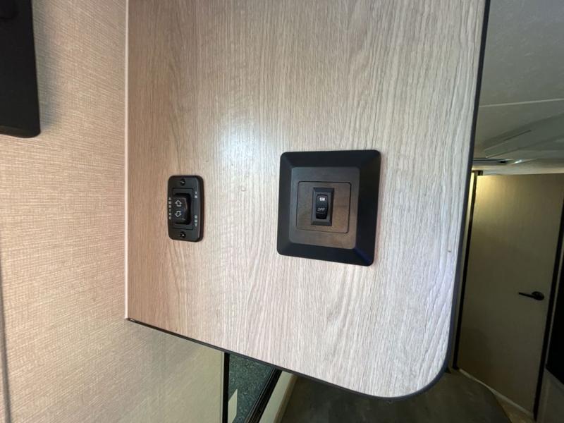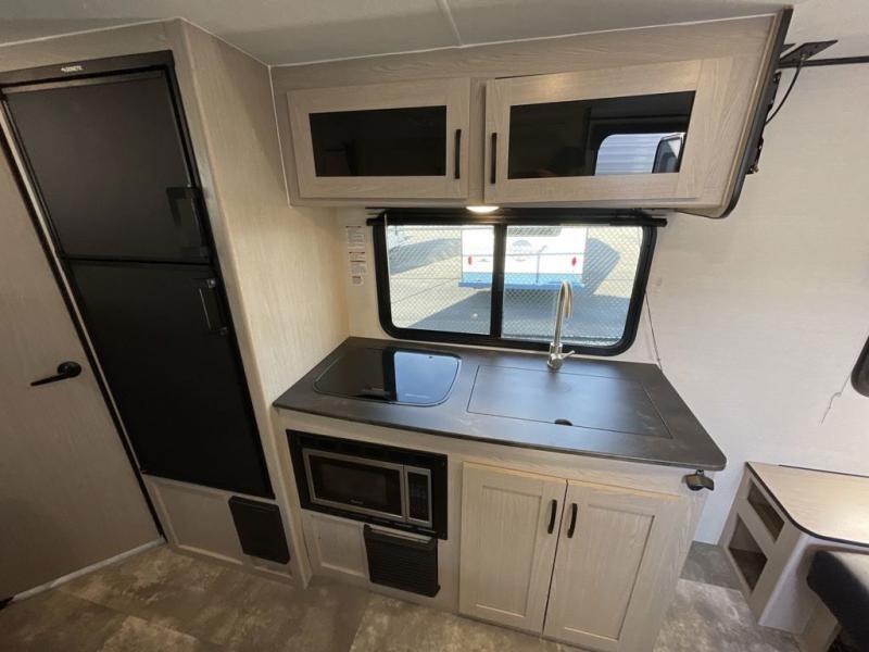 This travel trailer offers versatility with a front Murphy bed! Depending on what time of day you enter the unit will determine whether you see the bed or the sofa. There is a rear corner double bed bunk above a lower flip up double bed and a booth dinette that can transform into an extra sleeping space when you're not using it to enjoy a meal or play a card game. Everyone can stay clean with tub/shower in the rear corner bathroom and their bellies full with the two burner cooktop and 6 cu. ft. gas/electric refrigerator. You can even cook outdoors with the exterior camp kitchen while staying protected by the power awning with LED lighting!