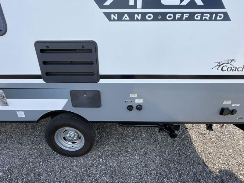 You will find comfort, convenience, and a sturdy construction with each of these Coachmen RV Apex Nano travel trailers! They are held together with an aluma-cage construction, vacuum-bonded Azdel fiberglass walls, an I-beam chassis, and a roof membrane with Dicor Crossflex, plus the powder coated frame is corrosion resistant. The Dexter E-Z lube axles and nitrogen filled radial tires will help you arrive safely. The mandatory Nano package comes with many features to make camp life better like magnetic baggage door catches, outside speakers, a digital TV antenna with cable hook-ups and WiFi capability, and a hot/cold outside shower to keep the dirt outside where it belongs. Come find the perfect model that fits your needs today!