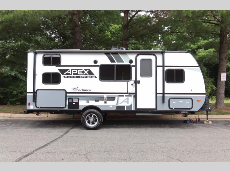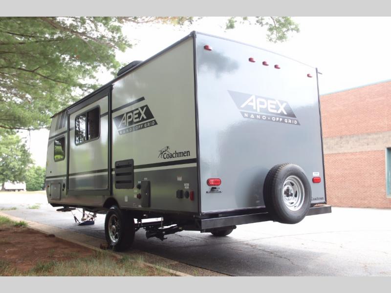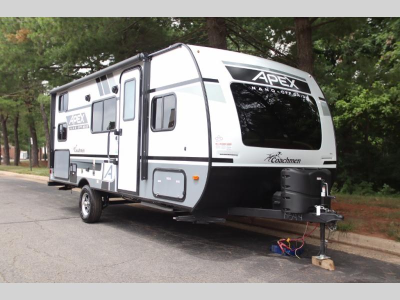 You will find comfort, convenience, and a sturdy construction with each of these Coachmen RV Apex Nano travel trailers! They are held together with an aluma-cage construction, vacuum-bonded Azdel fiberglass walls, an I-beam chassis, and a roof membrane with Dicor Crossflex, plus the powder coated frame is corrosion resistant. The Dexter E-Z lube axles and nitrogen filled radial tires will help you arrive safely. The mandatory Nano package comes with many features to make camp life better like magnetic baggage door catches, outside speakers, a digital TV antenna with cable hook-ups and WiFi capability, and a hot/cold outside shower to keep the dirt outside where it belongs. Come find the perfect model that fits your needs today!