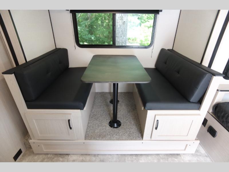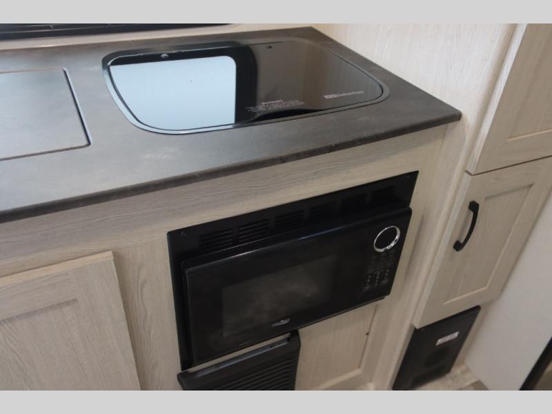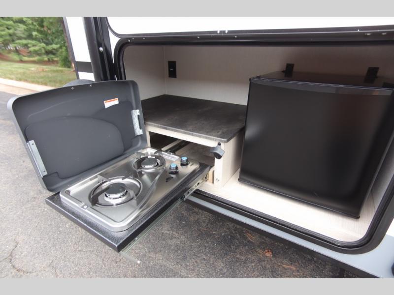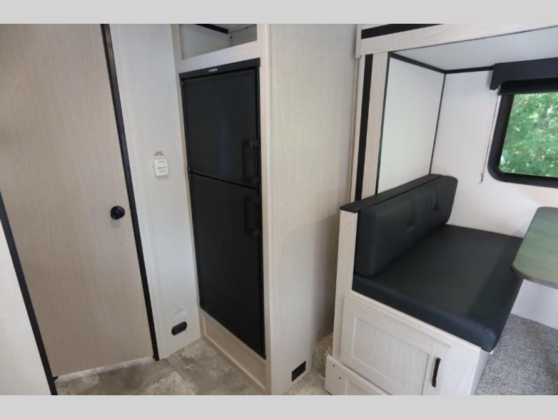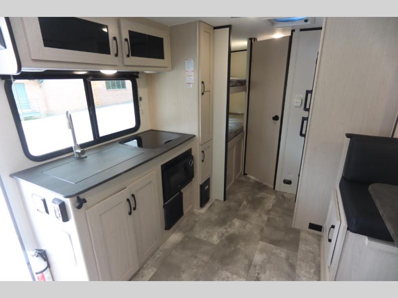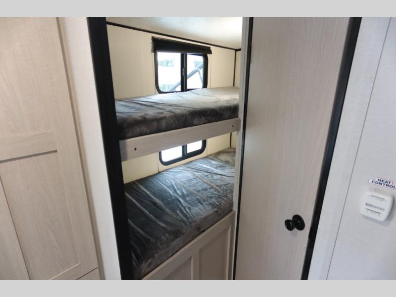 You will have more walking around space with a booth dinette slide in this travel trailer! The chef will love cooking indoors with the two burner cooktop, microwave, and 6 cu. ft. gas/electric refrigerator, as well as outdoors with the exterior camp kitchen. Start each morning feeling clean and refreshed after sleeping on the front queen bed with a headboard and showering in the tub/shower inside the rear corner bathroom, plus the bathroom has a wardrobe to keep your towels close. The kids will love sleeping on the rear corner set of 30" x 74" bunk beds too!
