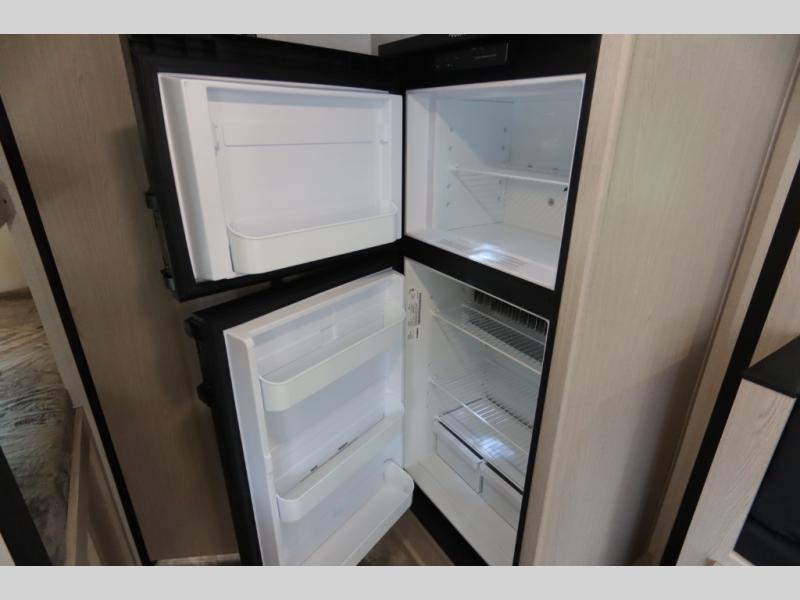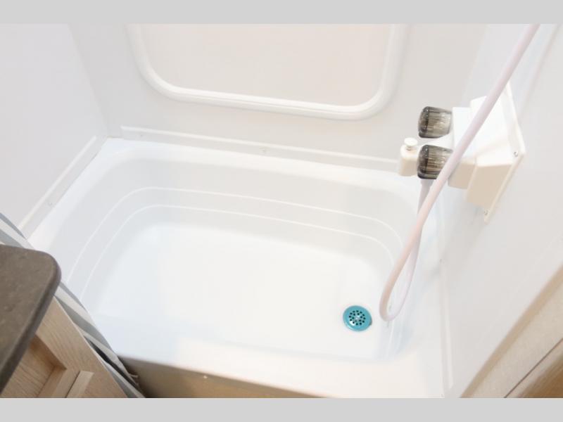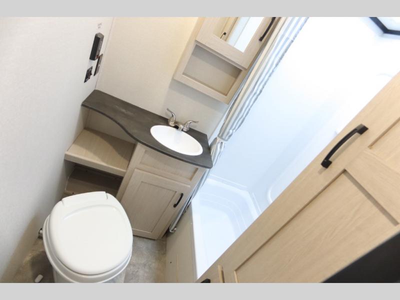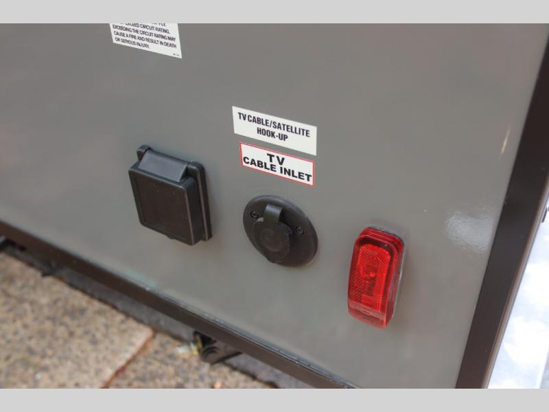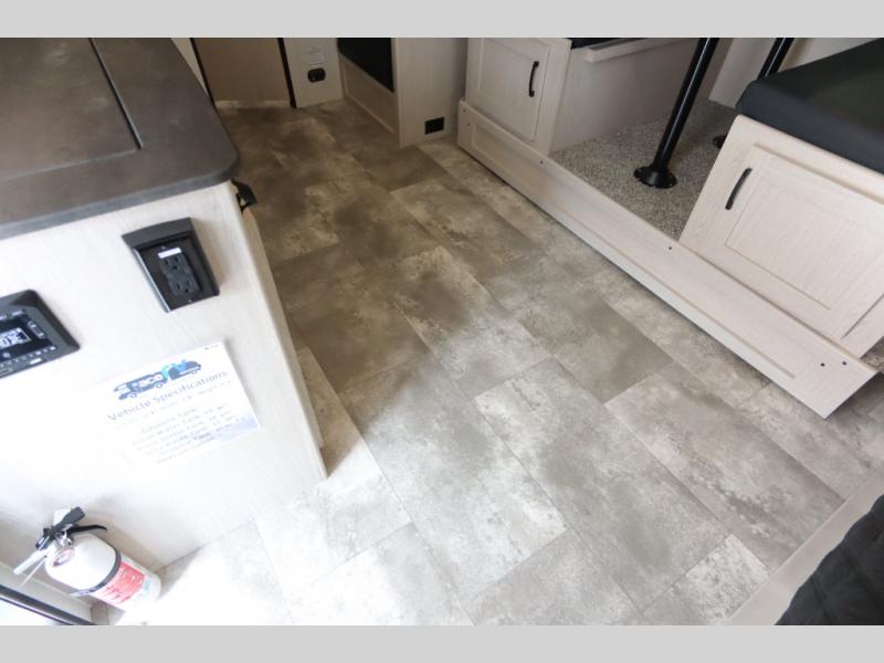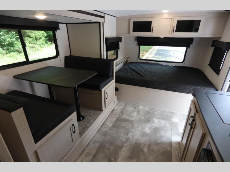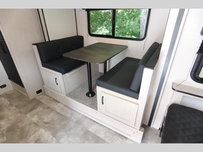 You will have more walking around space with a booth dinette slide in this travel trailer! The chef will love cooking indoors with the two burner cooktop, microwave, and 6 cu. ft. gas/electric refrigerator, as well as outdoors with the exterior camp kitchen. Start each morning feeling clean and refreshed after sleeping on the front queen bed with a headboard and showering in the tub/shower inside the rear corner bathroom, plus the bathroom has a wardrobe to keep your towels close. The kids will love sleeping on the rear corner set of 30" x 74" bunk beds too!