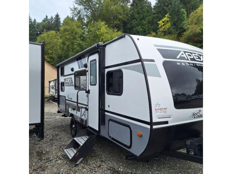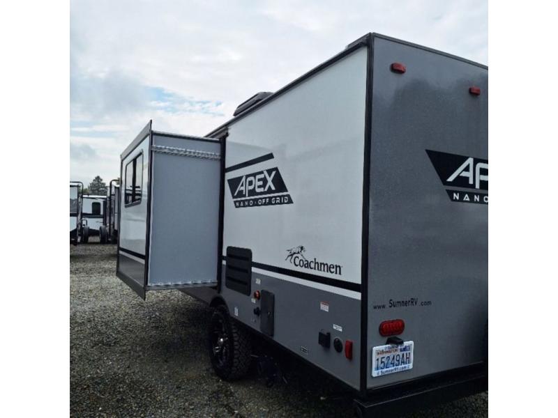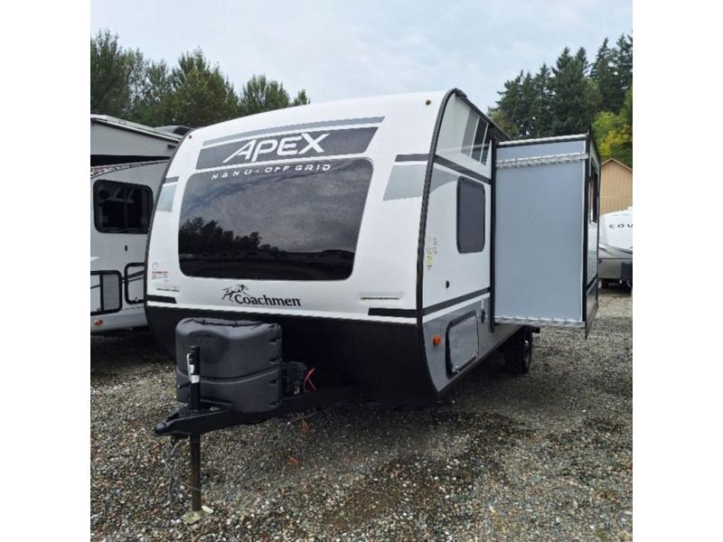 You will find comfort, convenience, and a sturdy construction with each of these Coachmen RV Apex Nano travel trailers! They are held together with an aluma-cage construction, vacuum-bonded Azdel fiberglass walls, an I-beam chassis, and a roof membrane with Dicor Crossflex, plus the powder coated frame is corrosion resistant. The Dexter E-Z lube axles and nitrogen filled radial tires will help you arrive safely. The mandatory Nano package comes with many features to make camp life better like magnetic baggage door catches, outside speakers, a digital TV antenna with cable hook-ups and WiFi capability, and a hot/cold outside shower to keep the dirt outside where it belongs. Come find the perfect model that fits your needs today!