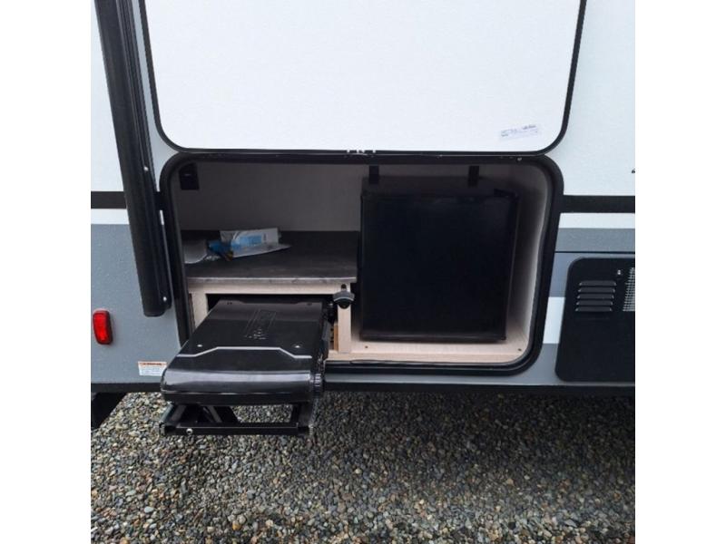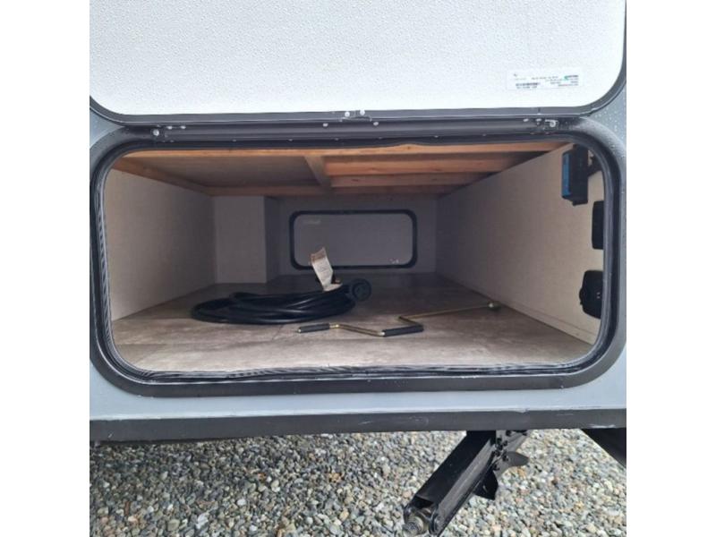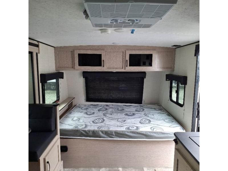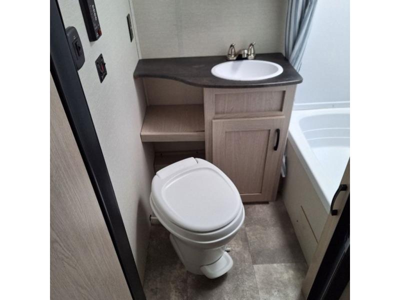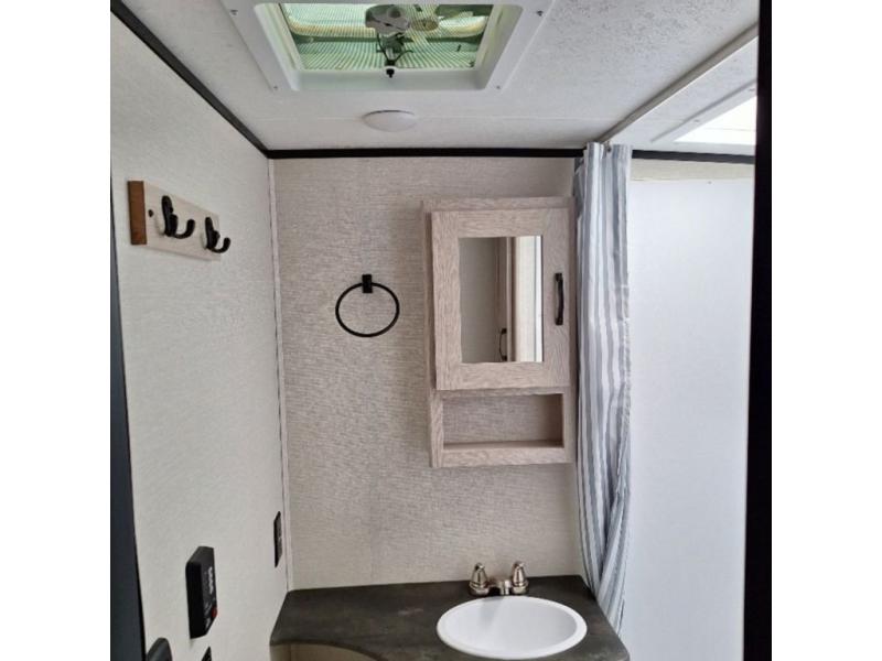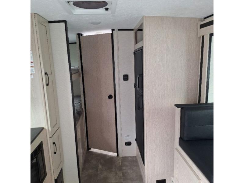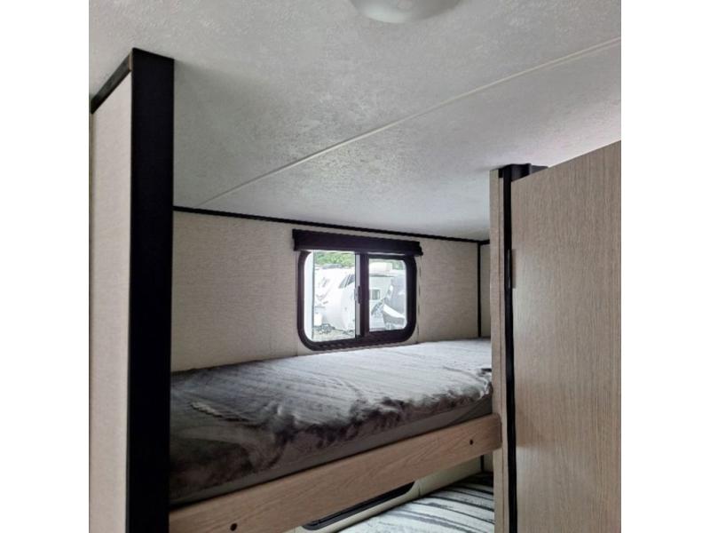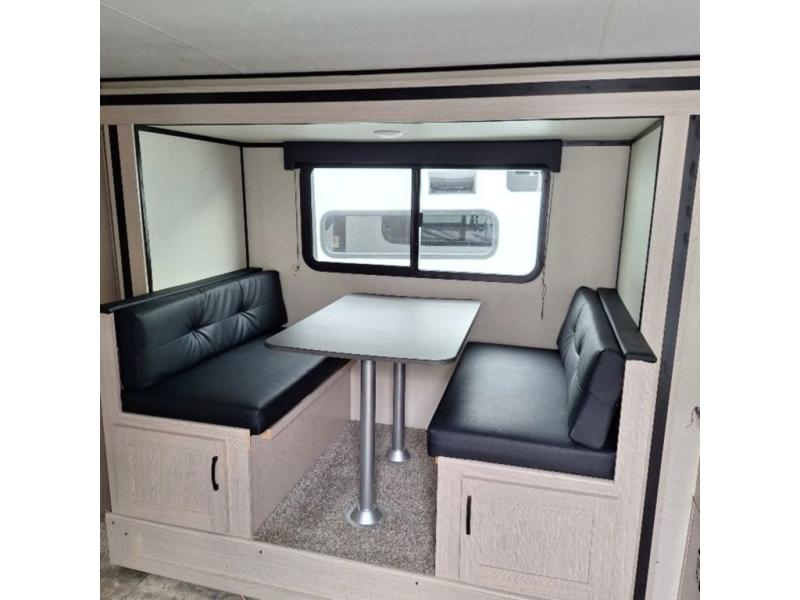 You will have more walking around space with a booth dinette slide in this travel trailer! The chef will love cooking indoors with the two burner cooktop, microwave, and 6 cu. ft. gas/electric refrigerator, as well as outdoors with the exterior camp kitchen. Start each morning feeling clean and refreshed after sleeping on the front queen bed with a headboard and showering in the tub/shower inside the rear corner bathroom, plus the bathroom has a wardrobe to keep your towels close. The kids will love sleeping on the rear corner set of 30" x 74" bunk beds too!