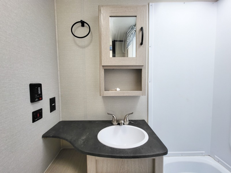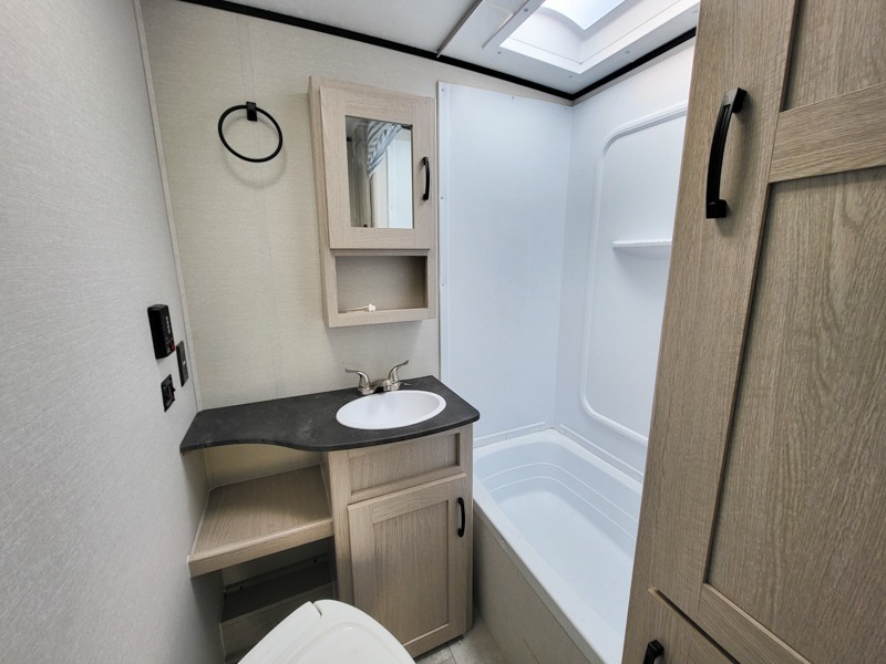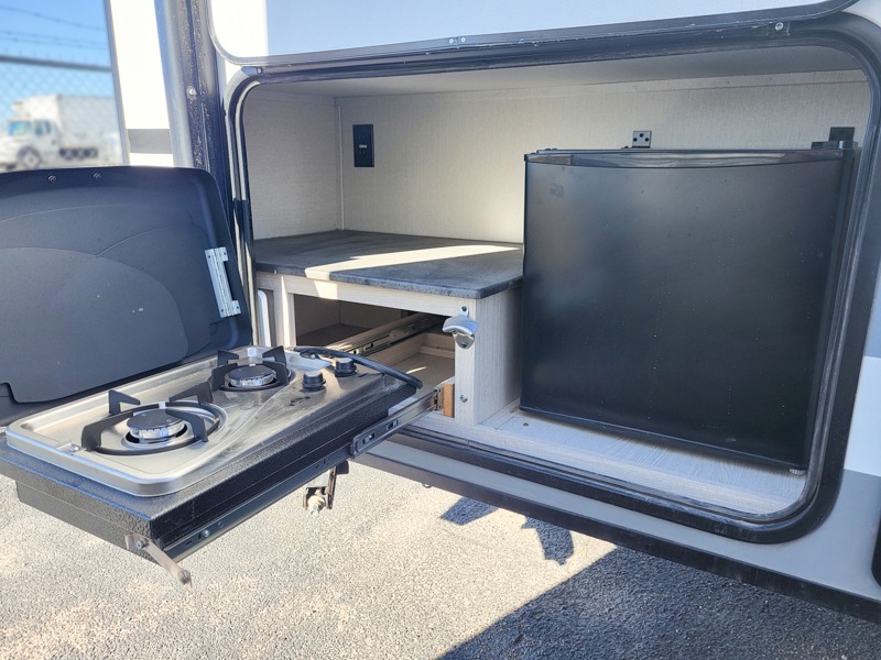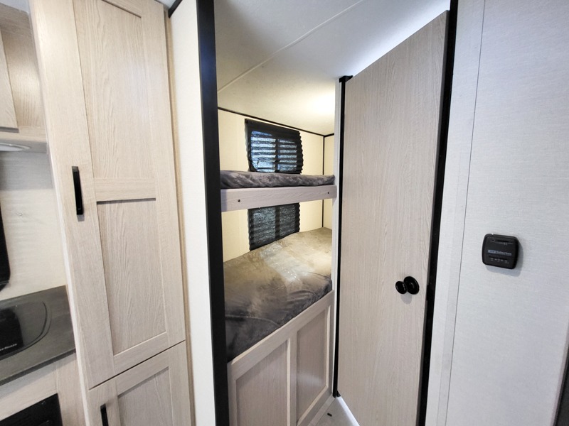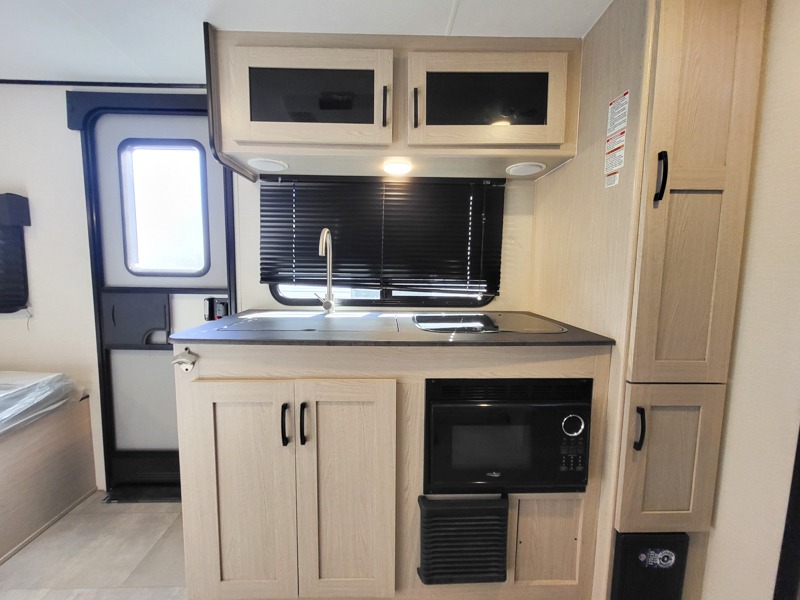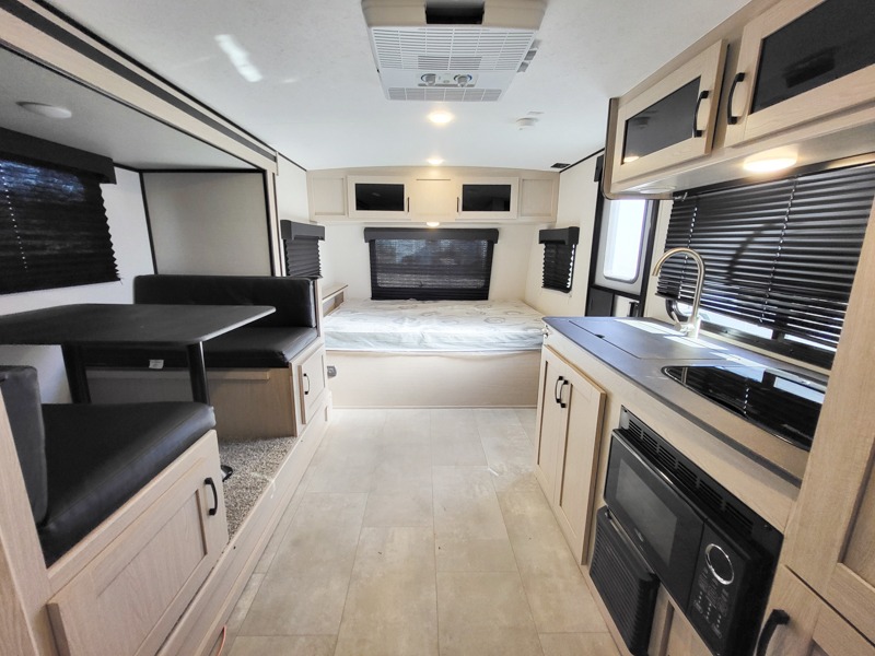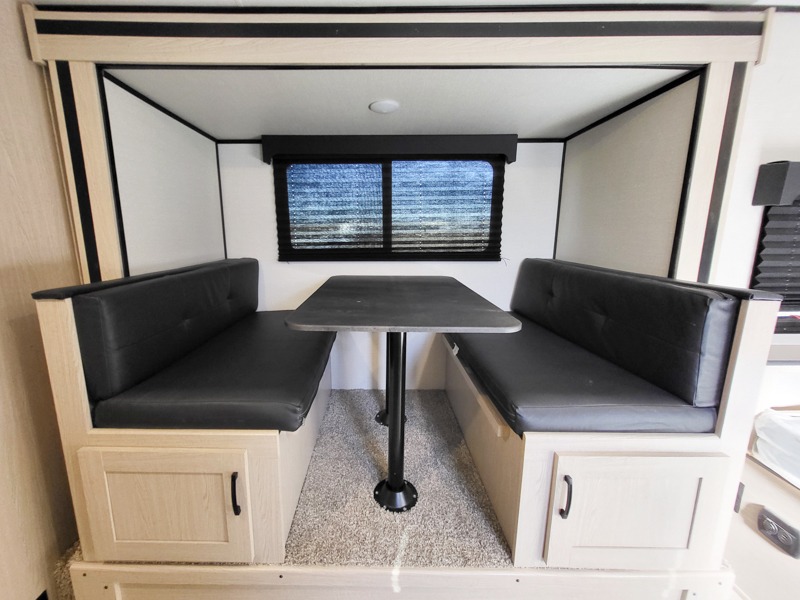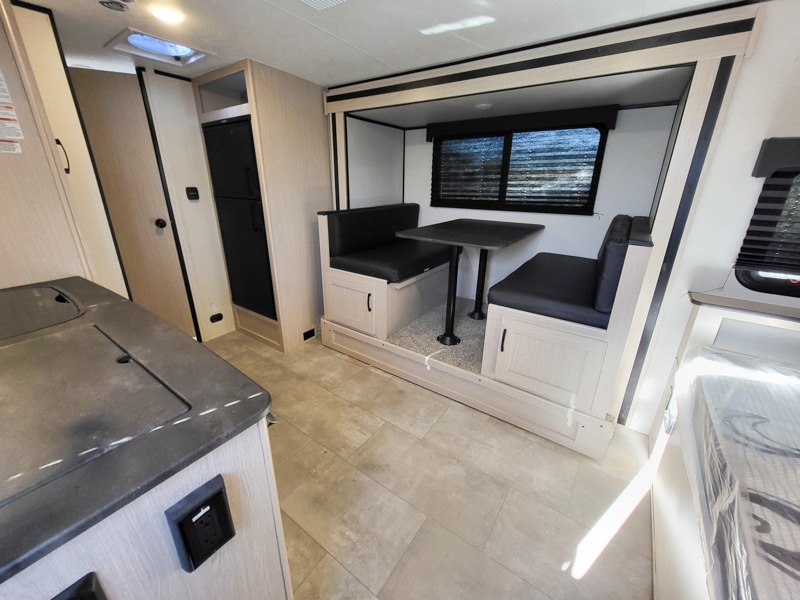 You will have more walking around space with a booth dinette slide in this travel trailer! The chef will love cooking indoors with the two burner cooktop, microwave, and 6 cu. ft. gas/electric refrigerator, as well as outdoors with the exterior camp kitchen. Start each morning feeling clean and refreshed after sleeping on the front queen bed with a headboard and showering in the tub/shower inside the rear corner bathroom, plus the bathroom has a wardrobe to keep your towels close. The kids will love sleeping on the rear corner set of 30" x 74" bunk beds too!