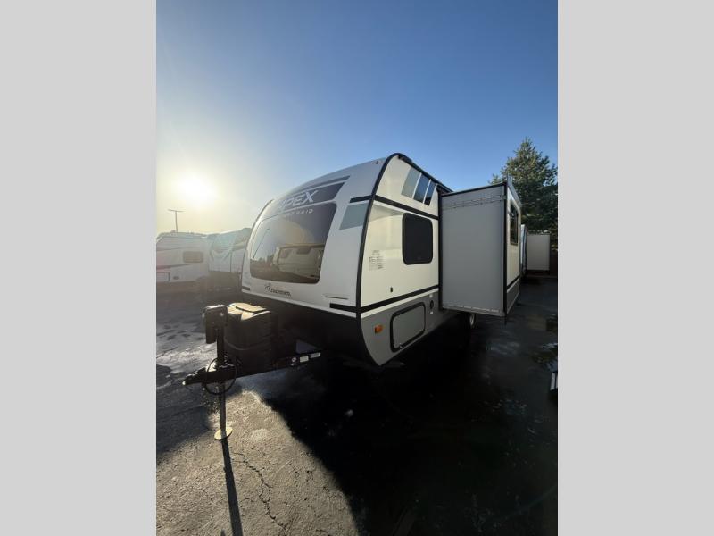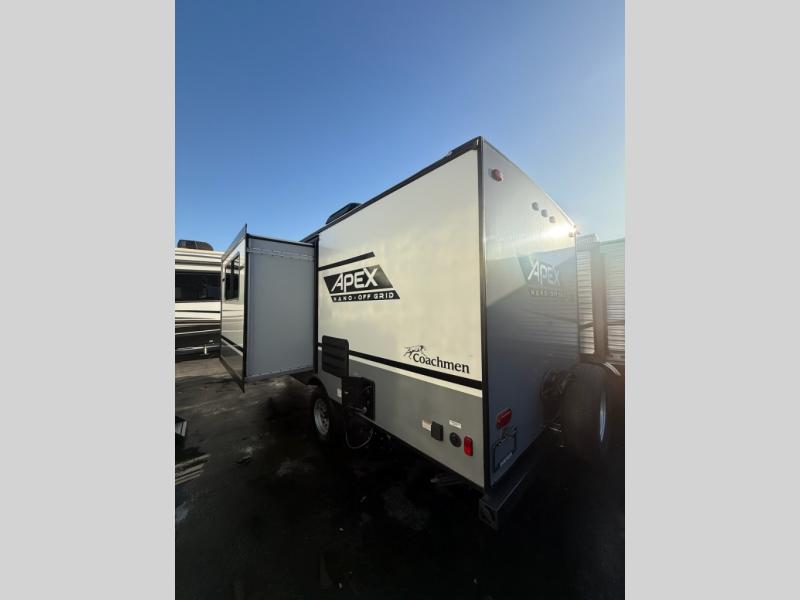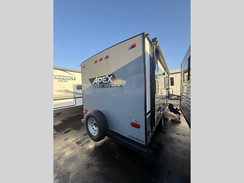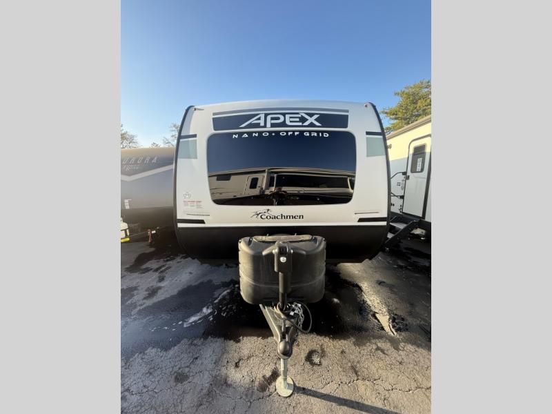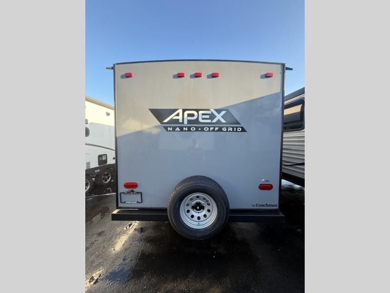 You will find comfort, convenience, and a sturdy construction with each of these Coachmen RV Apex Nano travel trailers! They are held together with an aluma-cage construction, vacuum-bonded Azdel fiberglass walls, an I-beam chassis, and a roof membrane with Dicor Crossflex, plus the powder coated frame is corrosion resistant. The Dexter E-Z lube axles and nitrogen filled radial tires will help you arrive safely. The mandatory Nano package comes with many features to make camp life better like magnetic baggage door catches, outside speakers, a digital TV antenna with cable hook-ups and WiFi capability, and a hot/cold outside shower to keep the dirt outside where it belongs. Come find the perfect model that fits your needs today!