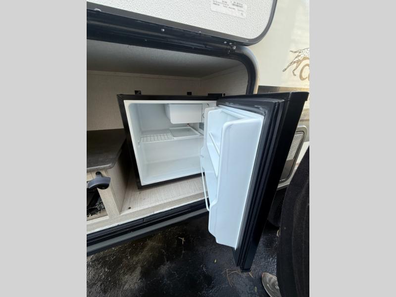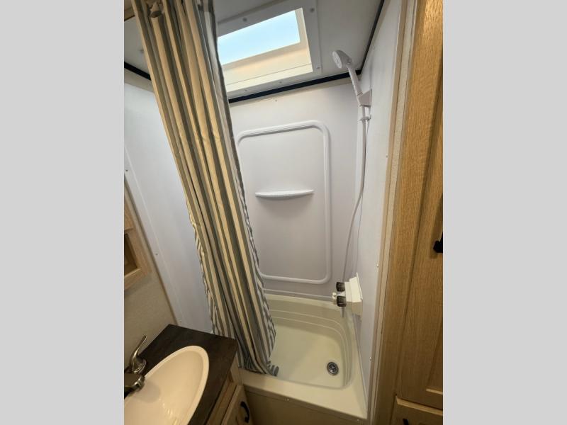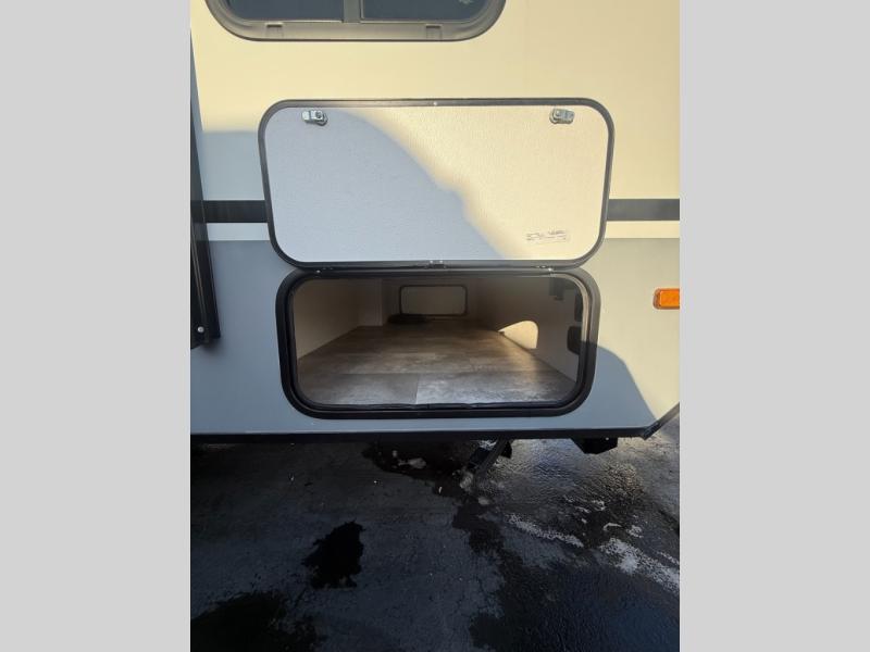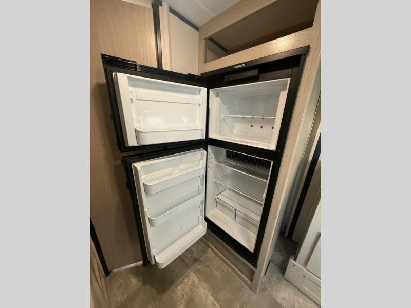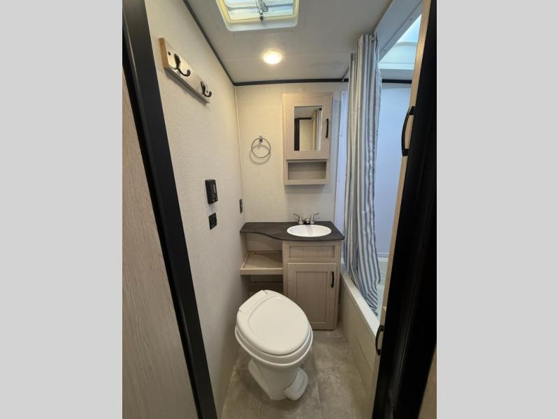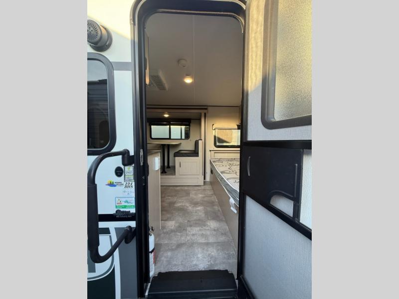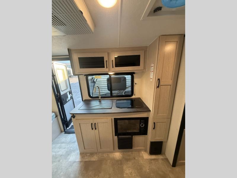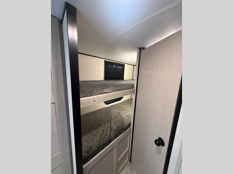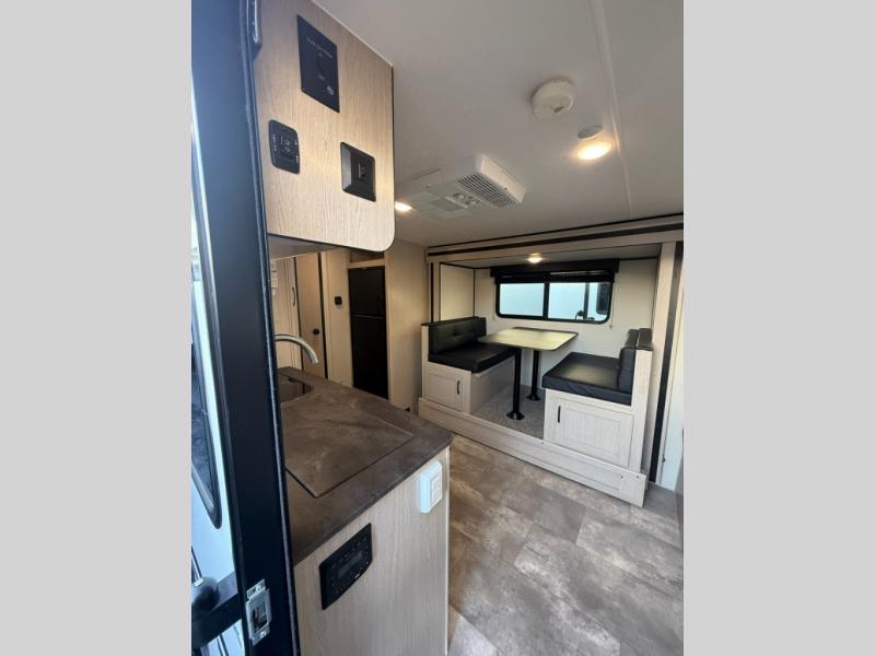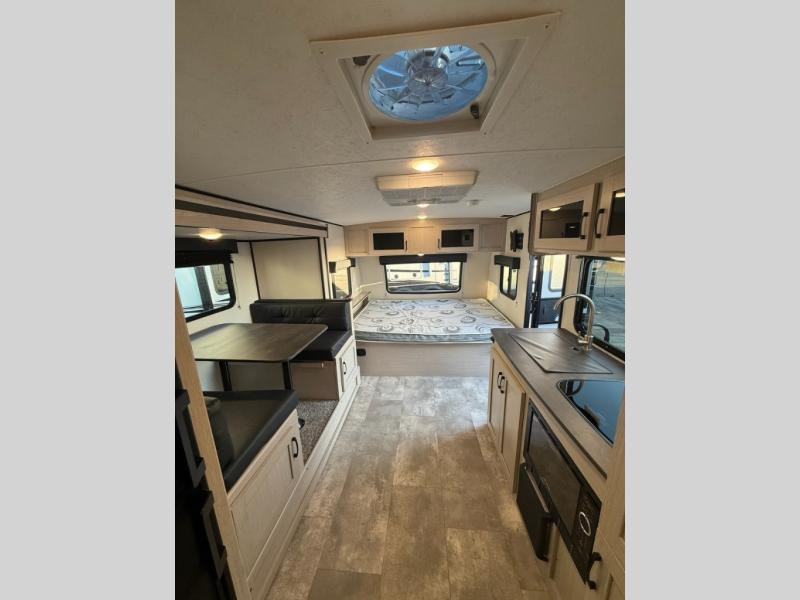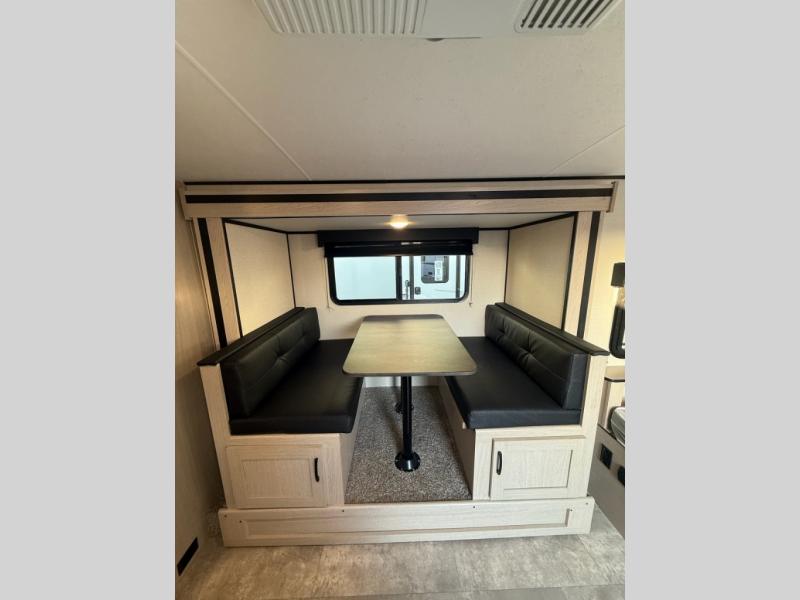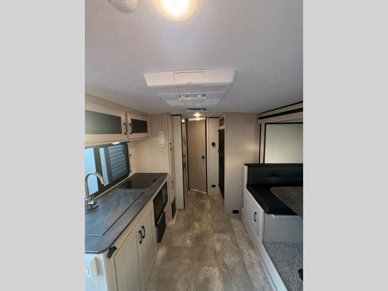 You will have more walking around space with a booth dinette slide in this travel trailer! The chef will love cooking indoors with the two burner cooktop, microwave, and 6 cu. ft. gas/electric refrigerator, as well as outdoors with the exterior camp kitchen. Start each morning feeling clean and refreshed after sleeping on the front queen bed with a headboard and showering in the tub/shower inside the rear corner bathroom, plus the bathroom has a wardrobe to keep your towels close. The kids will love sleeping on the rear corner set of 30" x 74" bunk beds too!