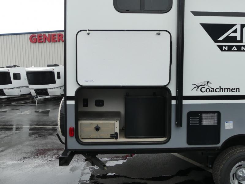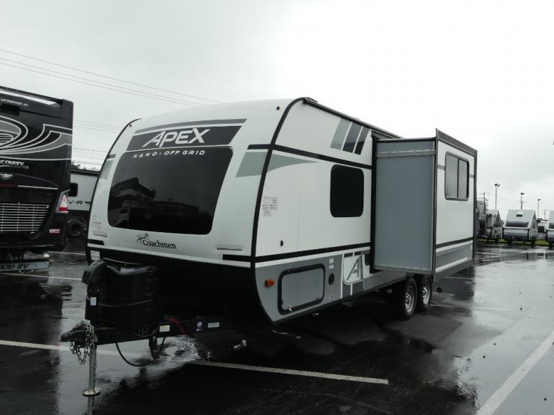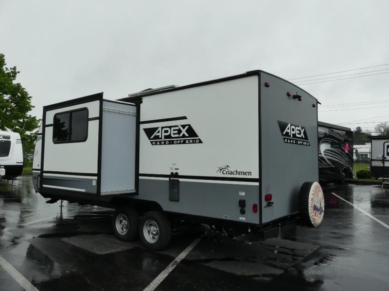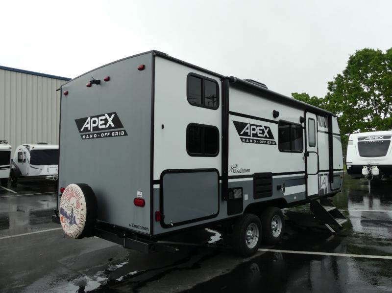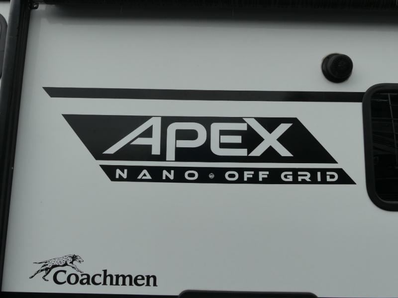 You will find comfort, convenience, and a sturdy construction with each of these Coachmen RV Apex Nano travel trailers! They are held together with an aluma-cage construction, vacuum-bonded Azdel fiberglass walls, an I-beam chassis, and a roof membrane with Dicor Crossflex, plus the powder coated frame is corrosion resistant. The Dexter E-Z lube axles and nitrogen filled radial tires will help you arrive safely. The mandatory Nano package comes with many features to make camp life better like magnetic baggage door catches, outside speakers, a digital TV antenna with cable hook-ups and WiFi capability, and a hot/cold outside shower to keep the dirt outside where it belongs. Come find the perfect model that fits your needs today!