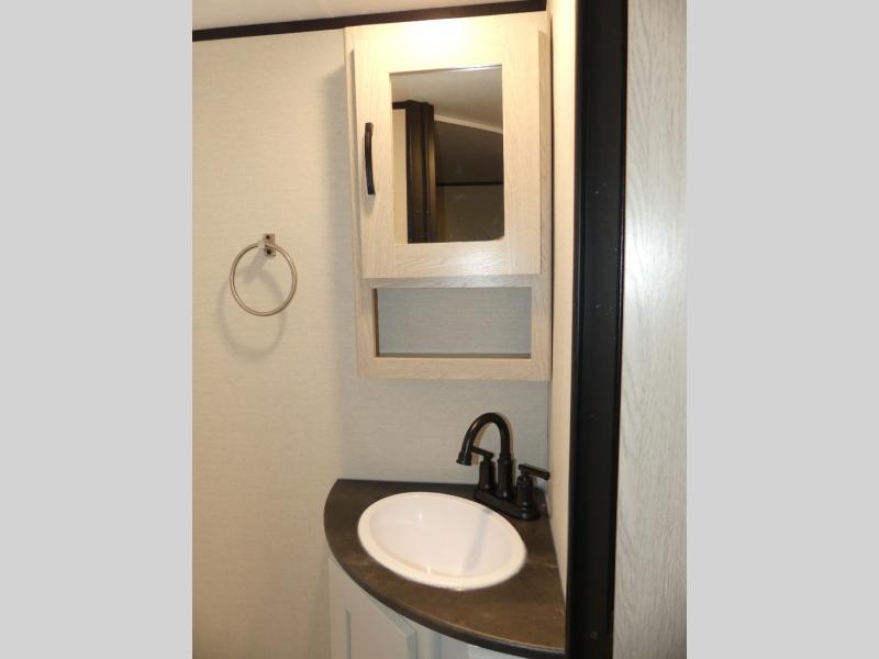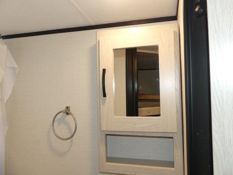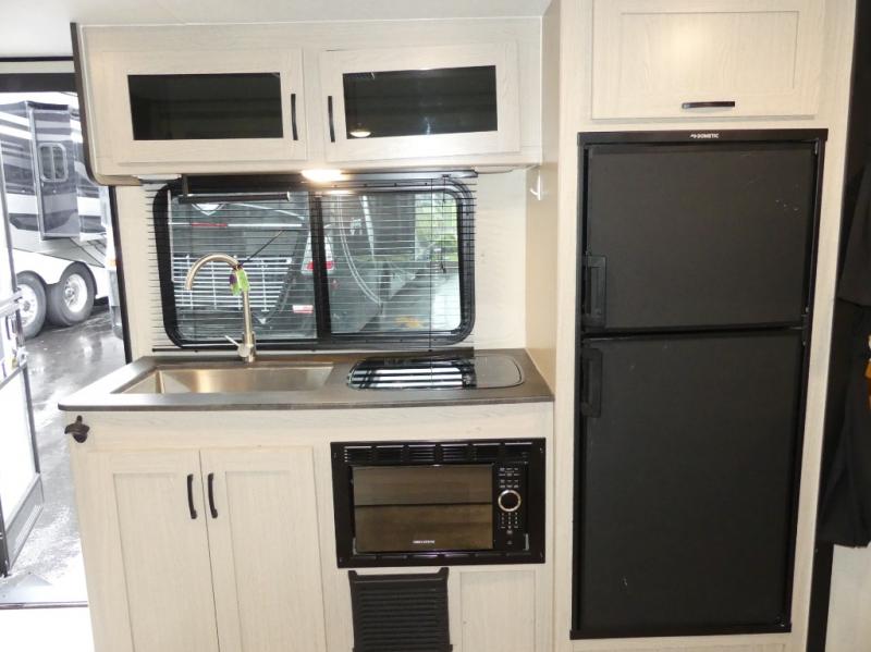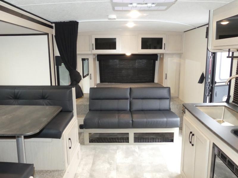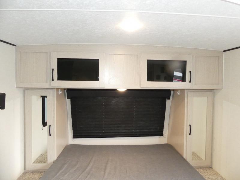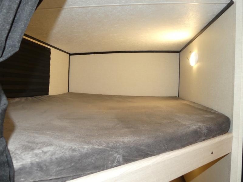 You and a few friends or family members can camp comfortably in this travel trailer! It features a front queen bed with wardrobes on either side to keep your clothes out of the way. Two others can sleep on the rear corner upper double bed and lower flip up double bed. After you have fried up some eggs on the two burner cooktop and heated up a piece of banana bread in the microwave, you can head to the booth dinette slide to enjoy it. There is even a pantry to store your coffee grounds and snacks. Now that your bellies are full, you can freshen up in the rear corner bathroom with the tub/shower.