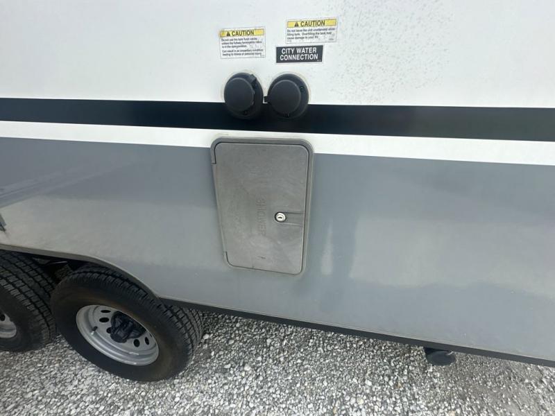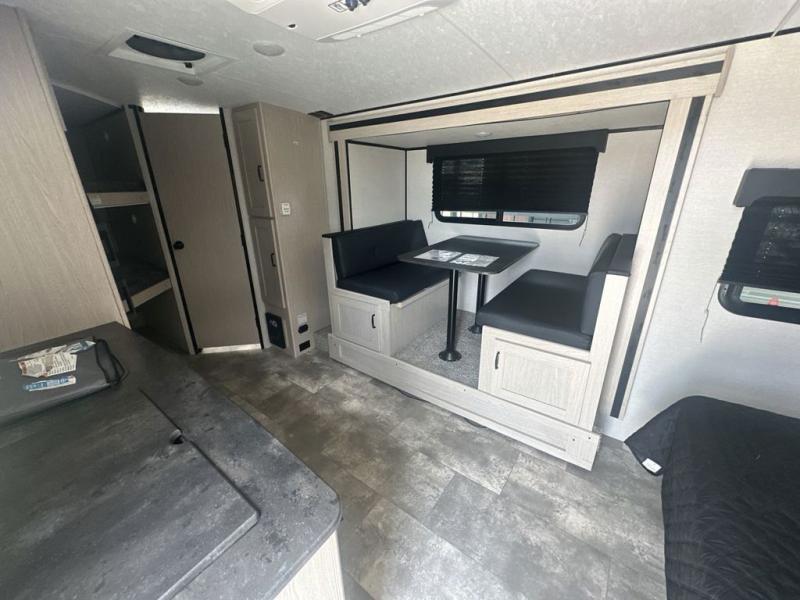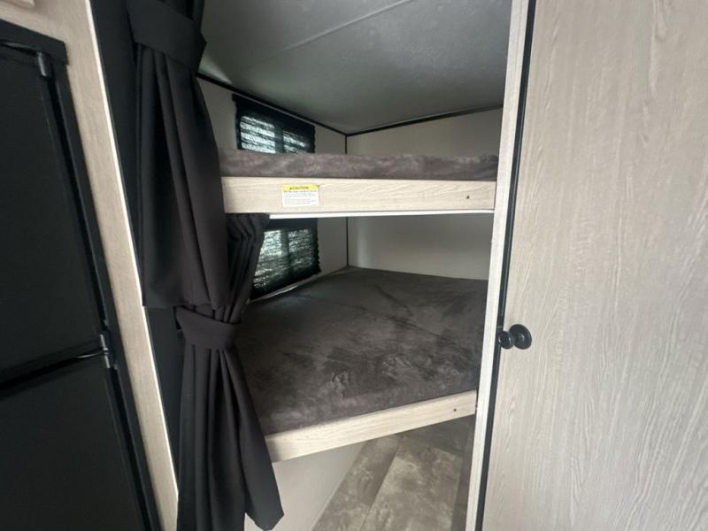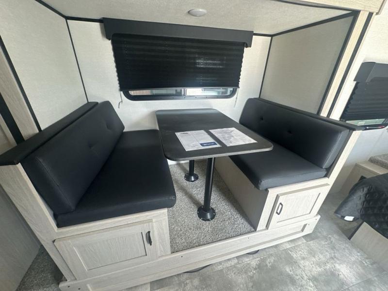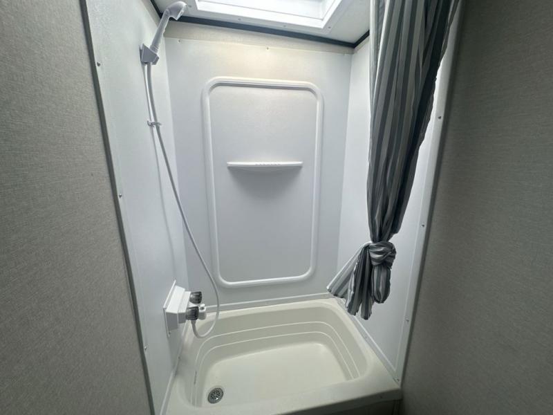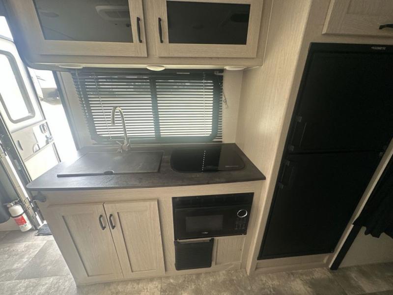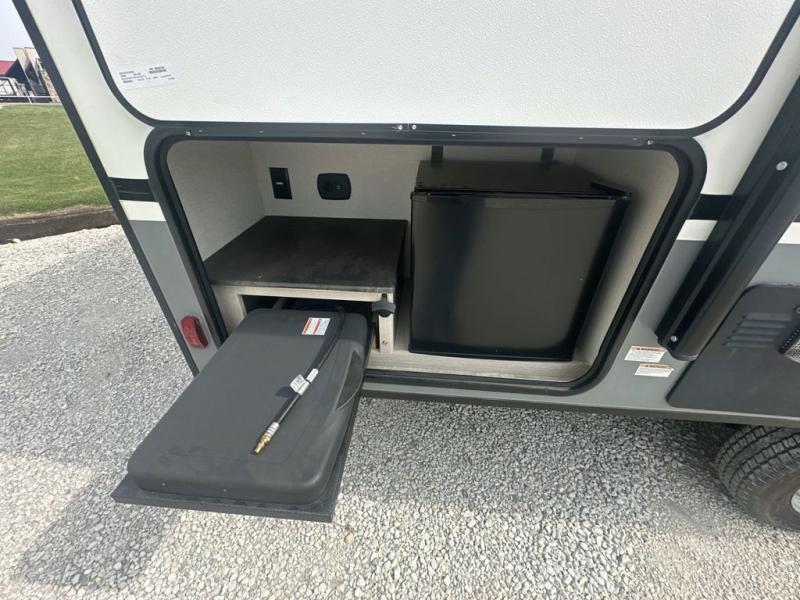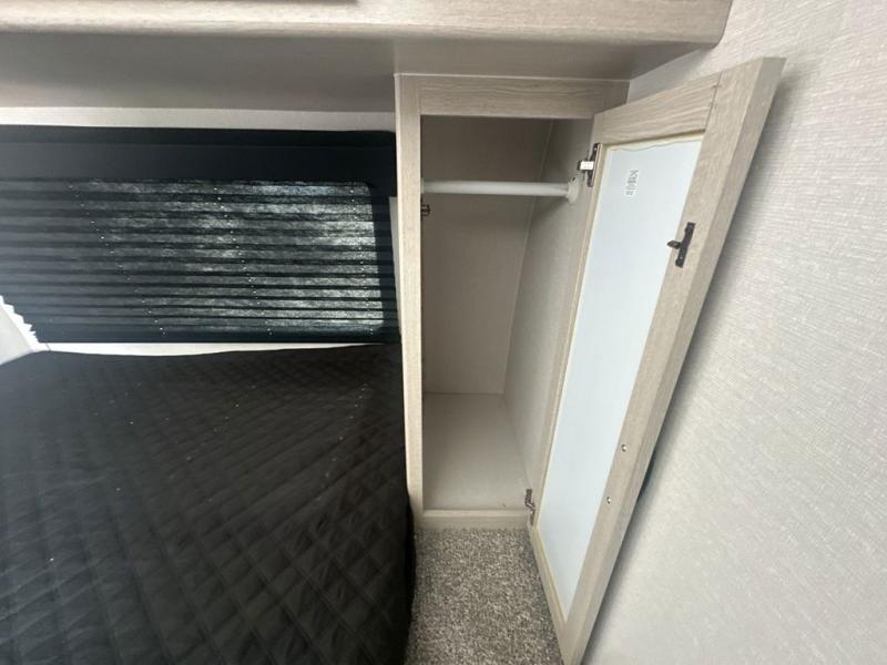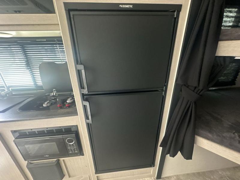 You and a few friends or family members can camp comfortably in this travel trailer! It features a front queen bed with wardrobes on either side to keep your clothes out of the way or you can switch it out for the optional Murphy bed for more versatility. Two others can sleep on the rear corner upper double bed and lower flip up double bed. After you have fried up some eggs on the two burner cooktop and heated up a piece of banana bread in the microwave, you can head to the booth dinette slide to enjoy it. There is even a pantry to store your coffee grounds and snacks. Now that your bellies are full, you can freshen up in the rear corner bathroom with the tub/shower.