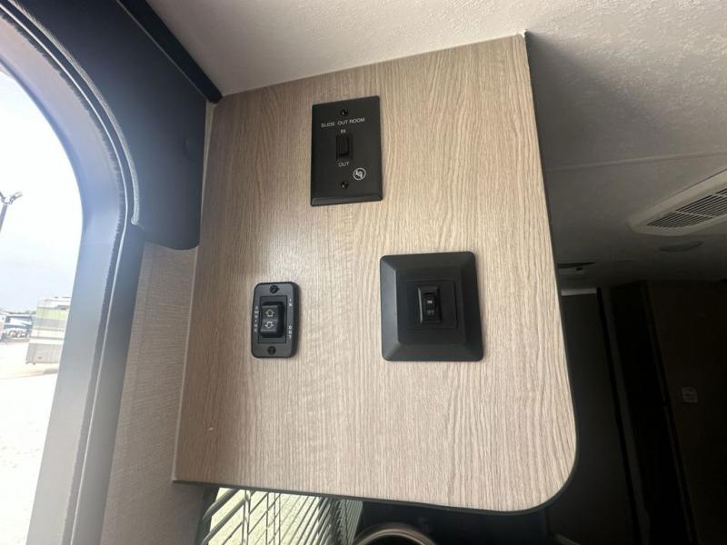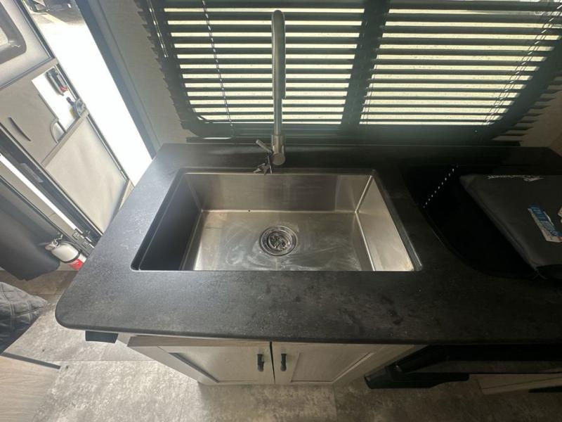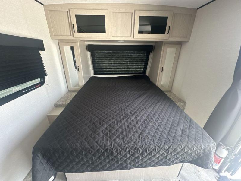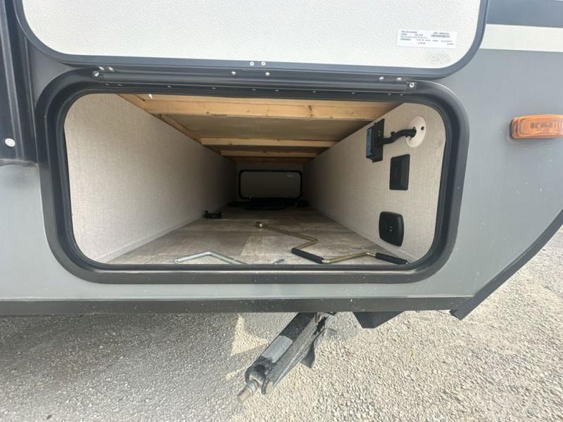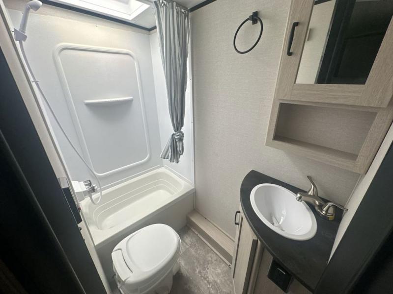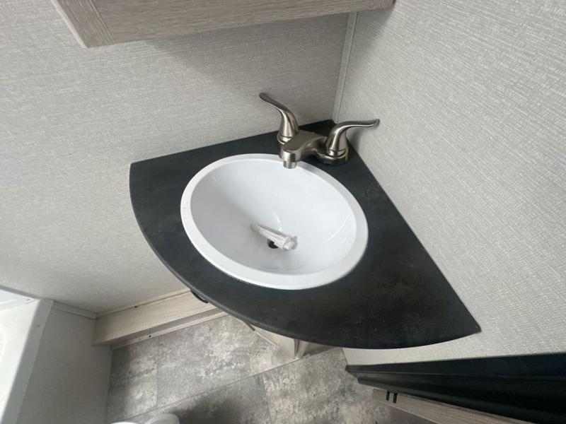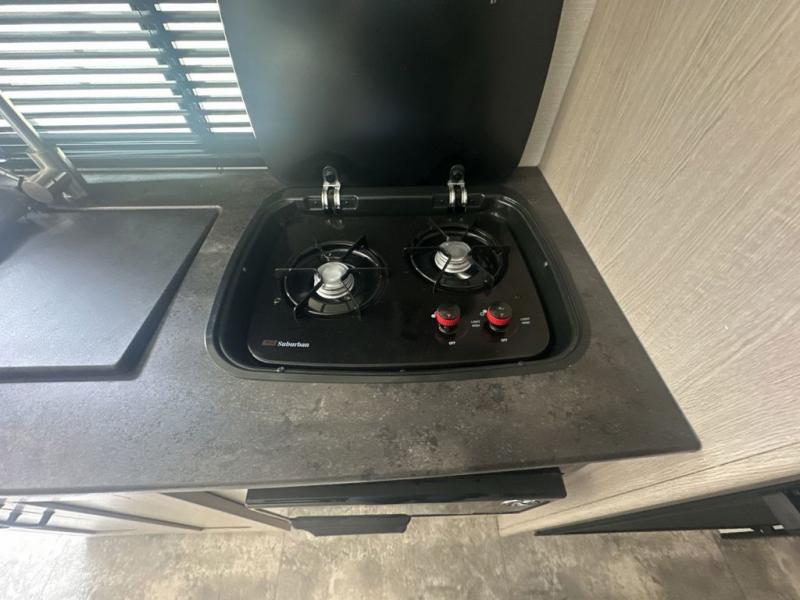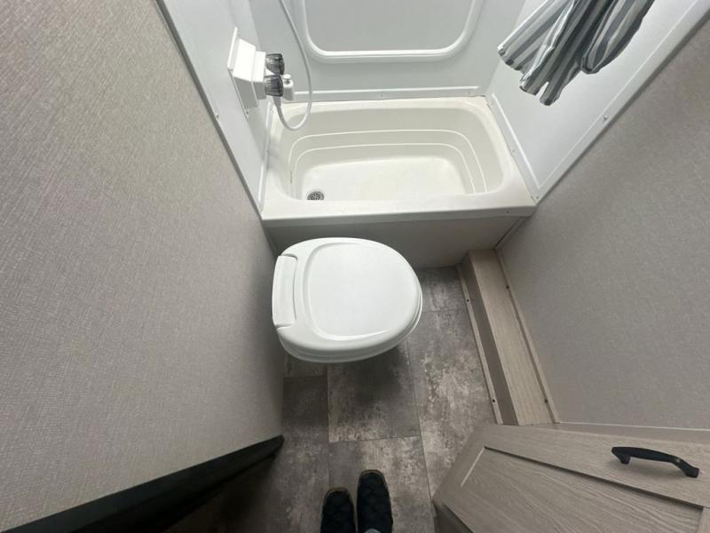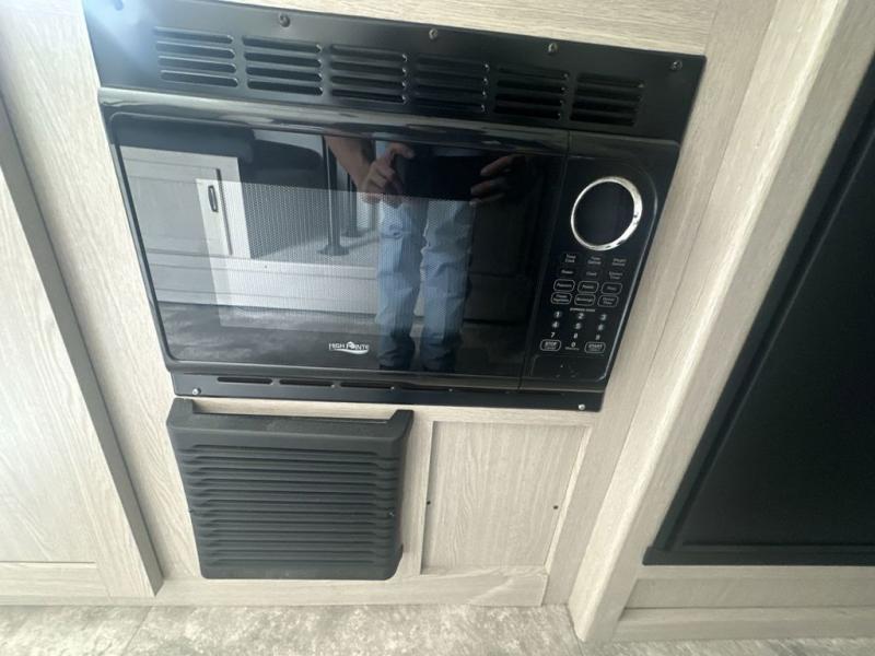 You and a few friends or family members can camp comfortably in this travel trailer! It features a front queen bed with wardrobes on either side to keep your clothes out of the way or you can switch it out for the optional Murphy bed for more versatility. Two others can sleep on the rear corner upper double bed and lower flip up double bed. After you have fried up some eggs on the two burner cooktop and heated up a piece of banana bread in the microwave, you can head to the booth dinette slide to enjoy it. There is even a pantry to store your coffee grounds and snacks. Now that your bellies are full, you can freshen up in the rear corner bathroom with the tub/shower.