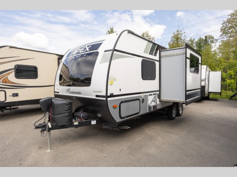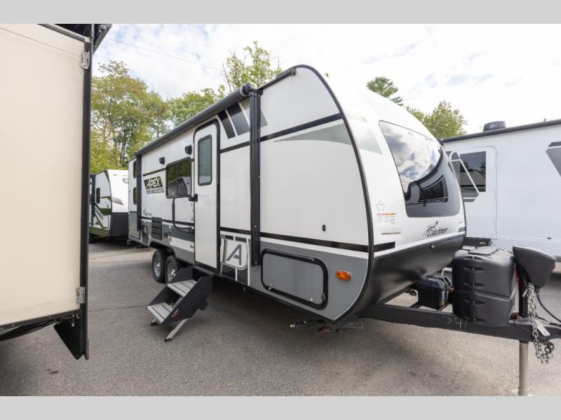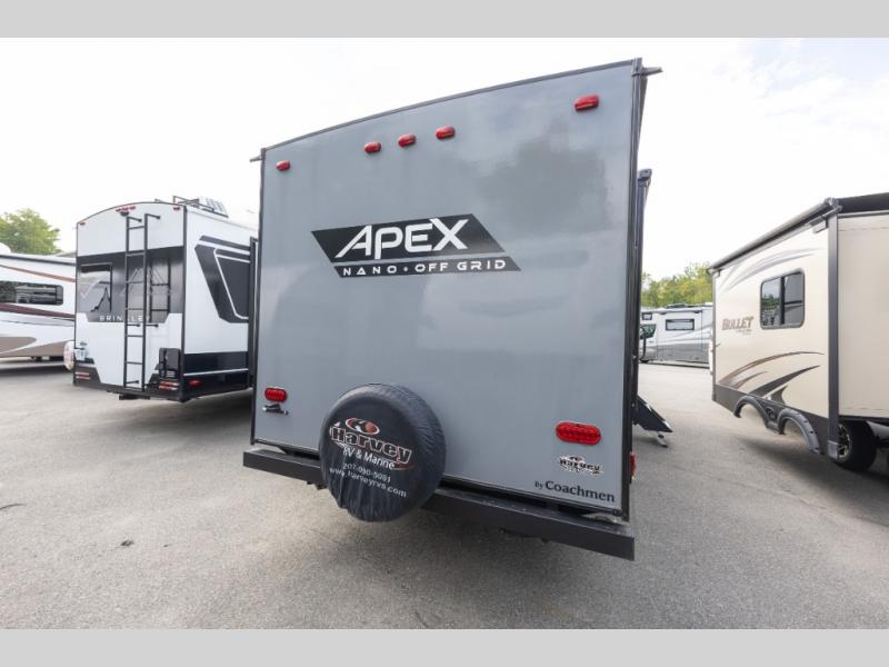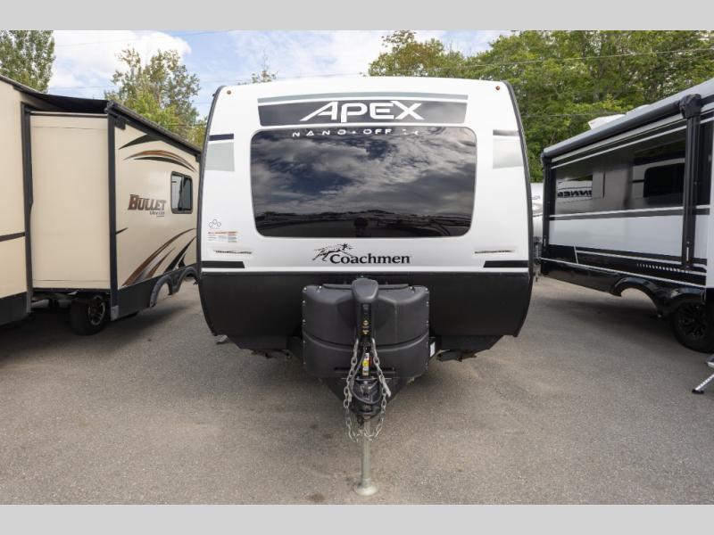 You will find comfort, convenience, and a sturdy construction with each of these Coachmen RV Apex Nano travel trailers! They are held together with an aluma-cage construction, vacuum-bonded Azdel fiberglass walls, an I-beam chassis, and a roof membrane with Dicor Crossflex, plus the powder coated frame is corrosion resistant. The Dexter E-Z lube axles and nitrogen filled radial tires will help you arrive safely. The mandatory Nano package comes with many features to make camp life better like magnetic baggage door catches, outside speakers, a digital TV antenna with cable hook-ups and WiFi capability, and a hot/cold outside shower to keep the dirt outside where it belongs. Come find the perfect model that fits your needs today!