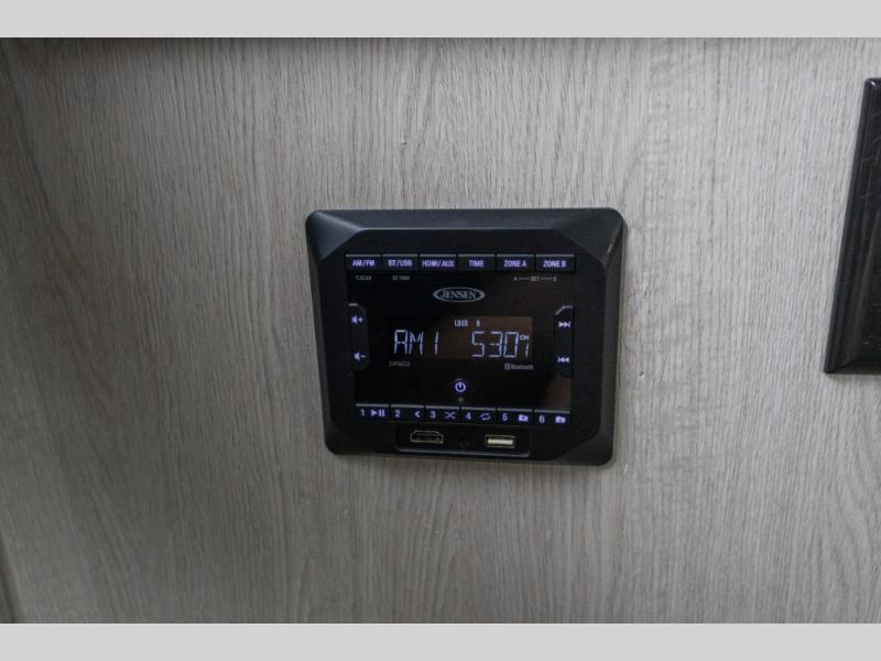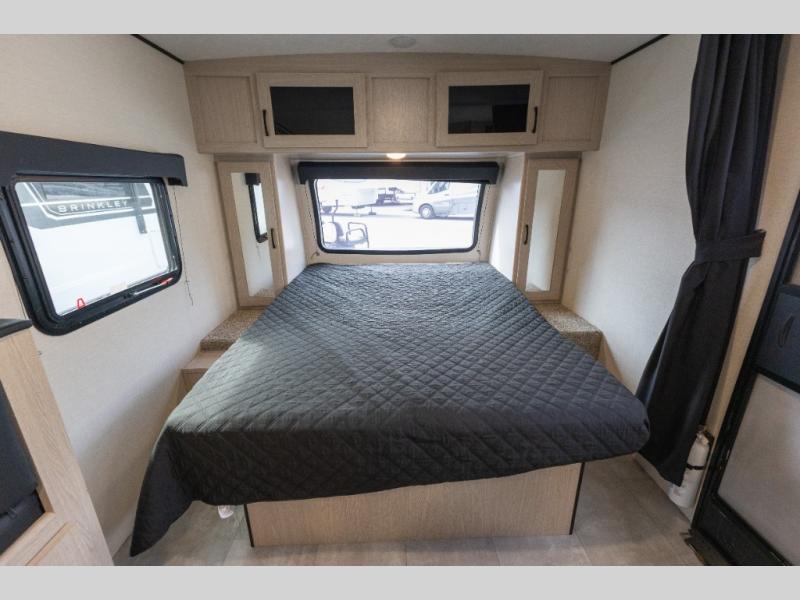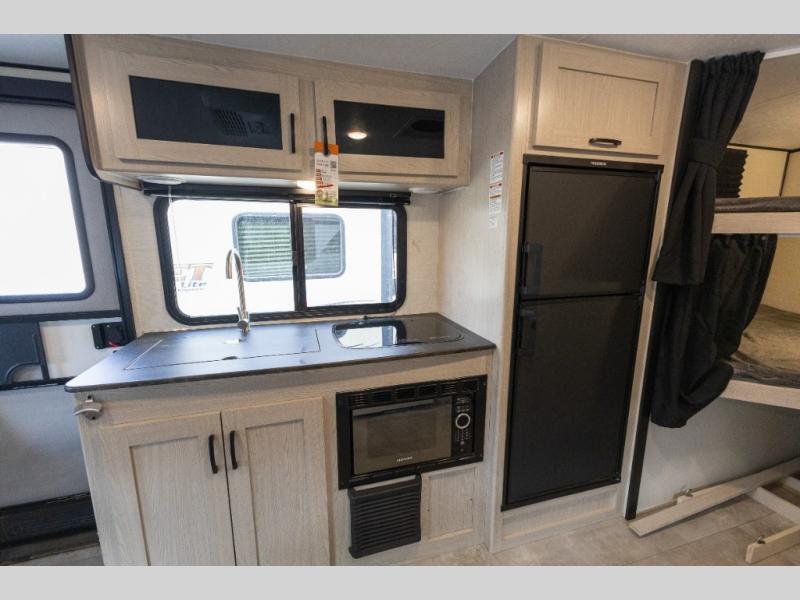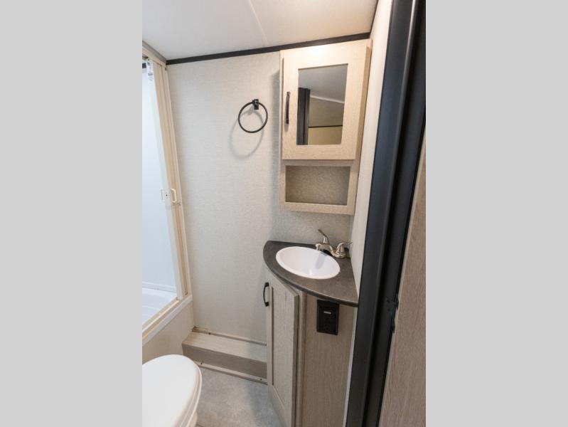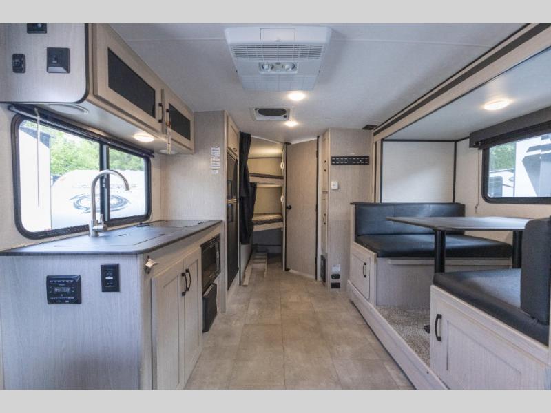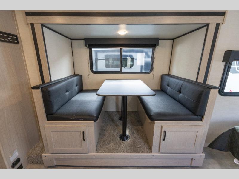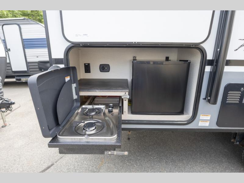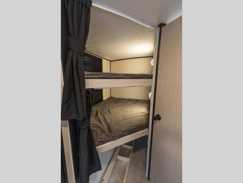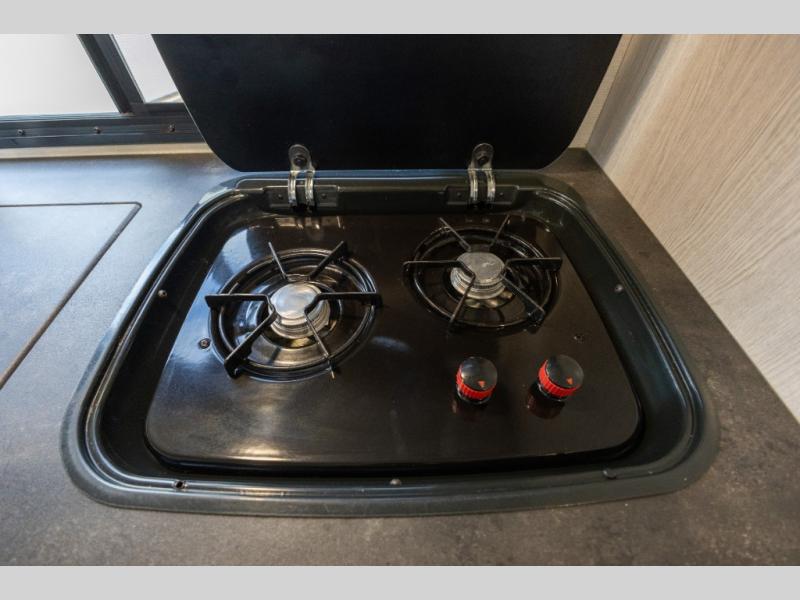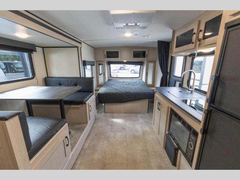 You and a few friends or family members can camp comfortably in this travel trailer! It features a front queen bed with wardrobes on either side to keep your clothes out of the way or you can switch it out for the optional Murphy bed for more versatility. Two others can sleep on the rear corner upper double bed and lower flip up double bed. After you have fried up some eggs on the two burner cooktop and heated up a piece of banana bread in the microwave, you can head to the booth dinette slide to enjoy it. There is even a pantry to store your coffee grounds and snacks. Now that your bellies are full, you can freshen up in the rear corner bathroom with the tub/shower.