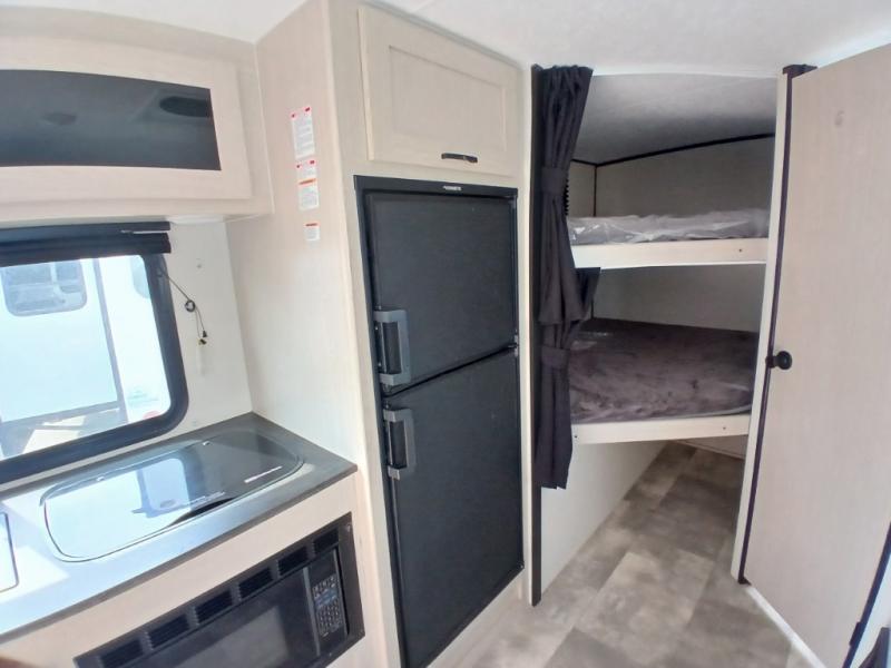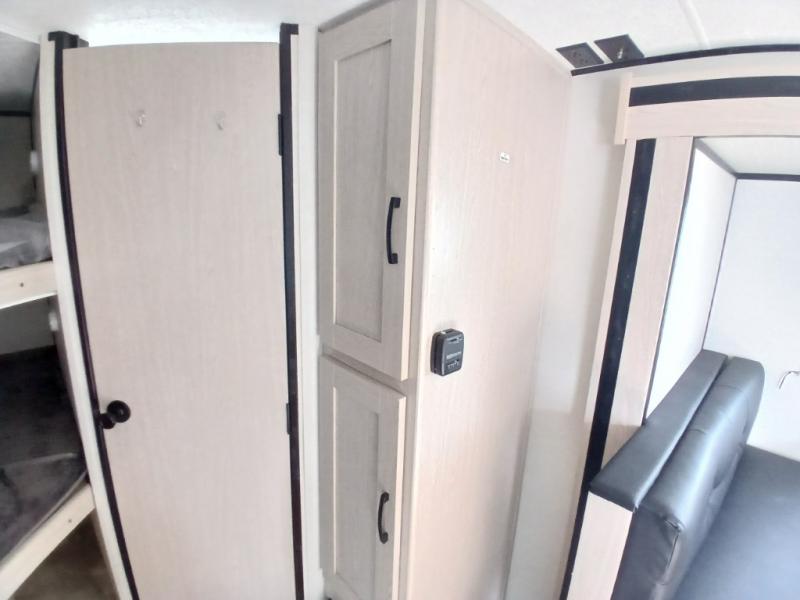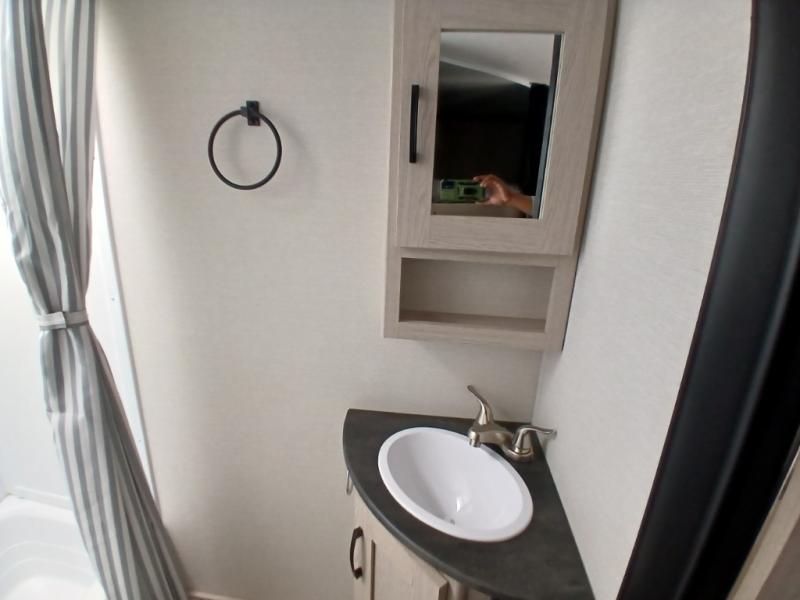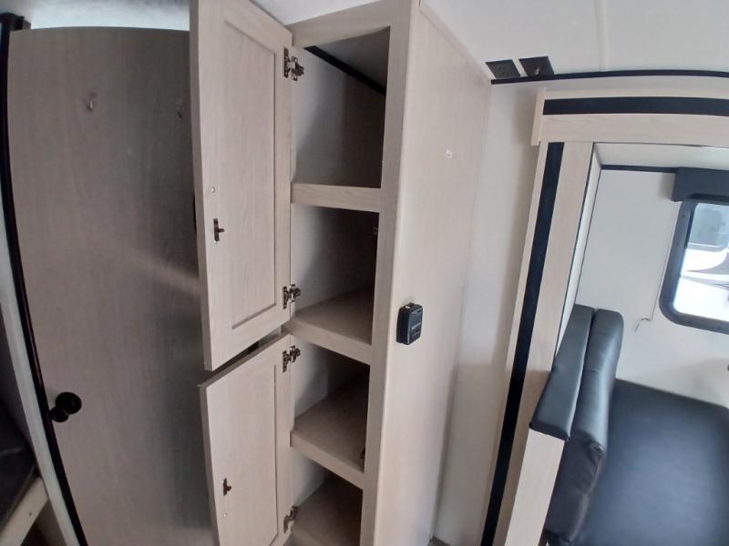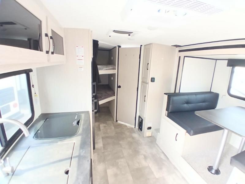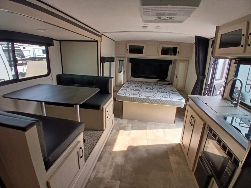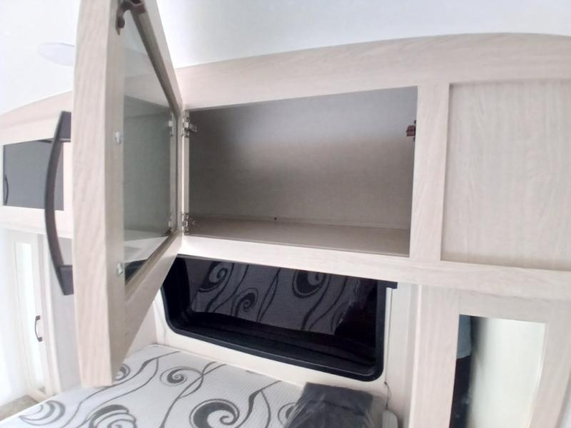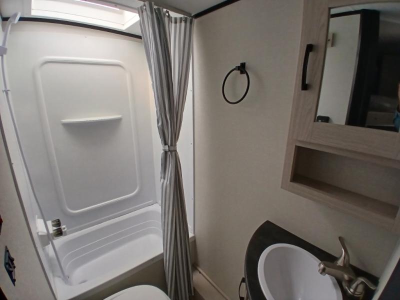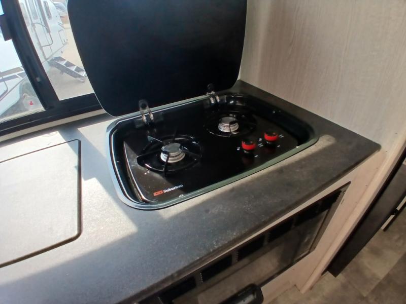 You and a few friends or family members can camp comfortably in this travel trailer! It features a front queen bed with wardrobes on either side to keep your clothes out of the way or you can switch it out for the optional Murphy bed for more versatility. Two others can sleep on the rear corner upper double bed and lower flip up double bed. After you have fried up some eggs on the two burner cooktop and heated up a piece of banana bread in the microwave, you can head to the booth dinette slide to enjoy it. There is even a pantry to store your coffee grounds and snacks. Now that your bellies are full, you can freshen up in the rear corner bathroom with the tub/shower.