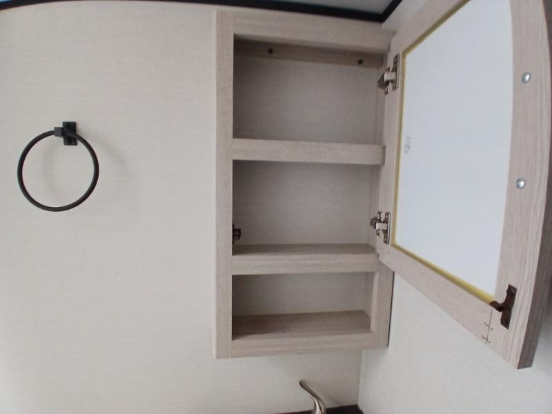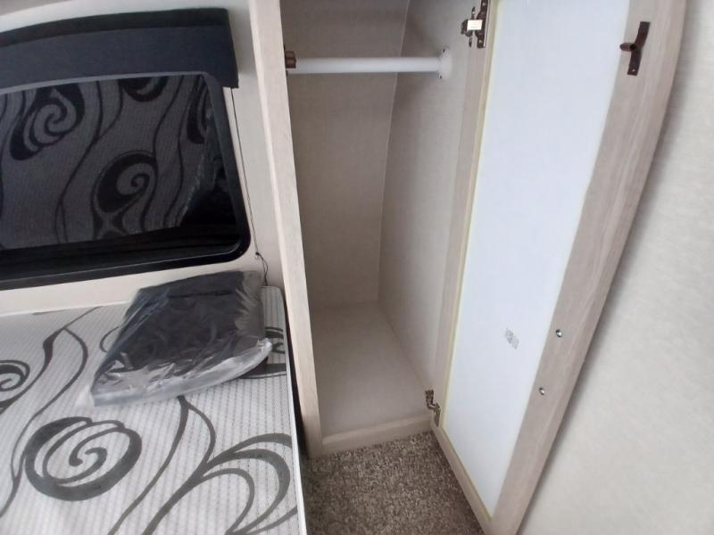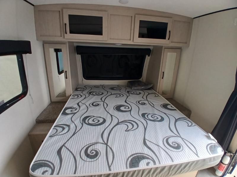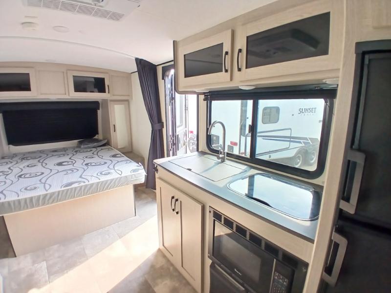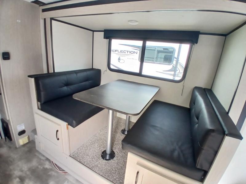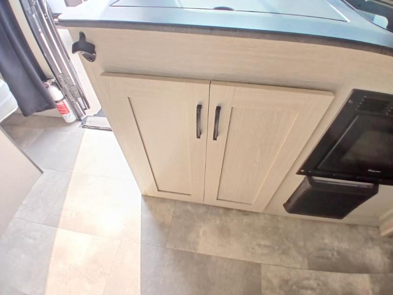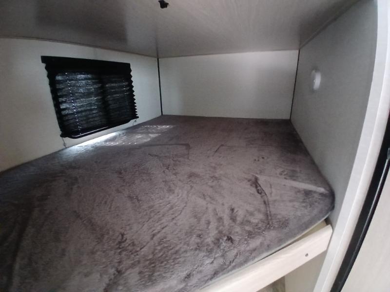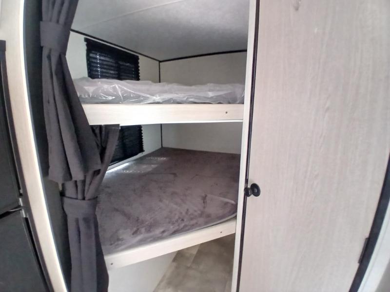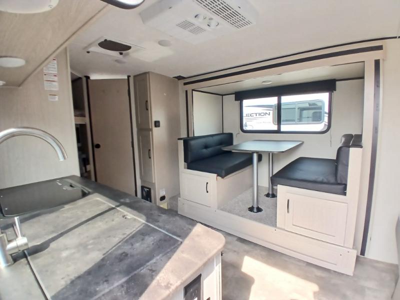 You and a few friends or family members can camp comfortably in this travel trailer! It features a front queen bed with wardrobes on either side to keep your clothes out of the way or you can switch it out for the optional Murphy bed for more versatility. Two others can sleep on the rear corner upper double bed and lower flip up double bed. After you have fried up some eggs on the two burner cooktop and heated up a piece of banana bread in the microwave, you can head to the booth dinette slide to enjoy it. There is even a pantry to store your coffee grounds and snacks. Now that your bellies are full, you can freshen up in the rear corner bathroom with the tub/shower.