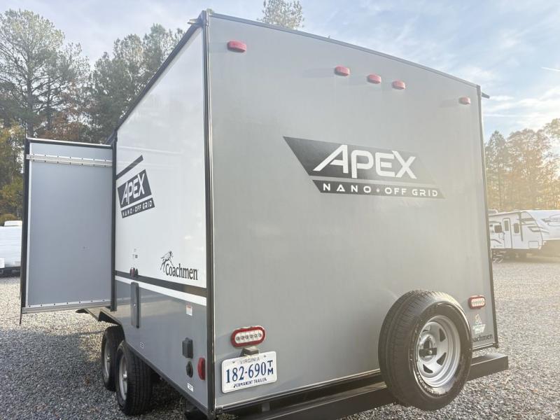 You will find comfort, convenience, and a sturdy construction with each of these Coachmen RV Apex Nano travel trailers! They are held together with an aluma-cage construction, vacuum-bonded Azdel fiberglass walls, an I-beam chassis, and a roof membrane with Dicor Crossflex, plus the powder coated frame is corrosion resistant. The Dexter E-Z lube axles and nitrogen filled radial tires will help you arrive safely. The mandatory Nano package comes with many features to make camp life better like magnetic baggage door catches, outside speakers, a digital TV antenna with cable hook-ups and WiFi capability, and a hot/cold outside shower to keep the dirt outside where it belongs. Come find the perfect model that fits your needs today!