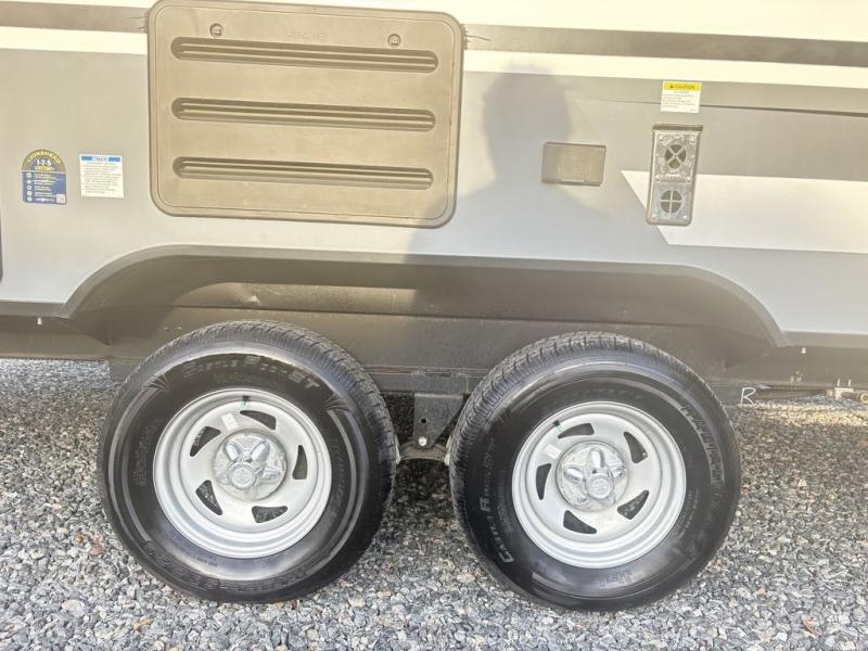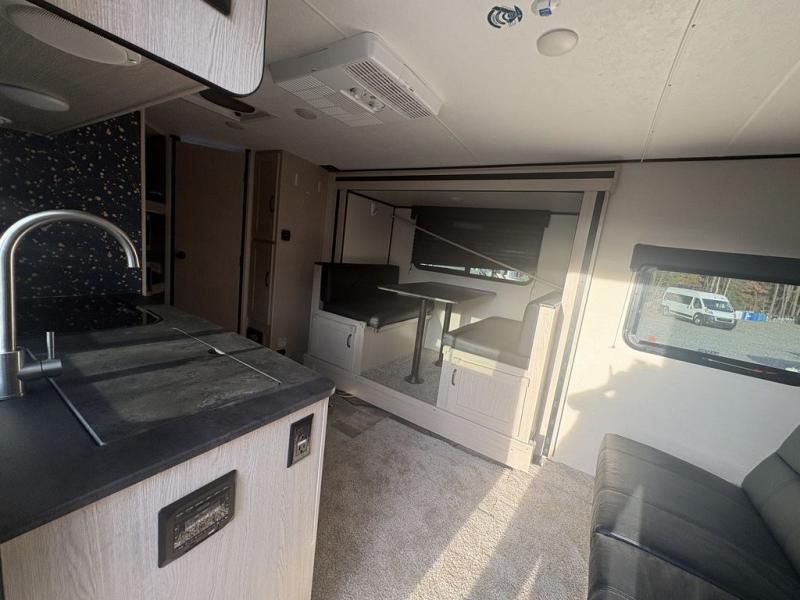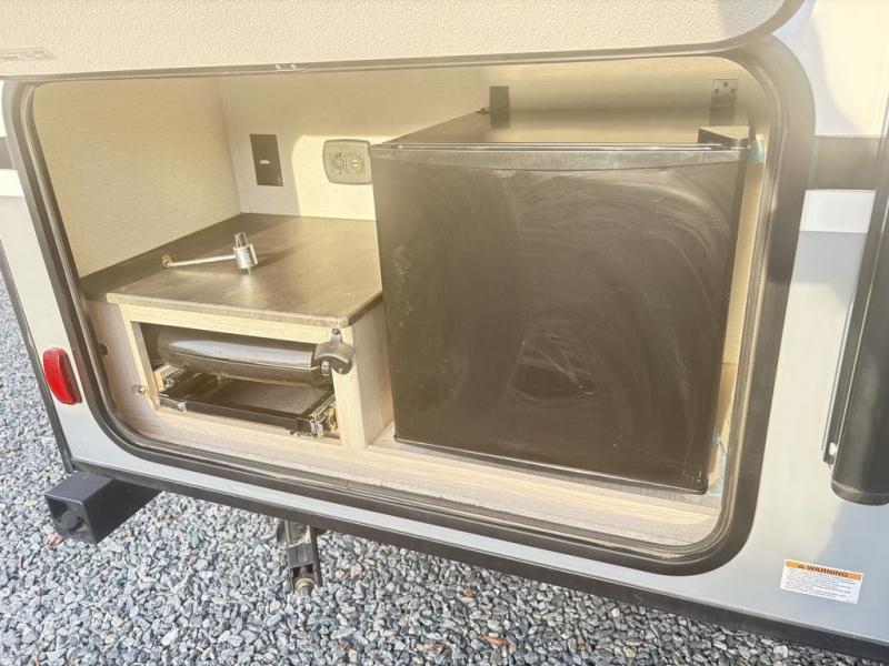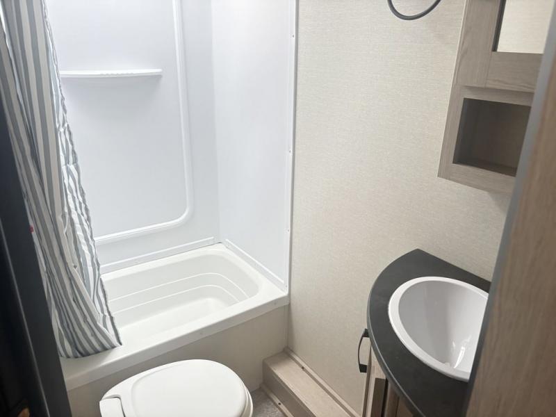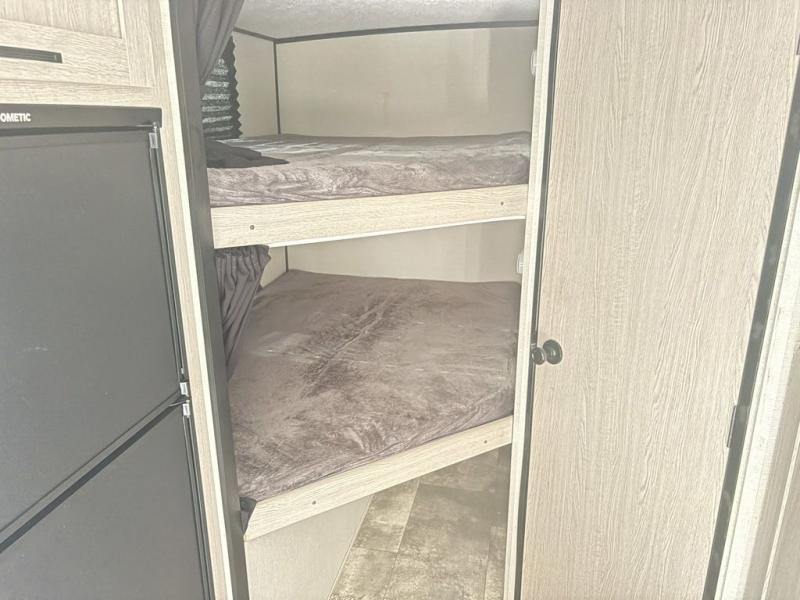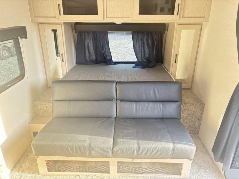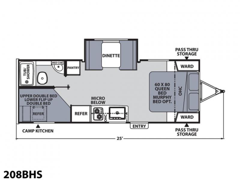 You and a few friends or family members can camp comfortably in this travel trailer! It features a front queen bed with wardrobes on either side to keep your clothes out of the way or you can switch it out for the optional Murphy bed for more versatility. Two others can sleep on the rear corner upper double bed and lower flip up double bed. After you have fried up some eggs on the two burner cooktop and heated up a piece of banana bread in the microwave, you can head to the booth dinette slide to enjoy it. There is even a pantry to store your coffee grounds and snacks. Now that your bellies are full, you can freshen up in the rear corner bathroom with the tub/shower.