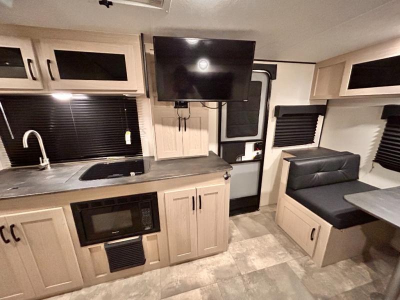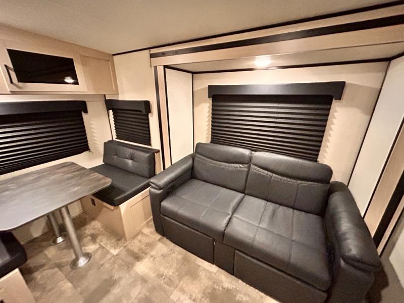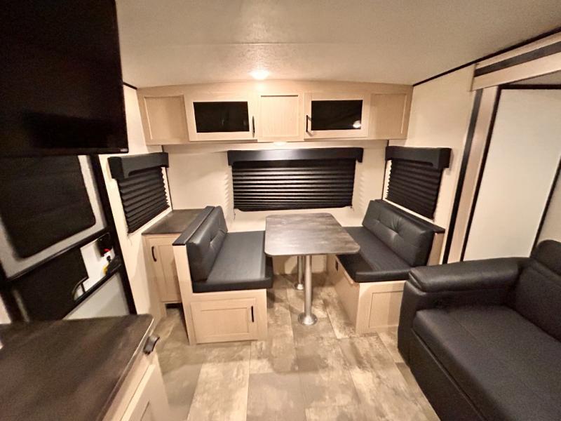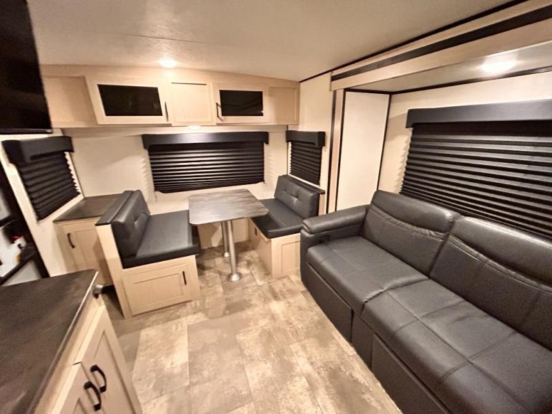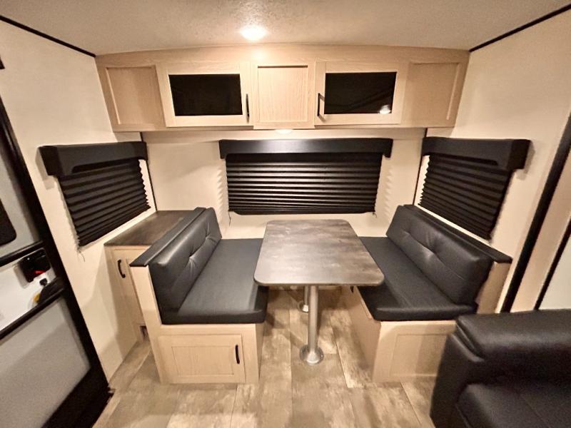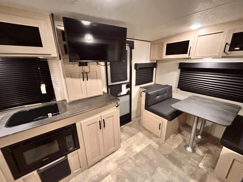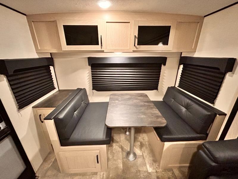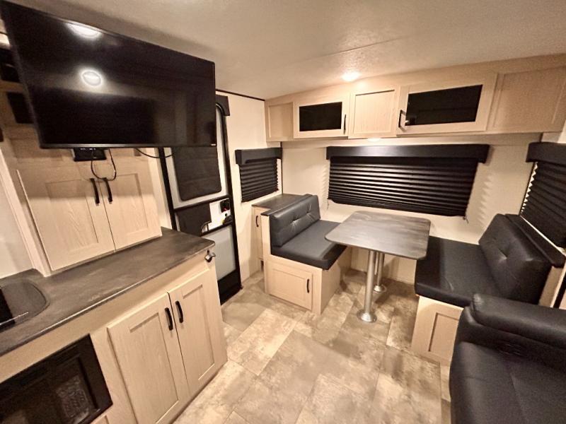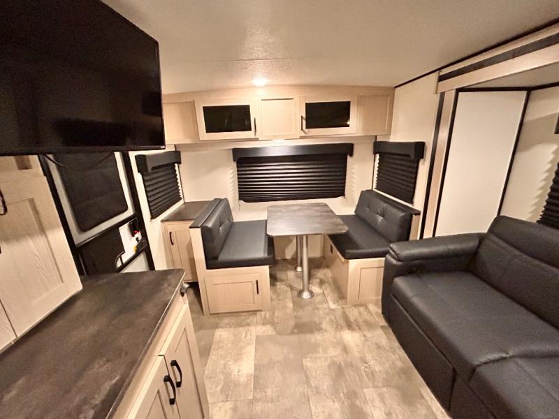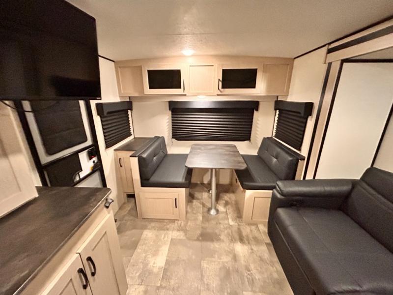 Escape the hustle and bustle of everyday life with this travel trailer! You will start each morning feeling recharged after sleeping on the front queen bed with wardrobes on either side to keep your clothes looking nice. The full bathroom has a neo-angled shower for you to freshen up and a medicine cabinet to store your toiletries. The sofa slide is across from the entertainment center for a comfortable movie night or you can play some card games at the rear booth dinette with an end table on one side.