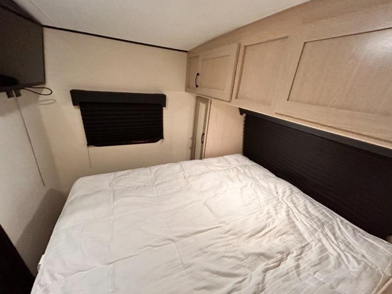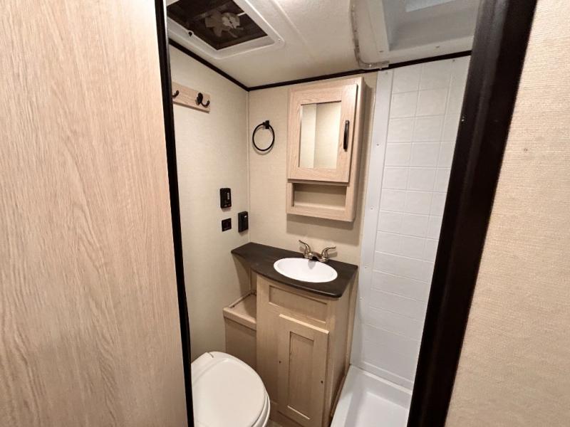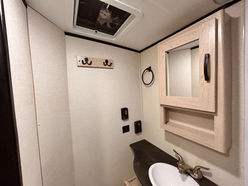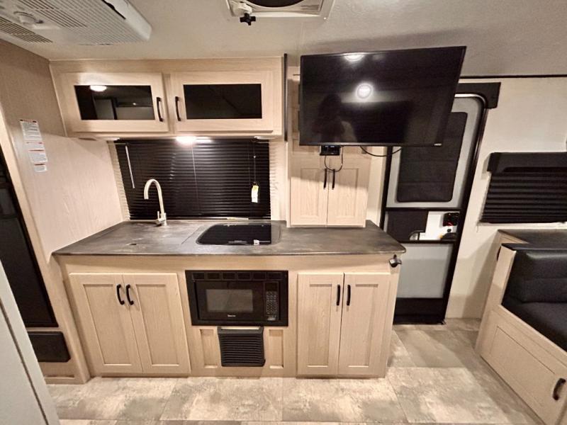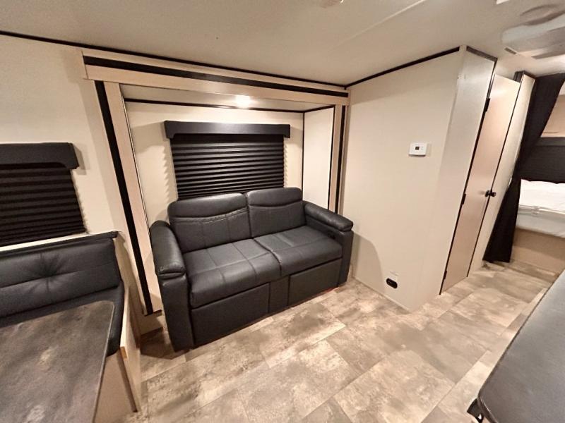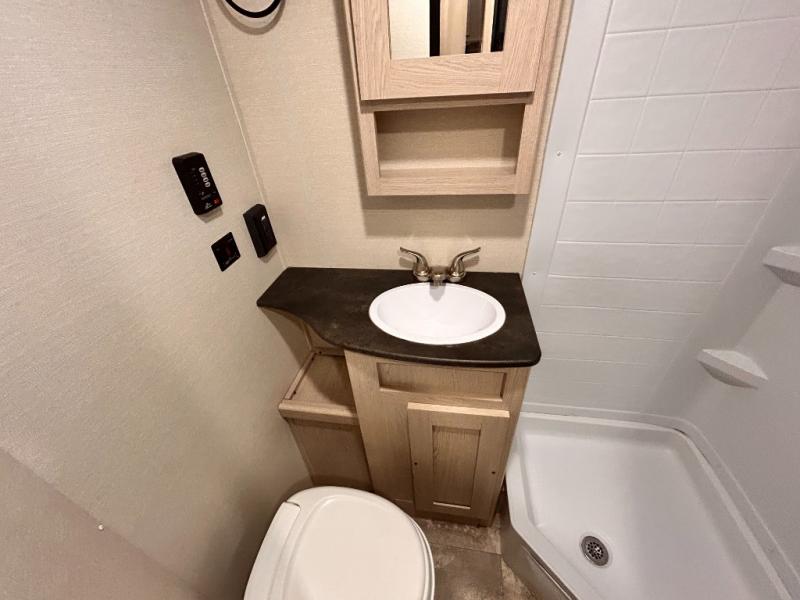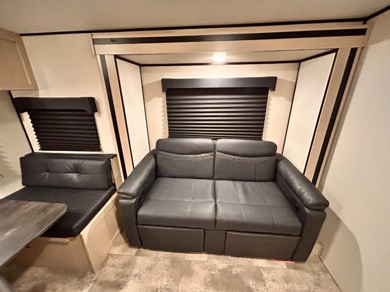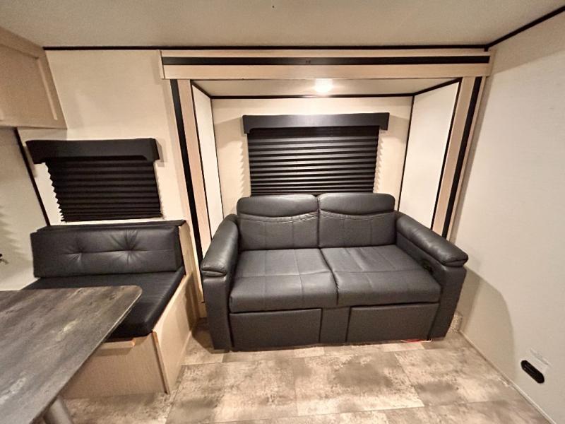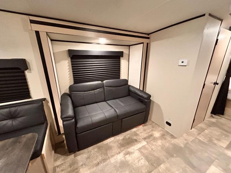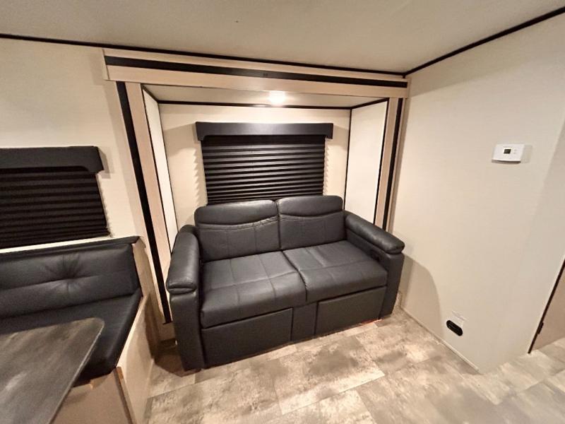 Escape the hustle and bustle of everyday life with this travel trailer! You will start each morning feeling recharged after sleeping on the front queen bed with wardrobes on either side to keep your clothes looking nice. The full bathroom has a neo-angled shower for you to freshen up and a medicine cabinet to store your toiletries. The sofa slide is across from the entertainment center for a comfortable movie night or you can play some card games at the rear booth dinette with an end table on one side.