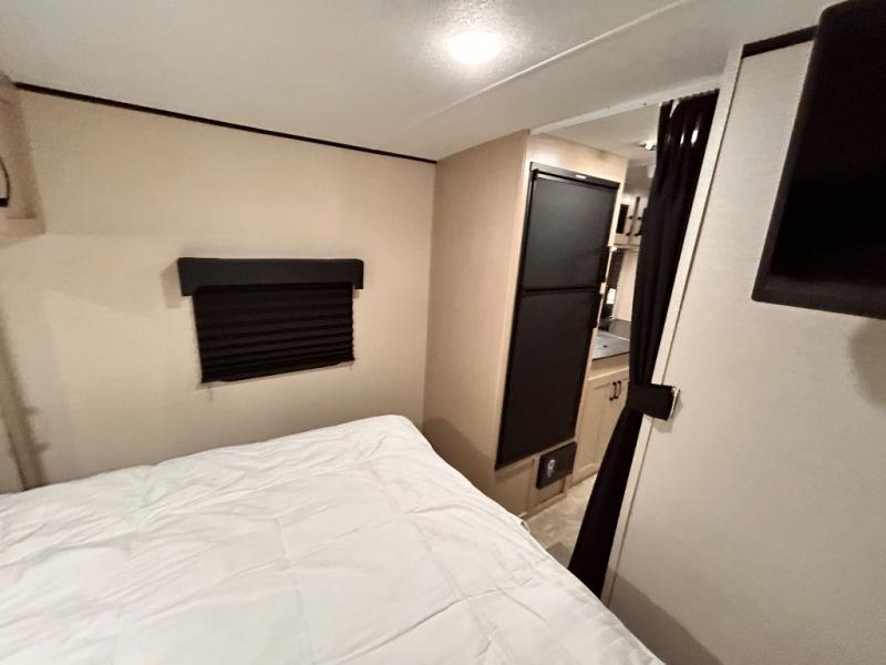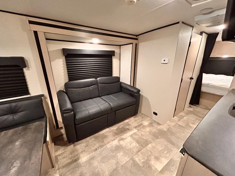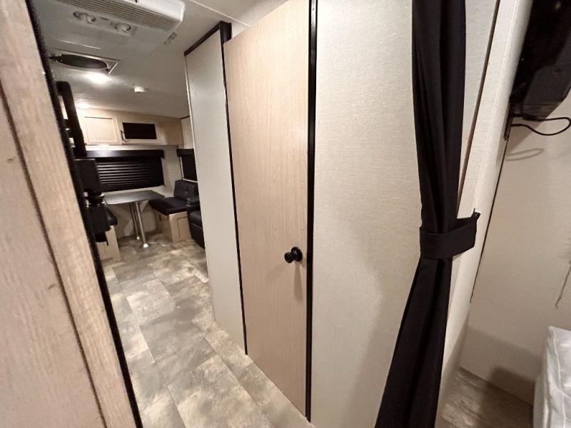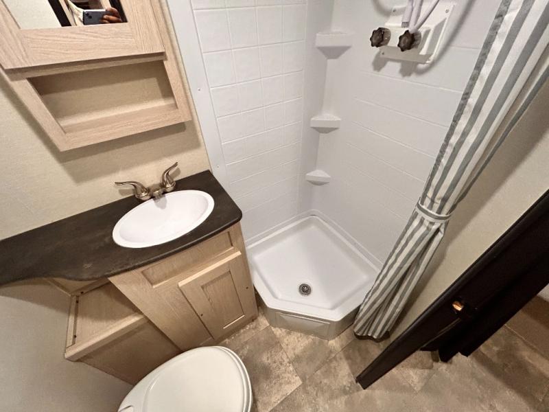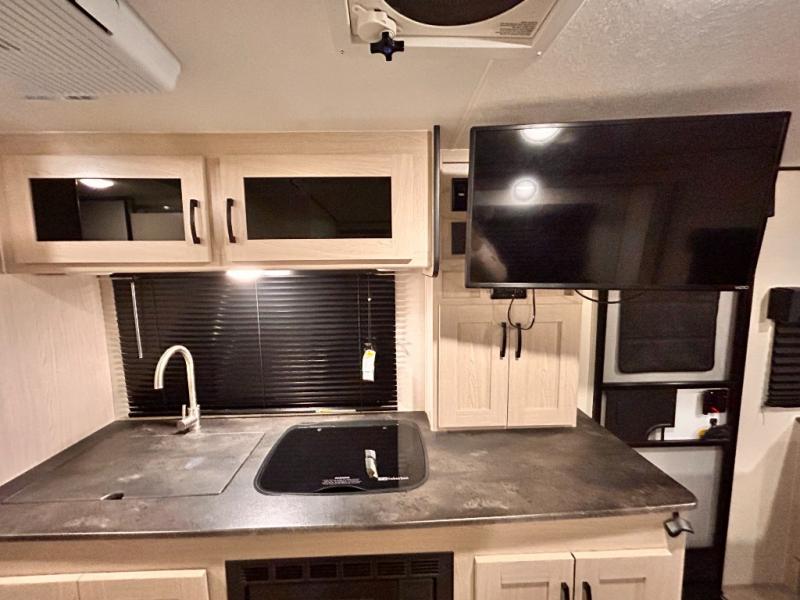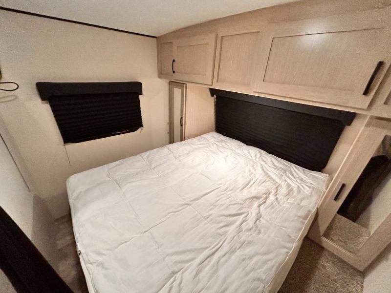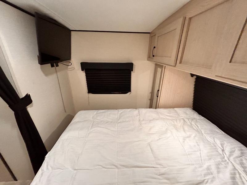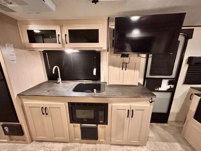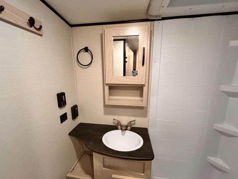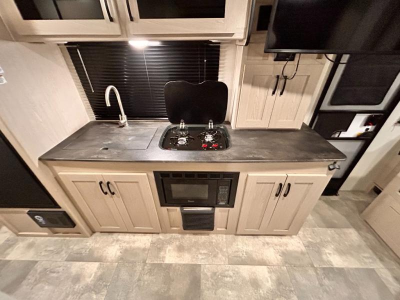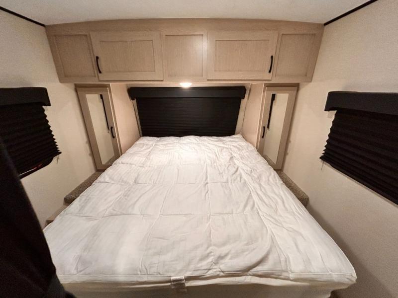 Escape the hustle and bustle of everyday life with this travel trailer! You will start each morning feeling recharged after sleeping on the front queen bed with wardrobes on either side to keep your clothes looking nice. The full bathroom has a neo-angled shower for you to freshen up and a medicine cabinet to store your toiletries. The sofa slide is across from the entertainment center for a comfortable movie night or you can play some card games at the rear booth dinette with an end table on one side.