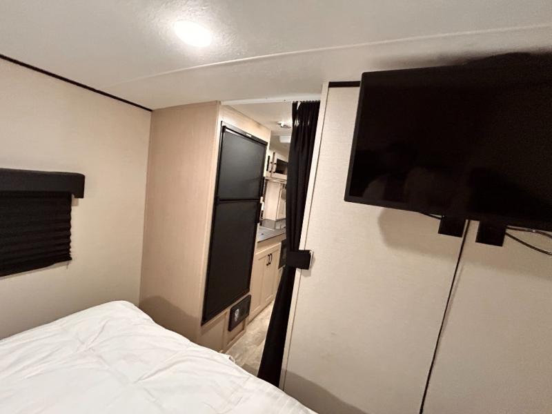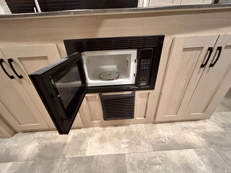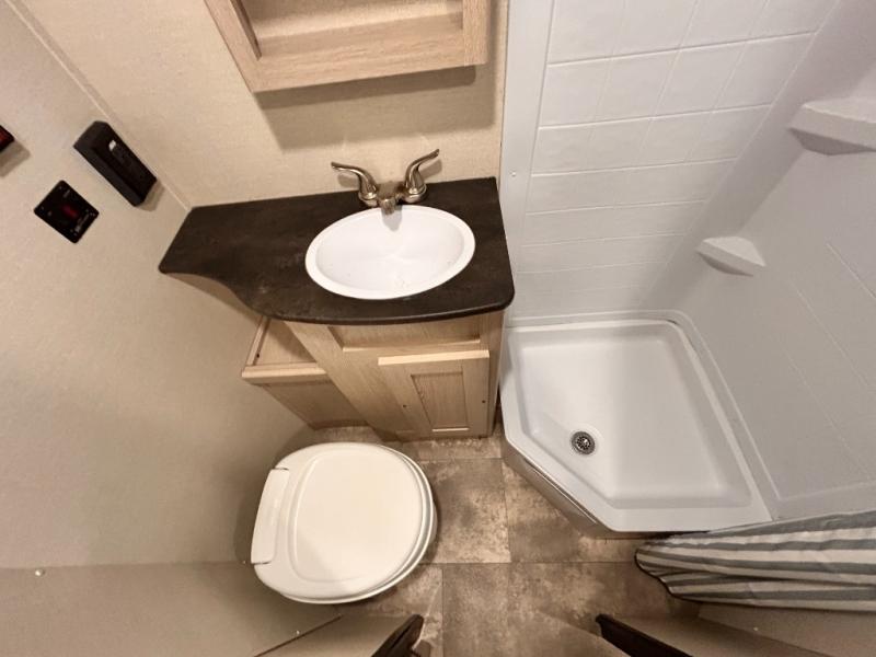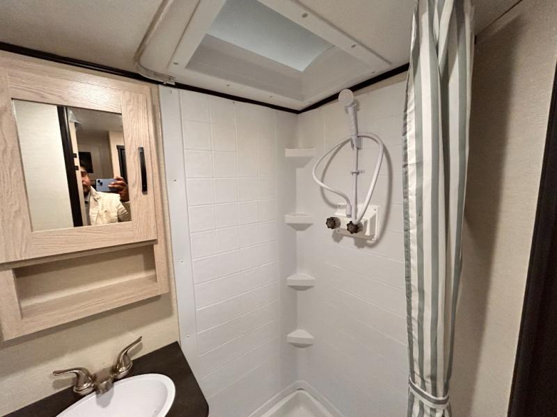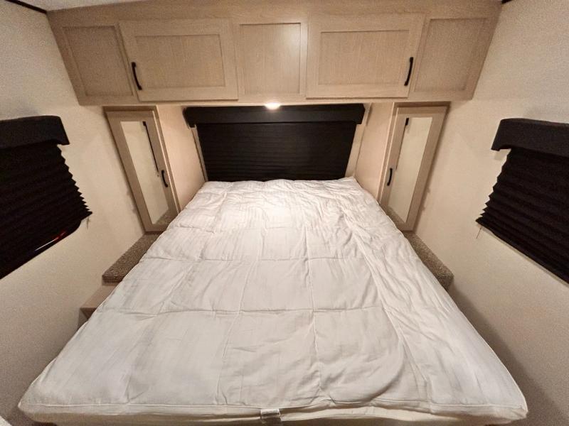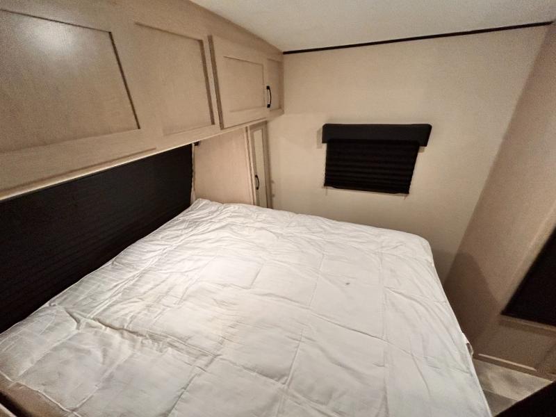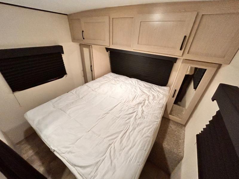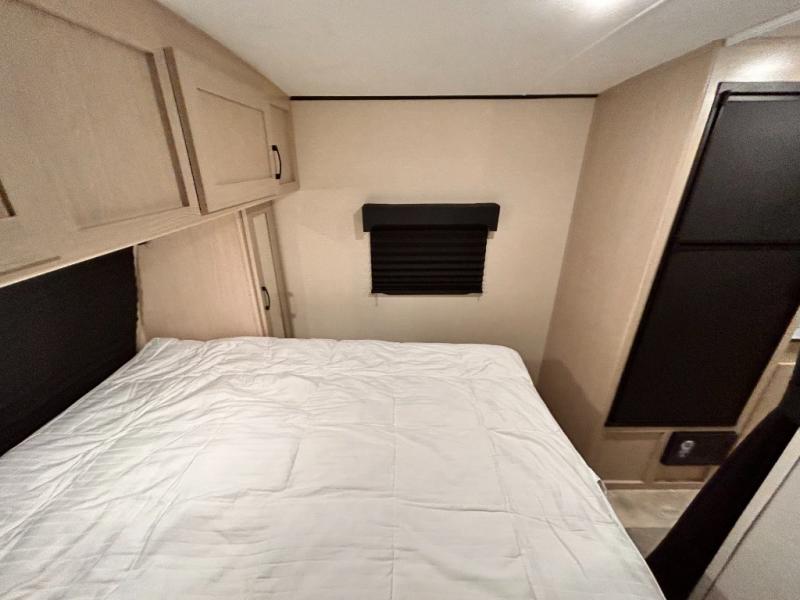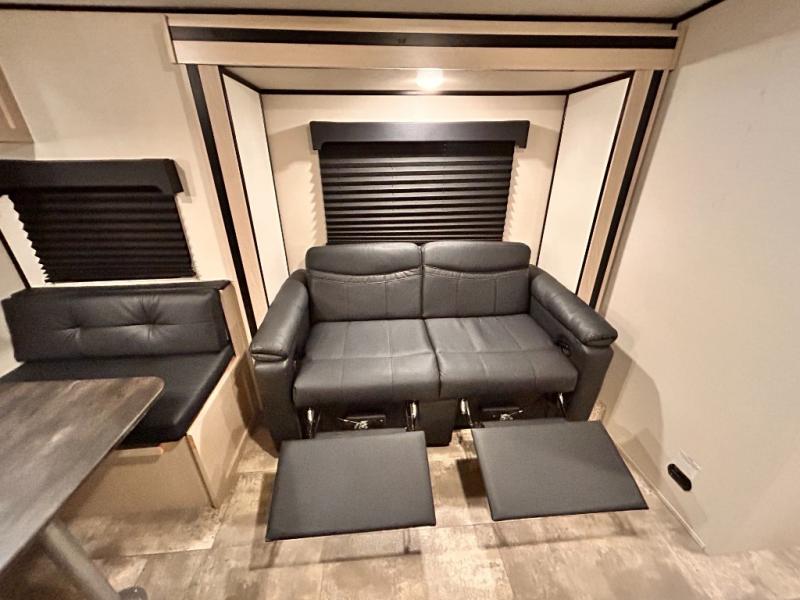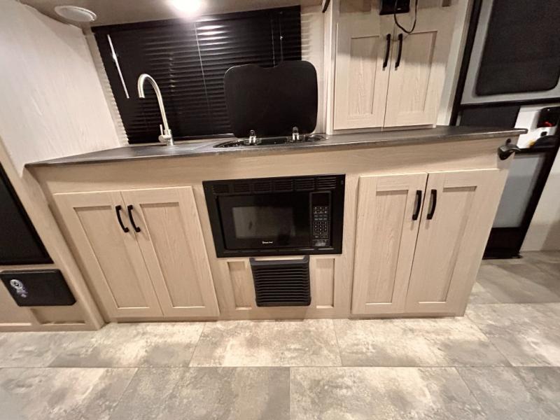 Escape the hustle and bustle of everyday life with this travel trailer! You will start each morning feeling recharged after sleeping on the front queen bed with wardrobes on either side to keep your clothes looking nice. The full bathroom has a neo-angled shower for you to freshen up and a medicine cabinet to store your toiletries. The sofa slide is across from the entertainment center for a comfortable movie night or you can play some card games at the rear booth dinette with an end table on one side.