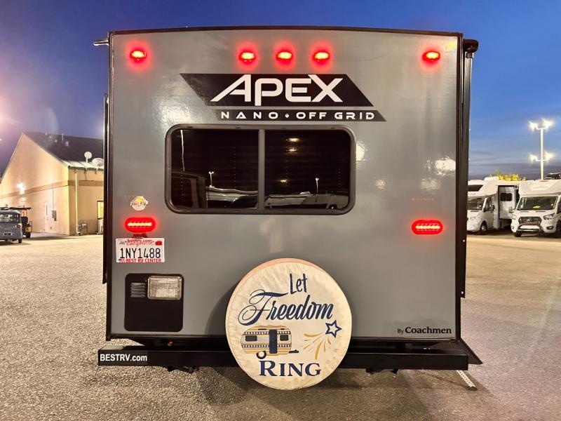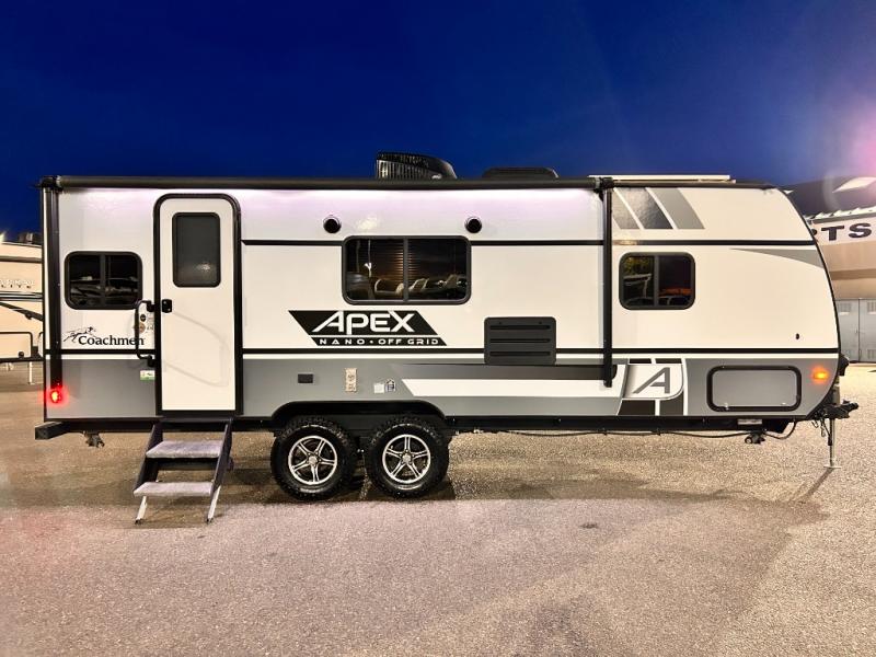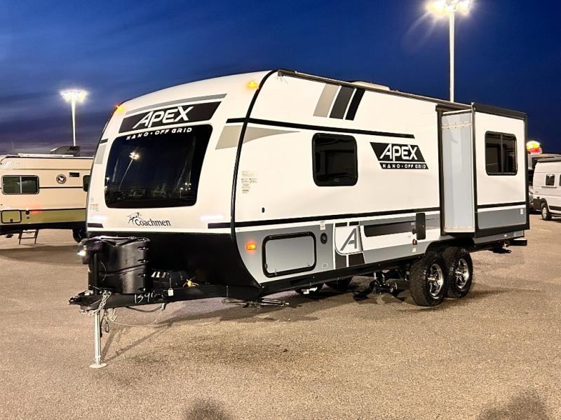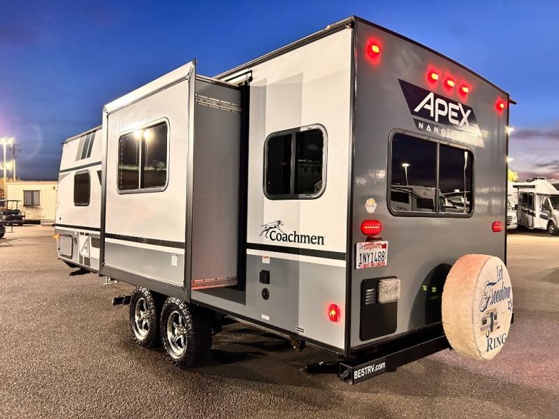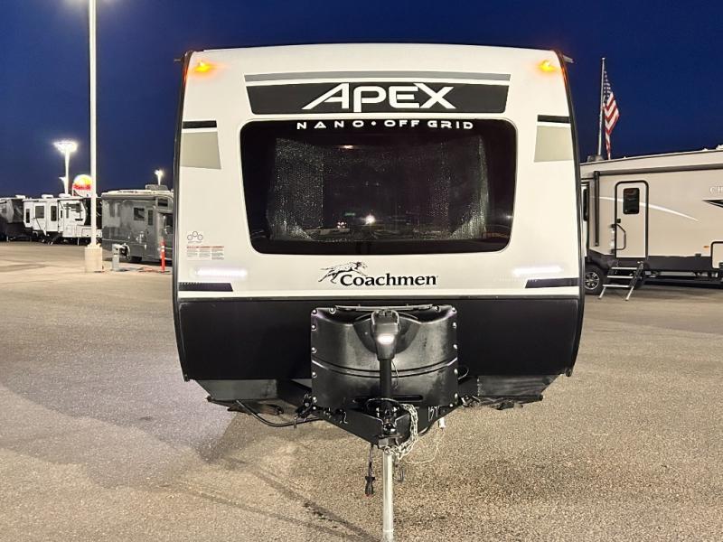 You will find comfort, convenience, and a sturdy construction with each of these Coachmen RV Apex Nano travel trailers! They are held together with an aluma-cage construction, vacuum-bonded Azdel fiberglass walls, an I-beam chassis, and a roof membrane with Dicor Crossflex, plus the powder coated frame is corrosion resistant. The Dexter E-Z lube axles and nitrogen filled radial tires will help you arrive safely. The mandatory Nano package comes with many features to make camp life better like magnetic baggage door catches, outside speakers, a digital TV antenna with cable hook-ups and WiFi capability, and a hot/cold outside shower to keep the dirt outside where it belongs. Come find the perfect model that fits your needs today!