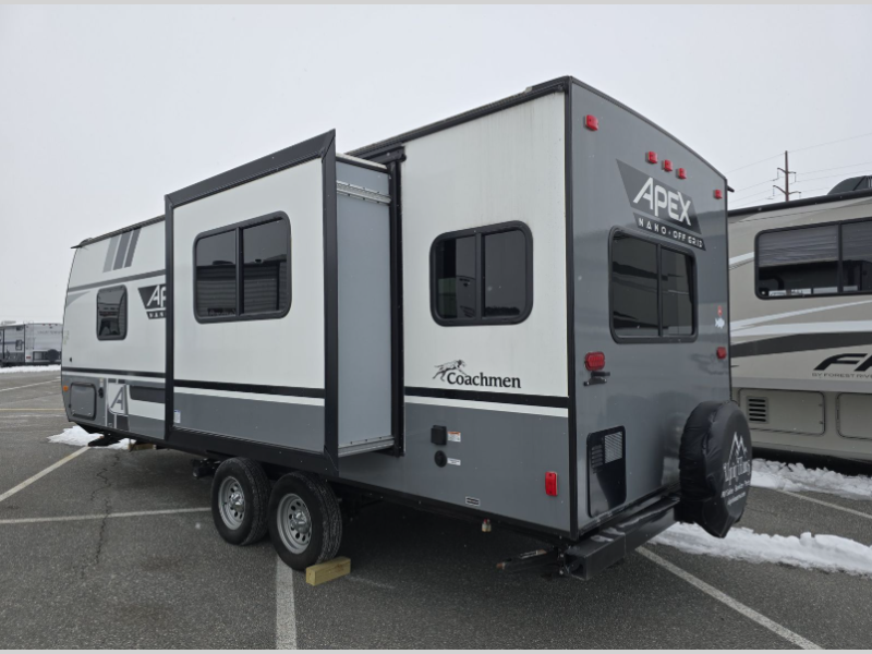 You will find comfort, convenience, and a sturdy construction with each of these Coachmen RV Apex Nano travel trailers! They are held together with an aluma-cage construction, vacuum-bonded Azdel fiberglass walls, an I-beam chassis, and a roof membrane with Dicor Crossflex, plus the powder coated frame is corrosion resistant. The Dexter E-Z lube axles and nitrogen filled radial tires will help you arrive safely. The mandatory Nano package comes with many features to make camp life better like magnetic baggage door catches, outside speakers, a digital TV antenna with cable hook-ups and WiFi capability, and a hot/cold outside shower to keep the dirt outside where it belongs. Come find the perfect model that fits your needs today!