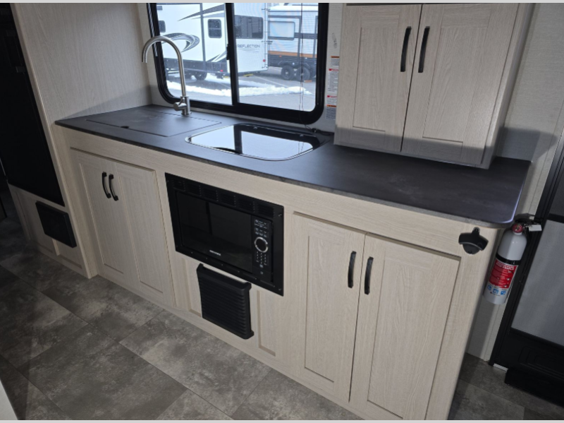 Escape the hustle and bustle of everyday life with this travel trailer! You will start each morning feeling recharged after sleeping on the front queen bed with wardrobes on either side to keep your clothes looking nice. The full bathroom has a neo-angled shower for you to freshen up and a medicine cabinet to store your toiletries. The sofa slide is across from the entertainment center for a comfortable movie night or you can play some card games at the rear booth dinette with an end table on one side.