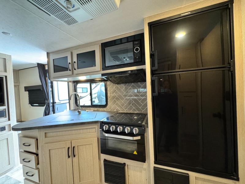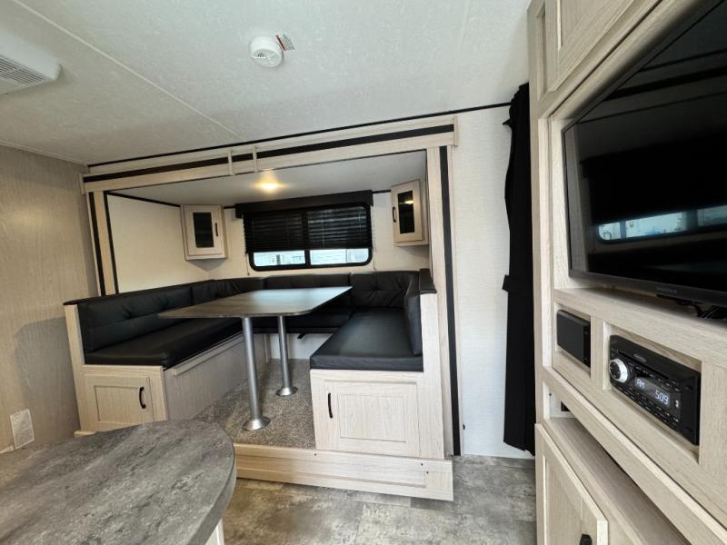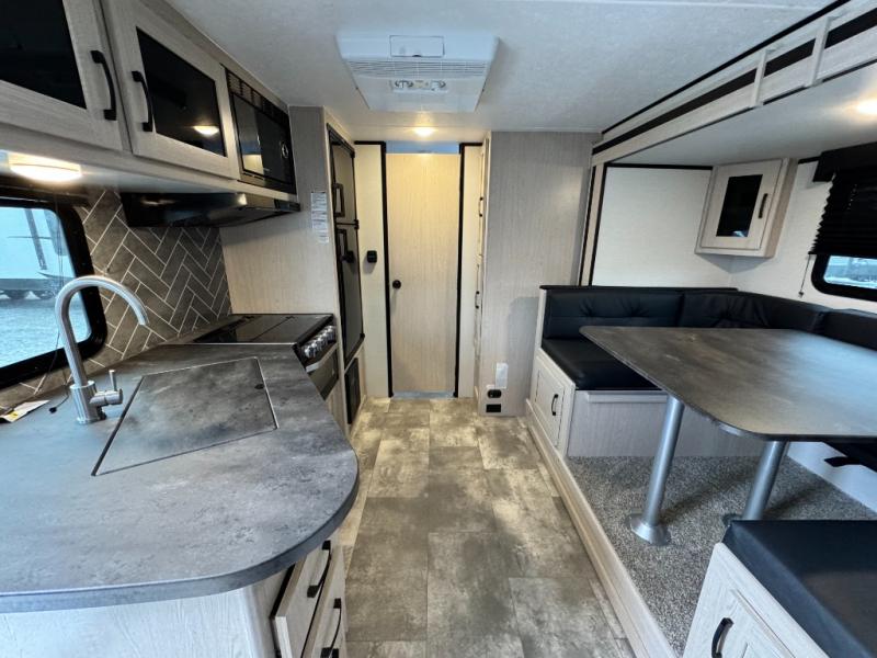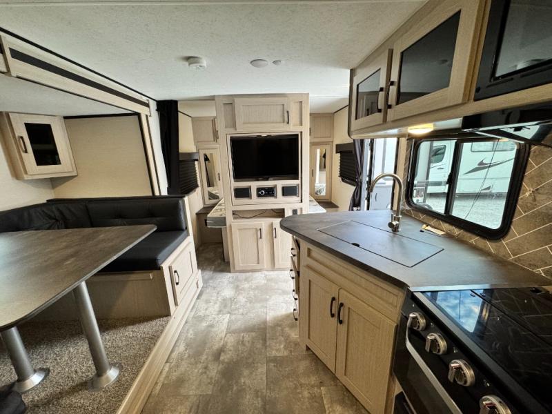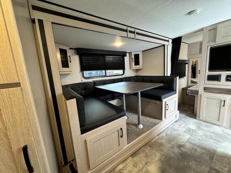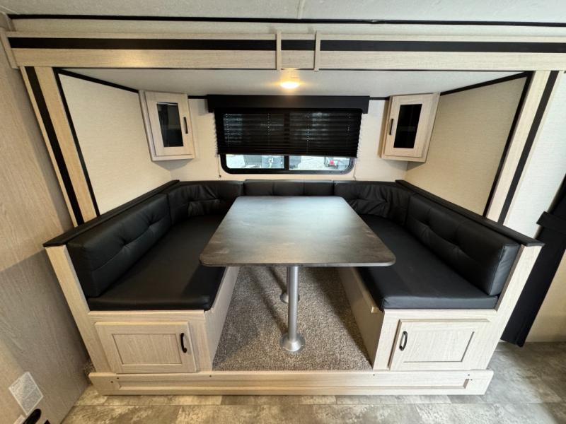 Easy to tow so you can get up and go! The U-shaped dinette slide will not only be a favorite spot to dine and play game, but will also double as additional sleeping space. There is a full interior kitchen, plus an outdoor kitchen for breakfast outdoors. When you're ready to come in for the night, head to the spacious full rear bath to clean up, and the front bedroom will make this unit feel more like home with its queen bed and dual wardrobes!