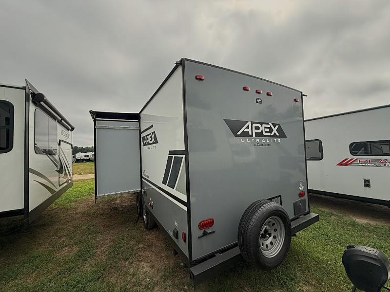 Lightweight living and camping is found with the Apex Ultra-Lite travel trailers by Coachmen. These eco-friendly units are made to last thanks to the Azdel composite sidewalls, the laminated aluminum floor, and the vacuum-bonded laminated crowned roof. Lippert axles and nitrogen filled radial tires make towing easier than ever, plus there is a friction hinge entrance door, a 100-watt solar panel with a 10 Amp control charger, and slam latch baggage door catches for easy unloading. Some of the interior comforts you'll fall in love with are the one-piece seamless edge countertops, the hard valances with night shades throughout, the matte black hardware, and the residential comforter. The Apex Ultra-Lite trailers also include USB ports, a digital TV antenna with cable hook-ups and Wi-Fi capability, and an AM/FM stereo with Bluetooth to ensure you'll never go bored on rainy camp days!