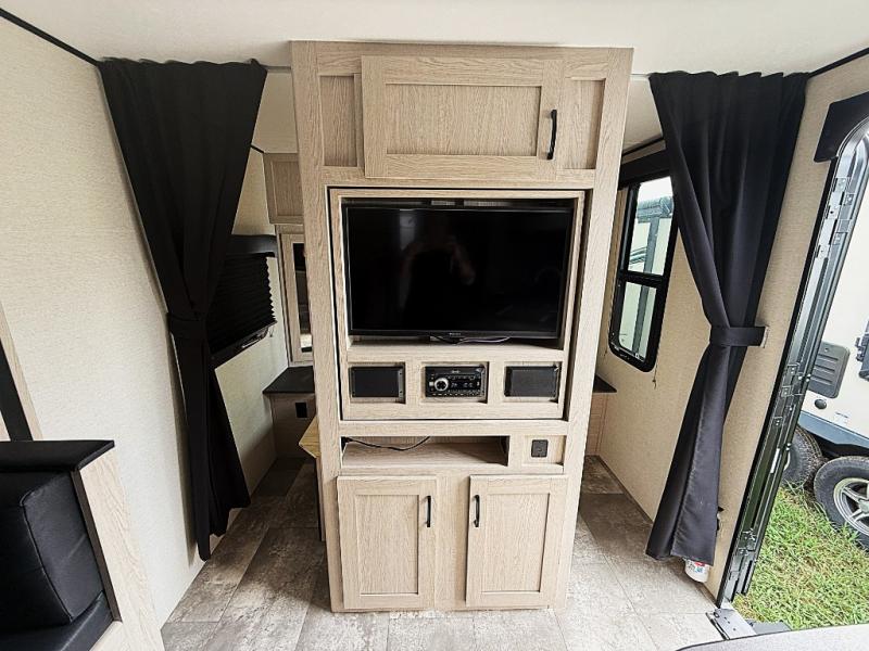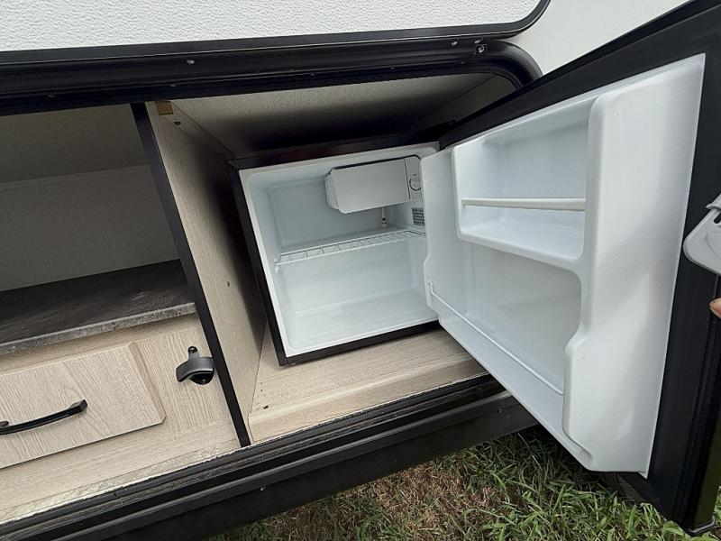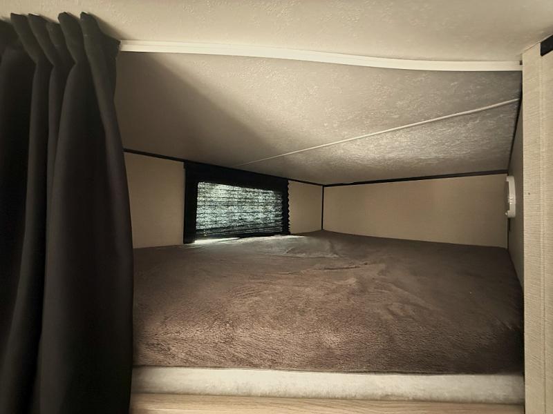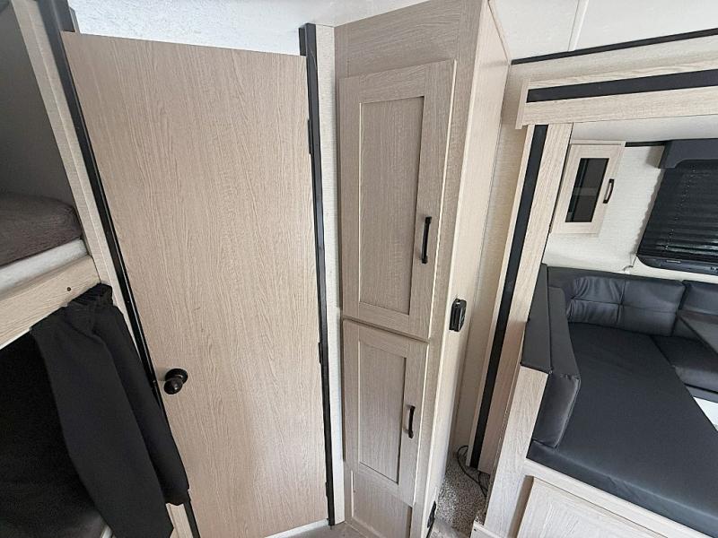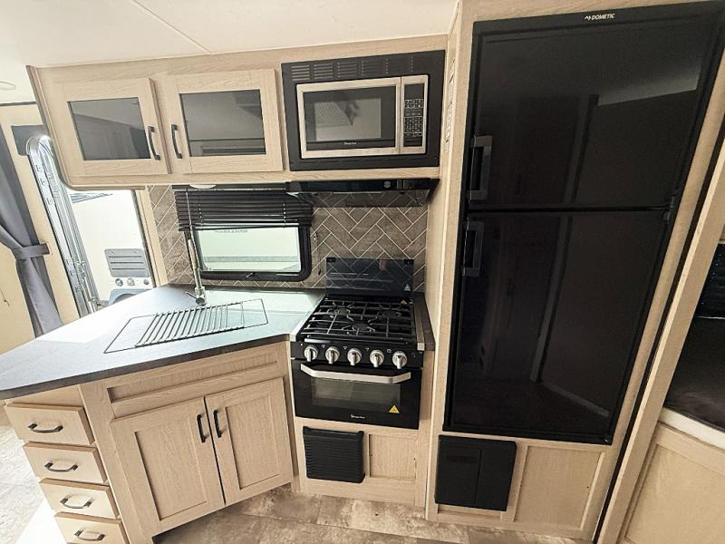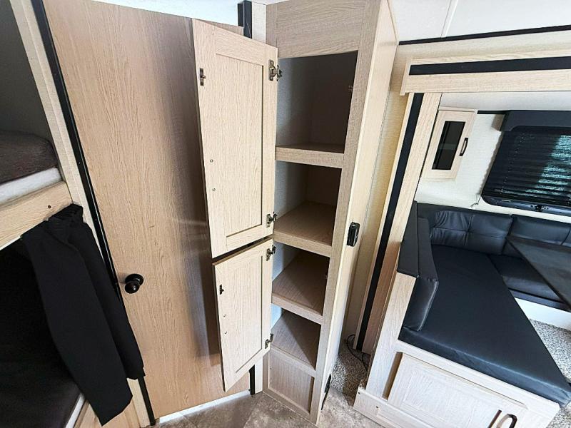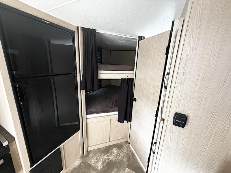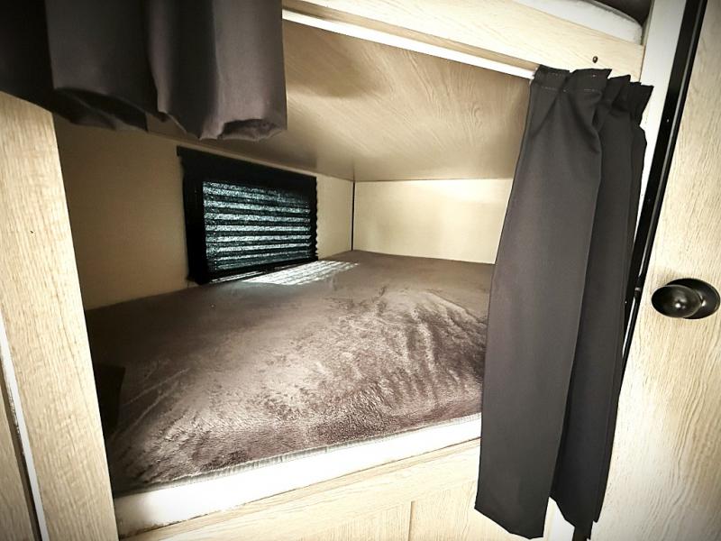 Double-size bunks make any camping trip fun, so pack your bags and head out! When you arrive at the campground you can make a quick lunch on the outdoor camp kitchen, and unload the exterior pass-through storage. A fully-equipped kitchen indoors includes a three burner cooktop, a microwave oven, plus a stainless steel sink with a flush-mount cover for added counter space. You will love having your own full bath on board, as well as a front bedroom with a queen bed and dual wardrobes.