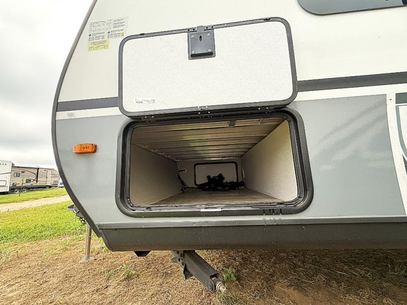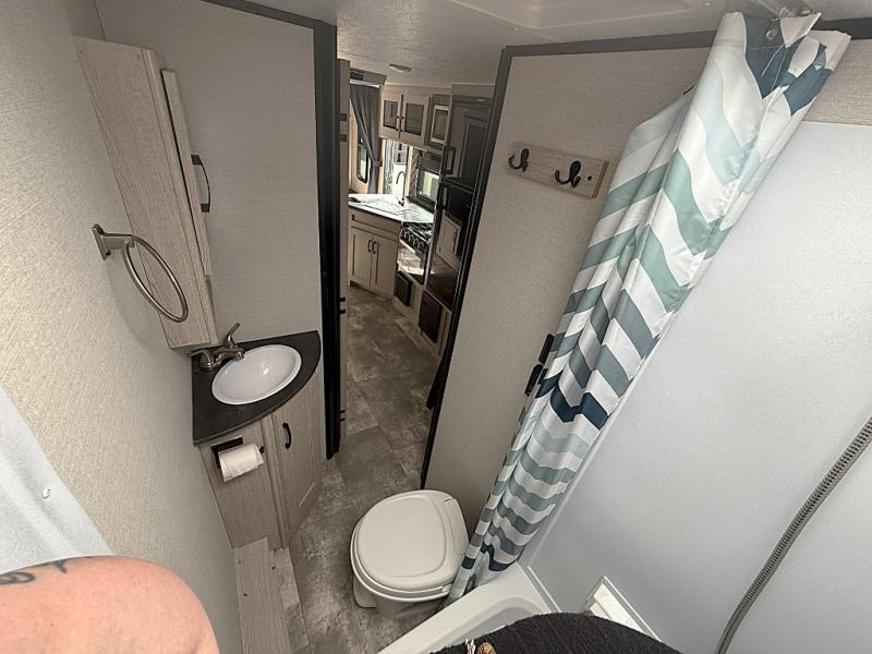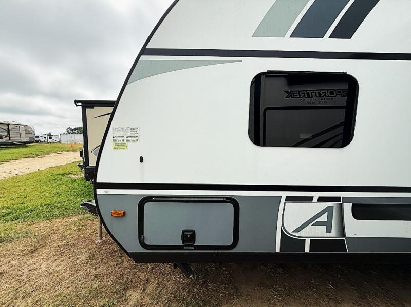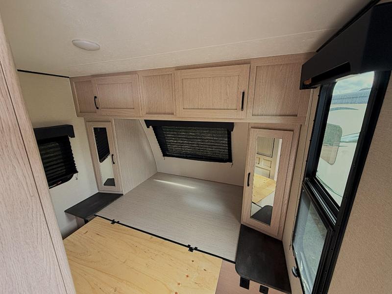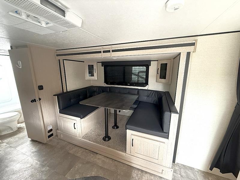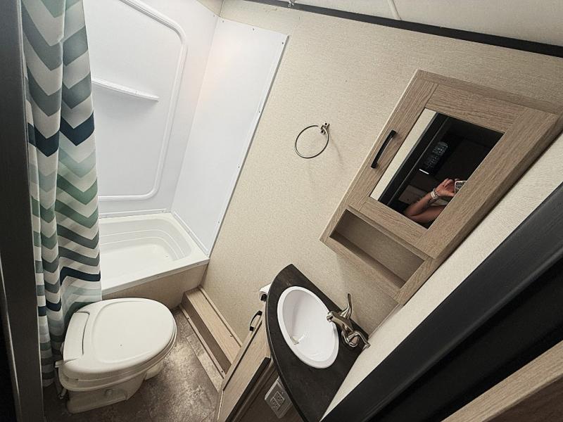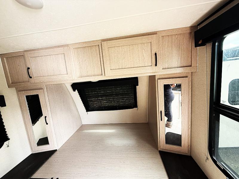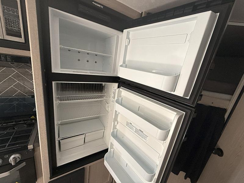Double-size bunks make any camping trip fun, so pack your bags and head out! When you arrive at the campground you can make a quick lunch on the outdoor camp kitchen, and unload the exterior pass-through storage. A fully-equipped kitchen indoors includes a three burner cooktop, a microwave oven, plus a stainless steel sink with a flush-mount cover for added counter space. You will love having your own full bath on board, as well as a front bedroom with a queen bed and dual wardrobes.