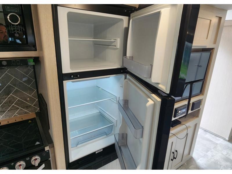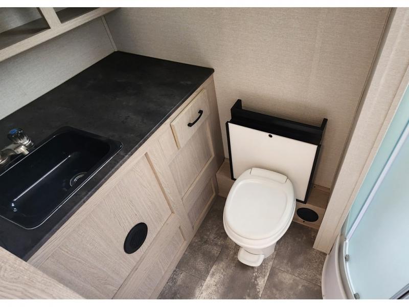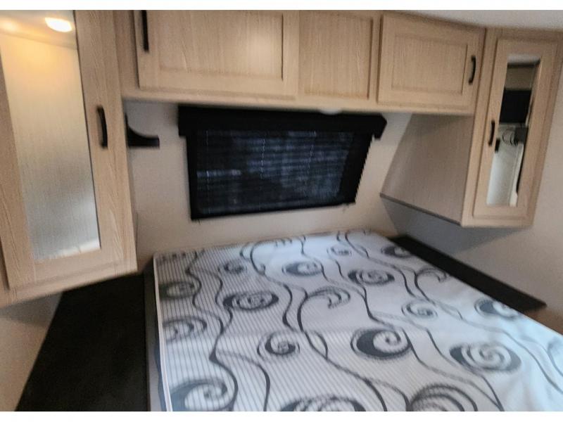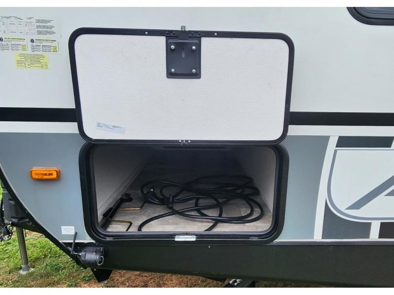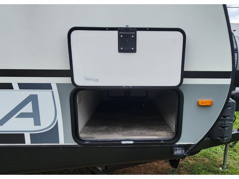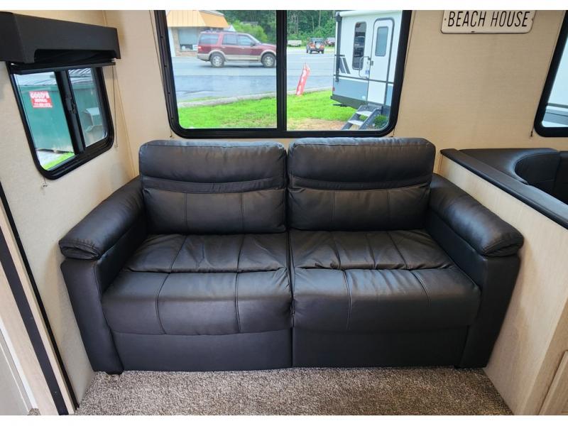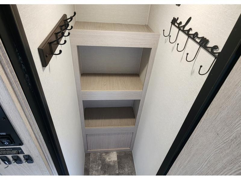 You won't be roughing it on camping trips with this spacious travel trailer. Once you arrive at the lake, make a quick lunch on the exterior camp kitchen, set up the 18' power awning, then grab the fishing poles from the pass-through storage! When you get back from fishing you can clean up in the full rear bath, then relax on the sofa or play a game around the U-shaped dinette. You will love the amount of storage space you have in this trailer with plenty of overhead cabinets, dual bedroom wardrobes, plus an entryway walk-in closet with shelves for jackets, food, and shoes!