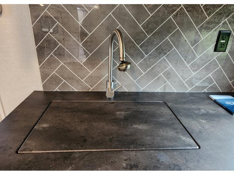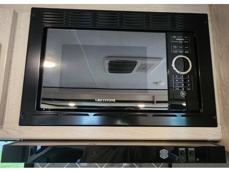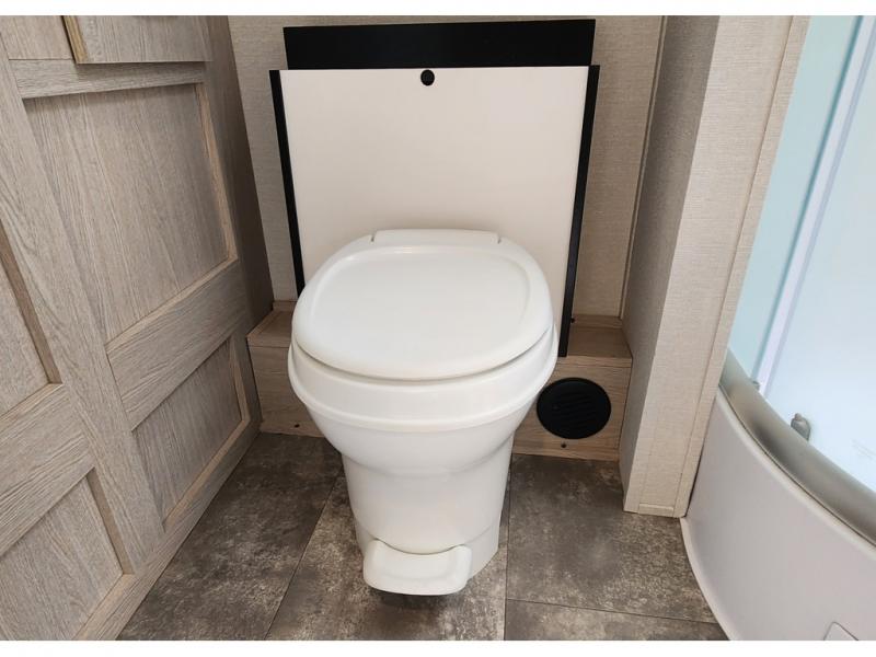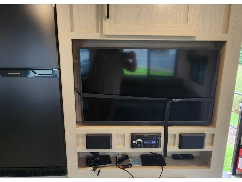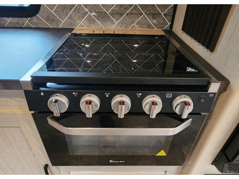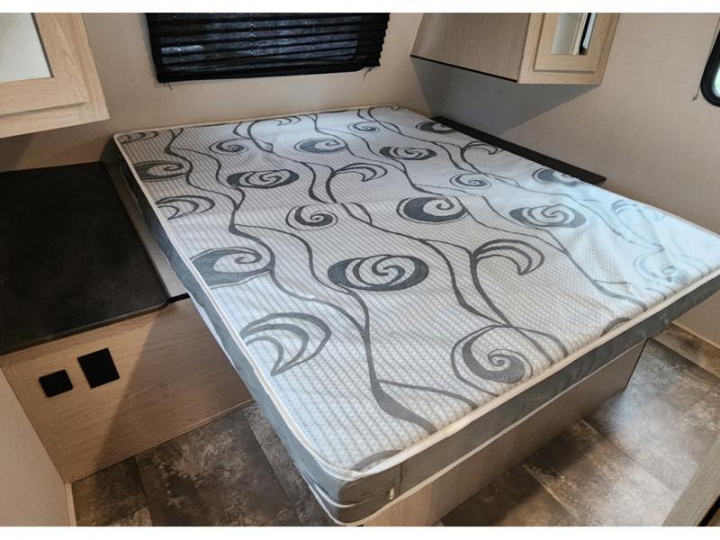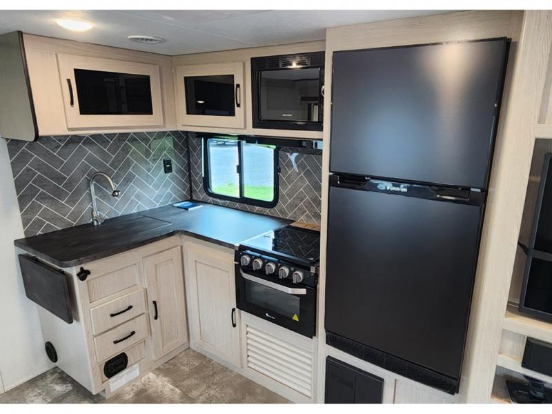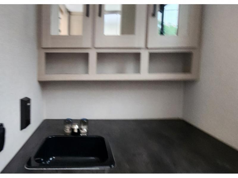 You won't be roughing it on camping trips with this spacious travel trailer. Once you arrive at the lake, make a quick lunch on the exterior camp kitchen, set up the 18' power awning, then grab the fishing poles from the pass-through storage! When you get back from fishing you can clean up in the full rear bath, then relax on the sofa or play a game around the U-shaped dinette. You will love the amount of storage space you have in this trailer with plenty of overhead cabinets, dual bedroom wardrobes, plus an entryway walk-in closet with shelves for jackets, food, and shoes!