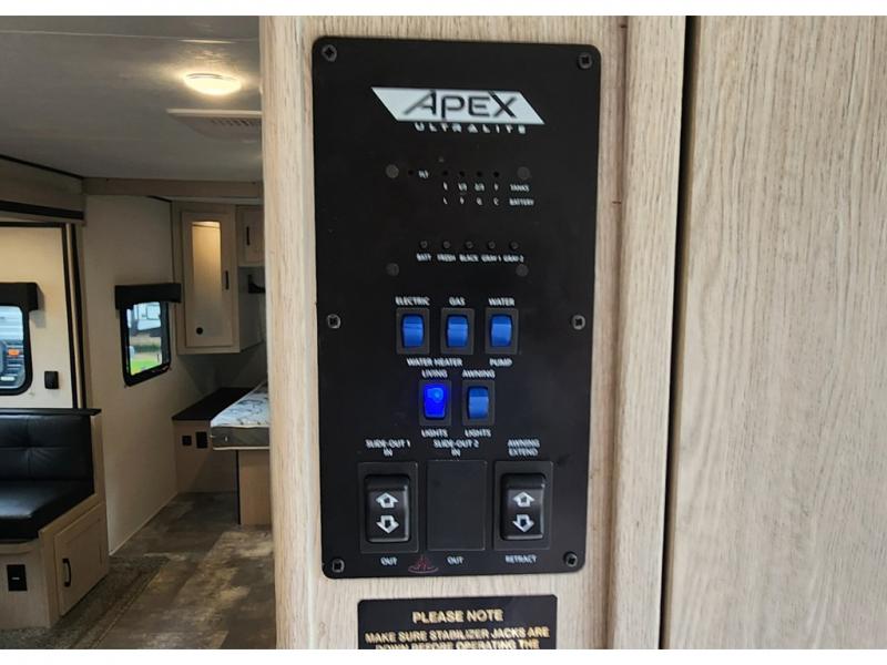 Lightweight living and camping is found with the Apex Ultra-Lite travel trailers by Coachmen. These eco-friendly units are made to last thanks to the Azdel composite sidewalls, the laminated aluminum floor, and the vacuum-bonded laminated crowned roof. Lippert axles and nitrogen filled radial tires make towing easier than ever, plus there is a friction hinge entrance door, a 100-watt solar panel with a 10 Amp control charger, and slam latch baggage door catches for easy unloading. Some of the interior comforts you'll fall in love with are the one-piece seamless edge countertops, the hard valances with night shades throughout, the matte black hardware, and the residential comforter. The Apex Ultra-Lite trailers also include USB ports, a digital TV antenna with cable hook-ups and Wi-Fi capability, and an AM/FM stereo with Bluetooth to ensure you'll never go bored on rainy camp days!