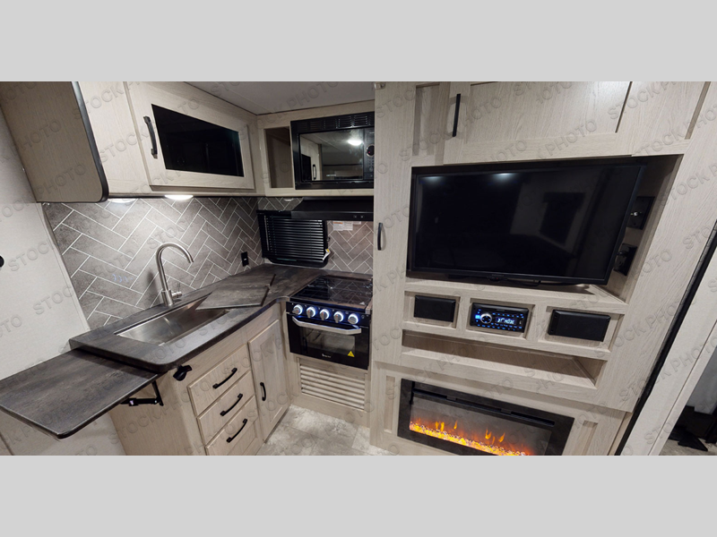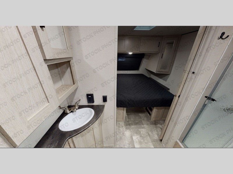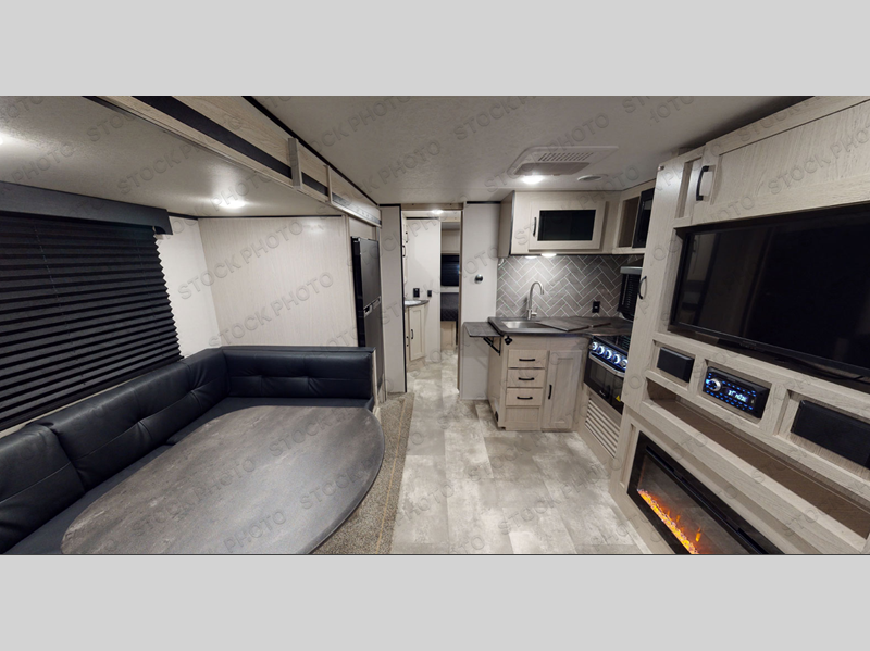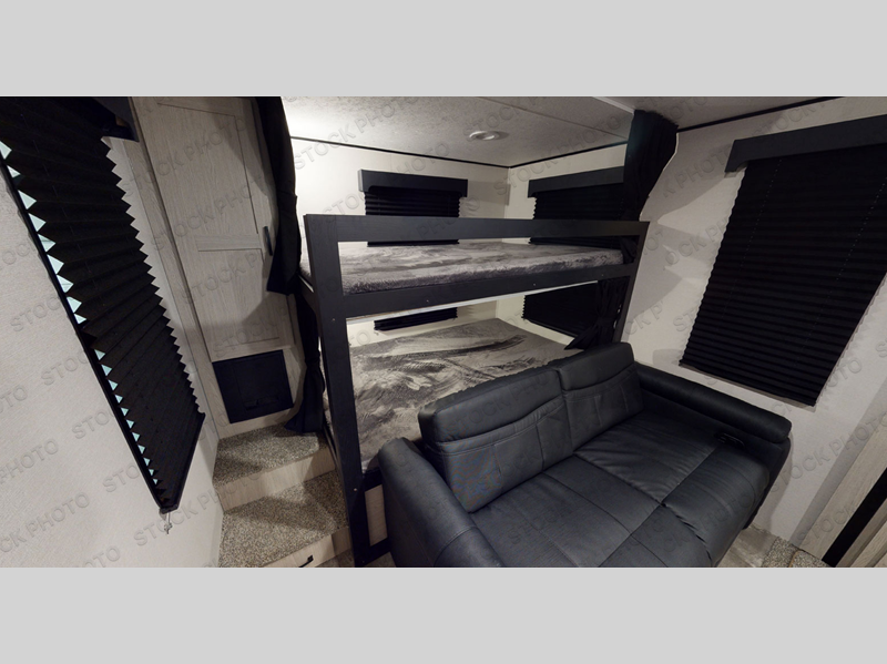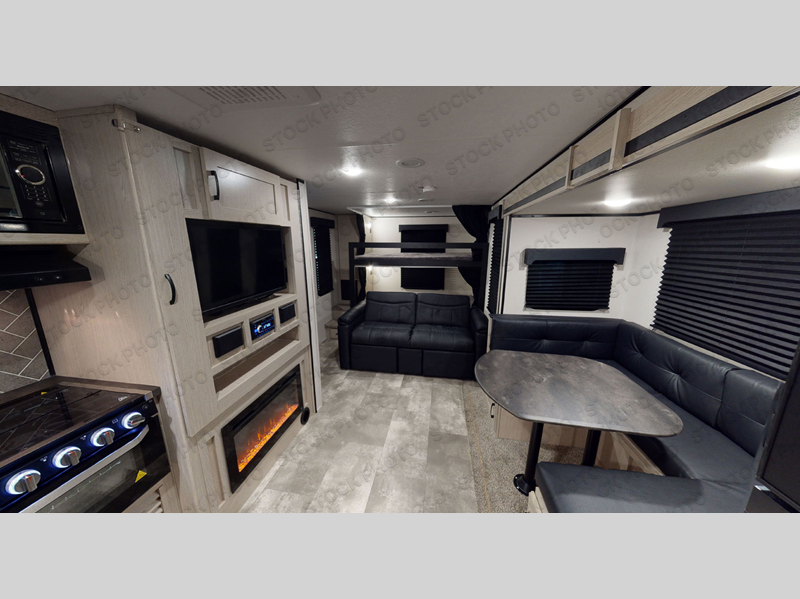 Camping with family or a larger group of friends is easier than ever in this dual entry trailer that can sleep nine people comfortably. The little ones will love the double-size bunks with storage steps, and you'll have the queen bed with super storage all to yourselves. There is also a U-shaped dinette slide and a sofa for even more sleeping space. If the weather is nice, you'll find yourselves outdoors under the 20' power awning and enjoying a snack from the exterior camp kitchen. This model also includes a 32" LED TV, and you'll find the pantry/storage behind the entertainment center for added convenience.