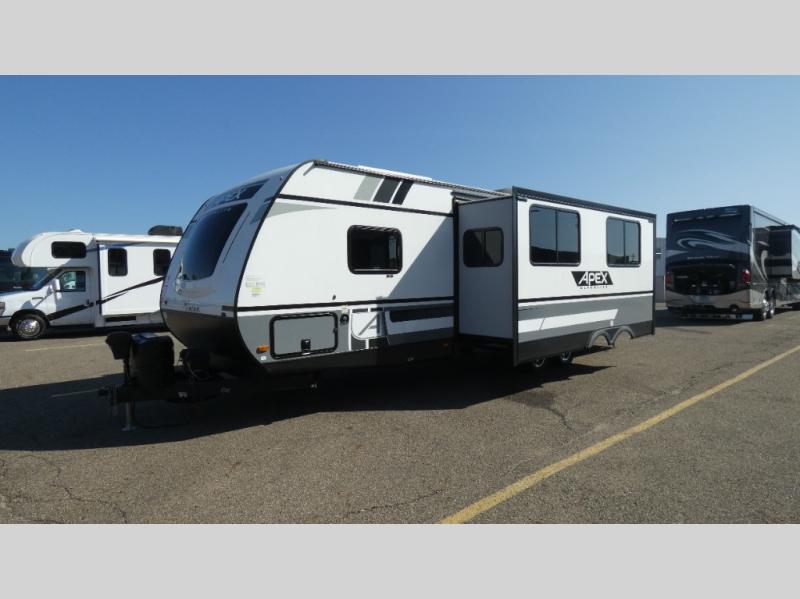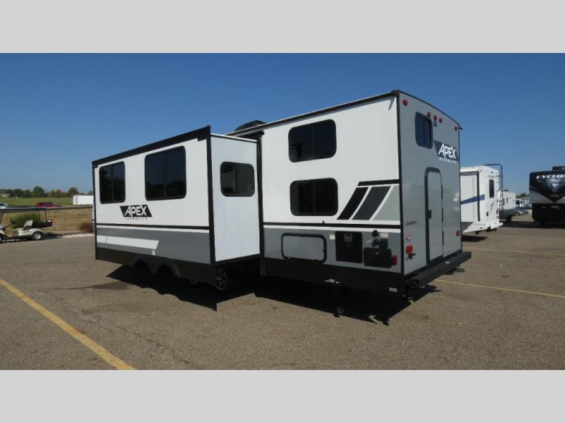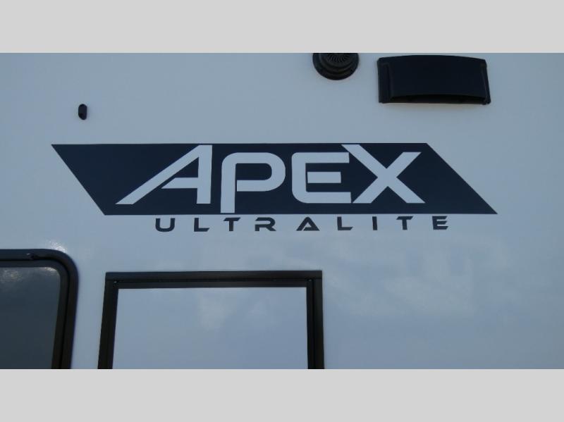 Lightweight living and camping is found with the Apex Ultra-Lite travel trailers by Coachmen. These eco-friendly units are made to last thanks to the Azdel composite sidewalls, the laminated aluminum floor, and the vacuum-bonded laminated crowned roof. Lippert axles and nitrogen filled radial tires make towing easier than ever, plus there is a friction hinge entrance door, a 100-watt solar panel with a 10 Amp control charger, and slam latch baggage door catches for easy unloading. Some of the interior comforts you'll fall in love with are the one-piece seamless edge countertops, the hard valances with night shades throughout, the matte black hardware, and the residential comforter. The Apex Ultra-Lite trailers also include USB ports, a digital TV antenna with cable hook-ups and Wi-Fi capability, and an AM/FM stereo with Bluetooth to ensure you'll never go bored on rainy camp days!