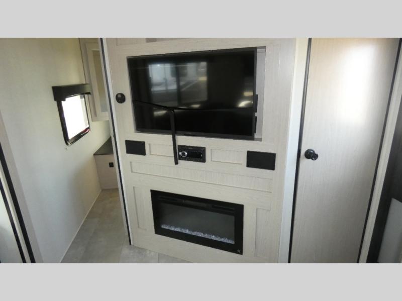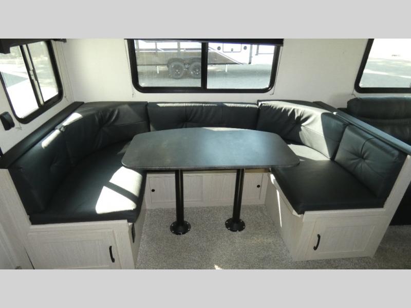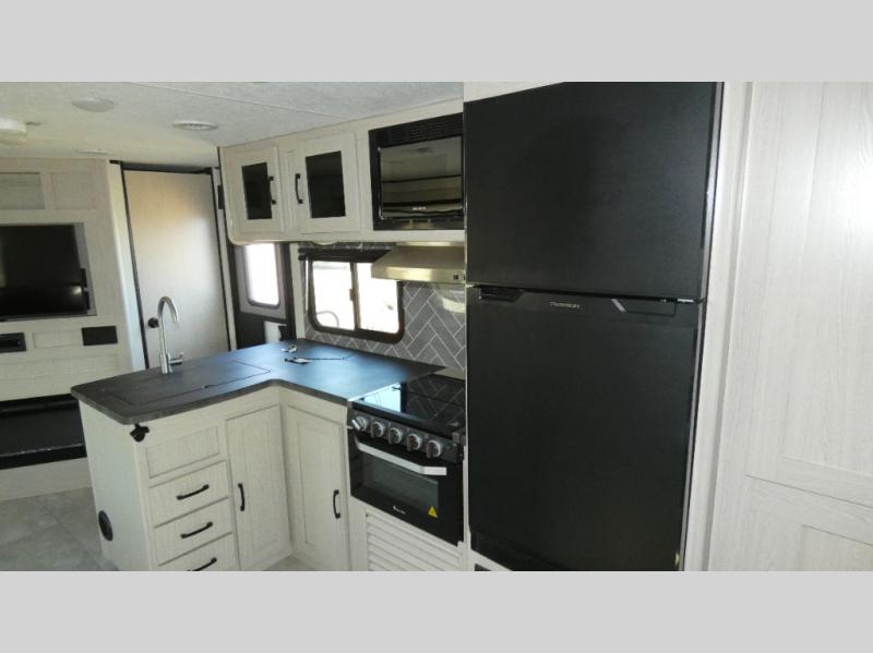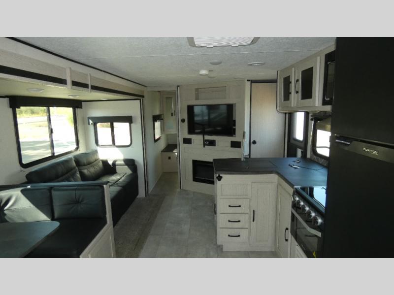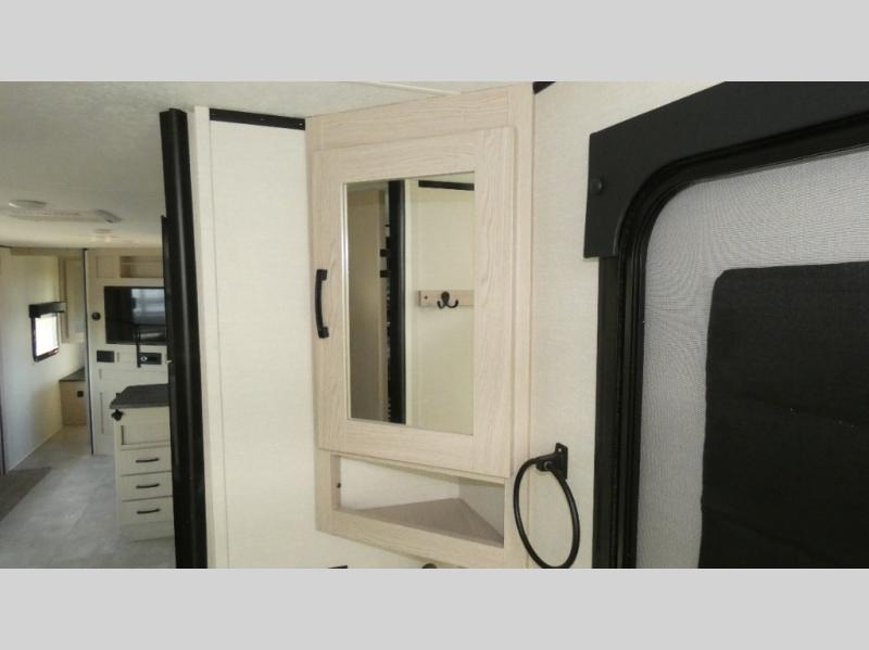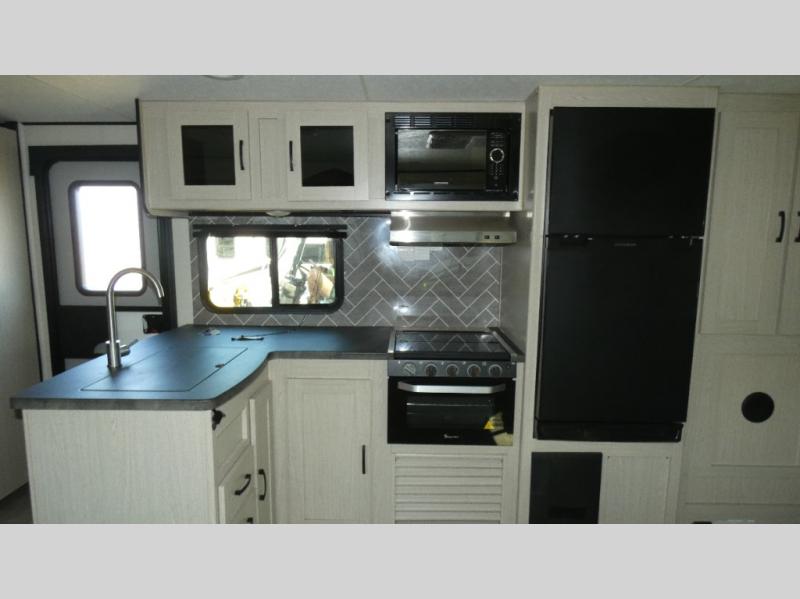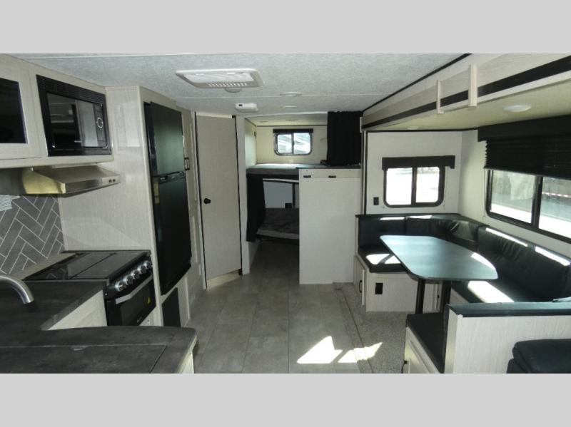 Pack your bags and head to your local state park for fun in this dual entry travel trailer. The kids will love the double-size bunks that include a ladder, and the full bath with its own exterior entry door is close by for nighttime use. The main living area will be a favorite hangout spot with its large slide out, U-shaped dinette, sofa, and 40" LED TV! The chef can cook at-home meals on the three burner cooktop, plus there is an exterior camp kitchen for quick meals outdoors. And check out the front private bedroom with a queen bed, dual wardrobes, and a linen closet for clean towels!