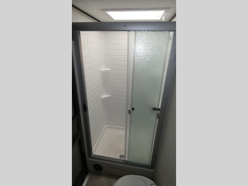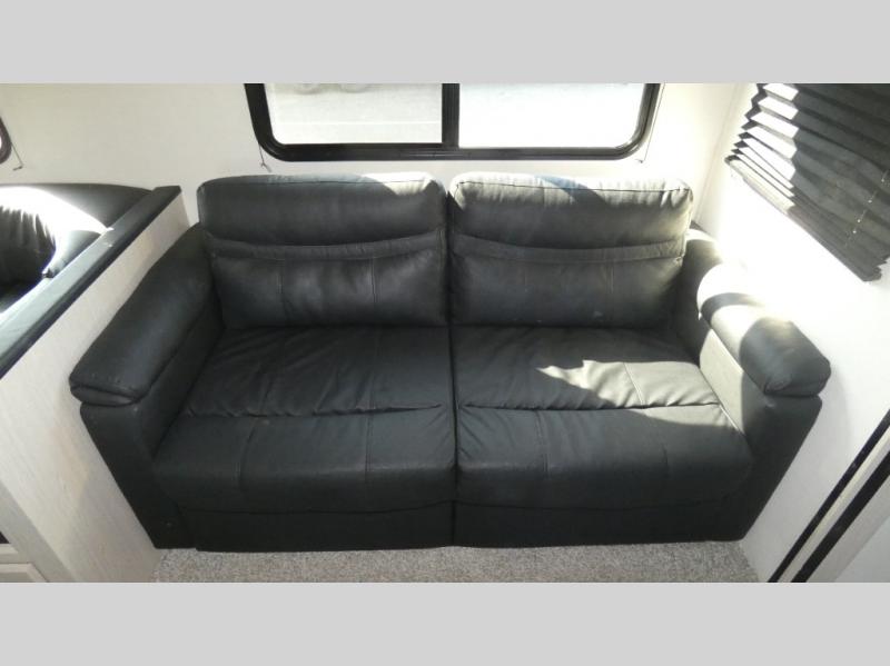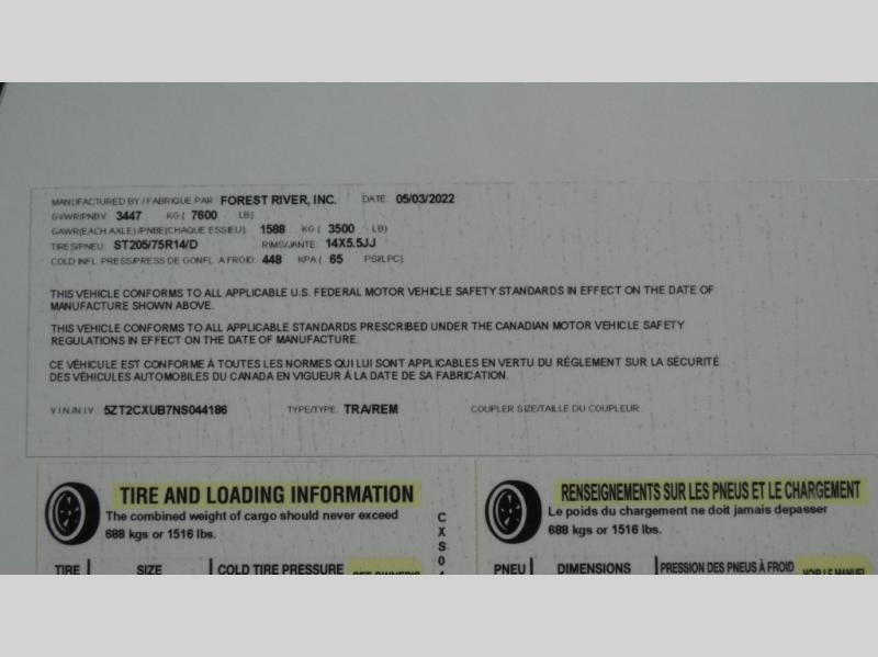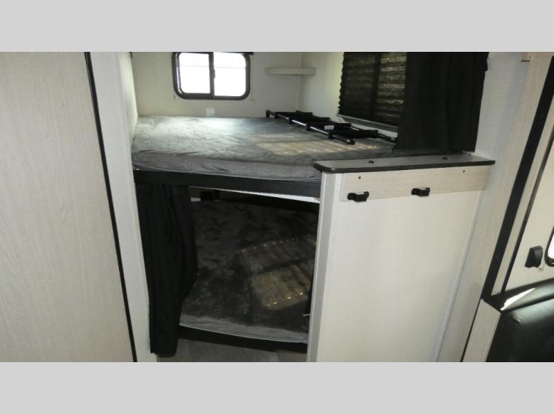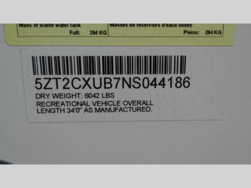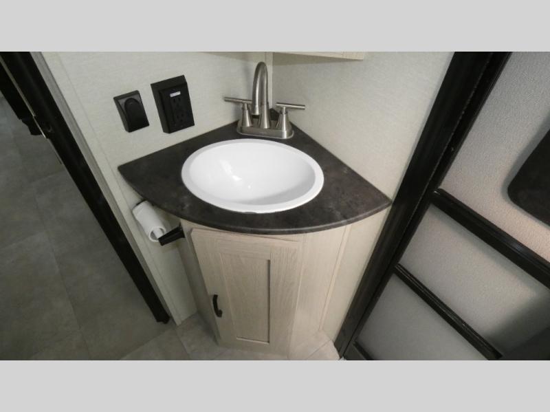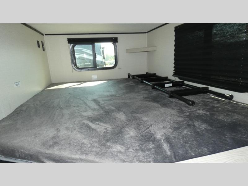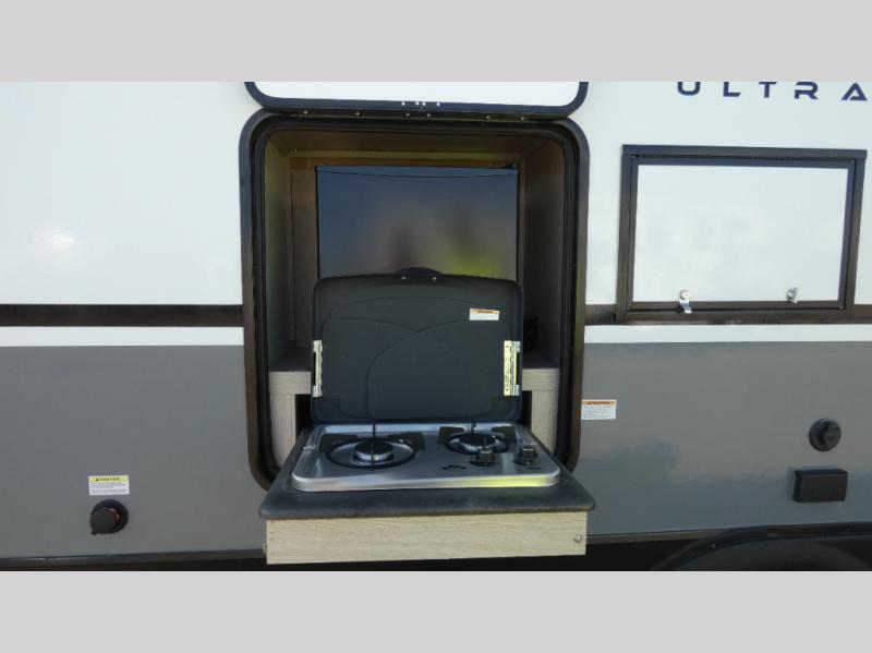 Pack your bags and head to your local state park for fun in this dual entry travel trailer. The kids will love the double-size bunks that include a ladder, and the full bath with its own exterior entry door is close by for nighttime use. The main living area will be a favorite hangout spot with its large slide out, U-shaped dinette, sofa, and 40" LED TV! The chef can cook at-home meals on the three burner cooktop, plus there is an exterior camp kitchen for quick meals outdoors. And check out the front private bedroom with a queen bed, dual wardrobes, and a linen closet for clean towels!