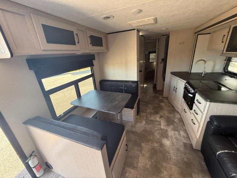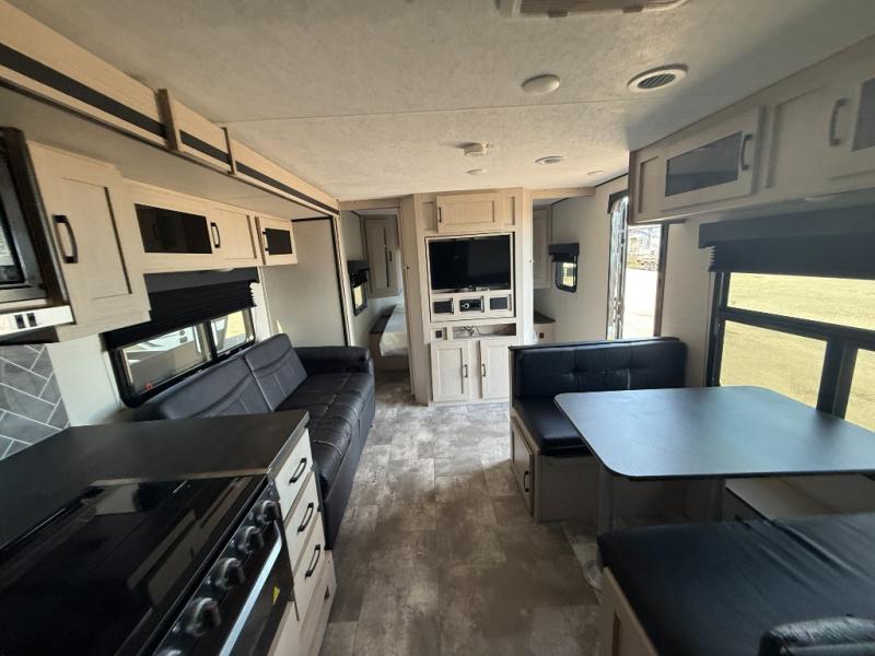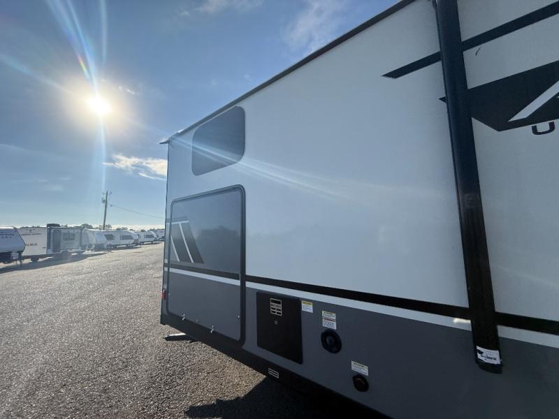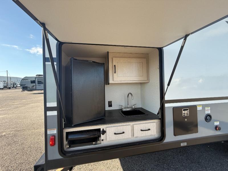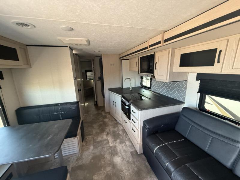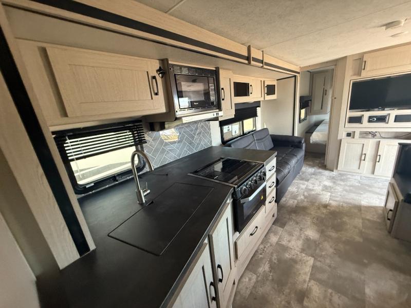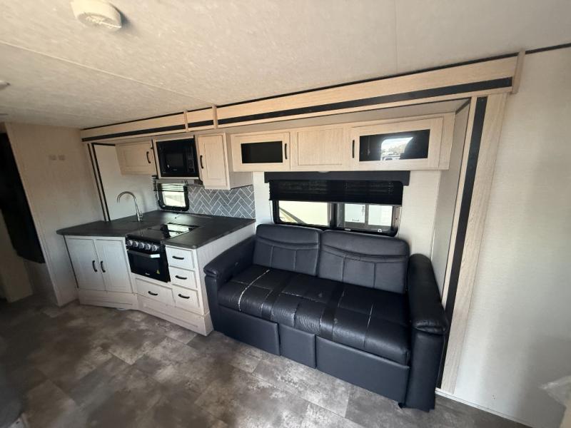 Double slides, a front private bedroom, plus sleeping space for seven make this model ready for fun! There is a private bunkhouse with a futon and an overhead bunk, plus a second bunk and tons of space provide by the slide out. You will have a queen bed to sleep on each night in the front bedroom, and any other guests can sleep on the booth dinette and sofa in the main living area. The chef can cook indoors, or outdoors on the outside kitchen, and since there is an 18' power awning with LED lights, they'll enjoy some shade!