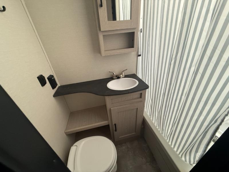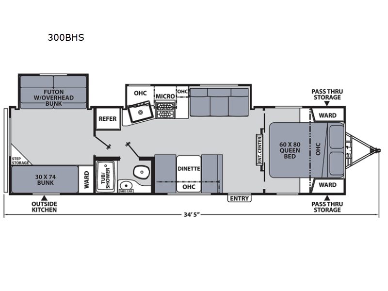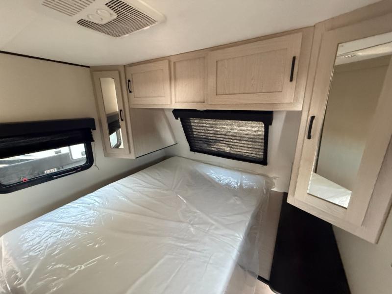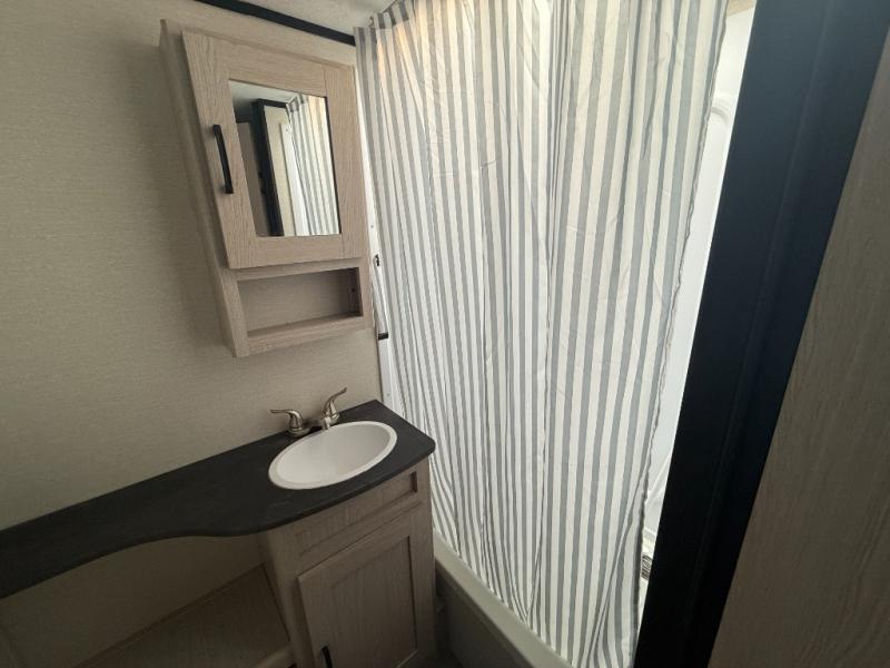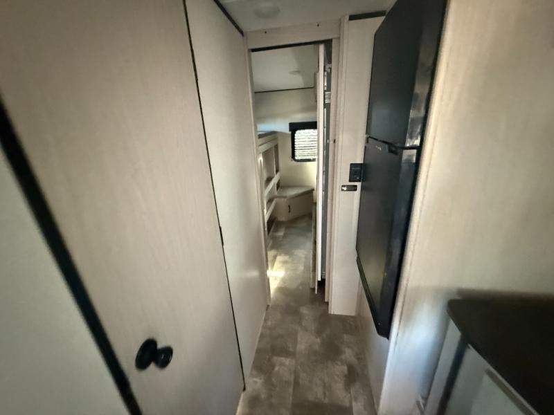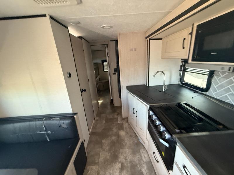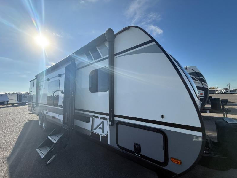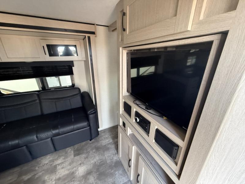 Double slides, a front private bedroom, plus sleeping space for seven make this model ready for fun! There is a private bunkhouse with a futon and an overhead bunk, plus a second bunk and tons of space provide by the slide out. You will have a queen bed to sleep on each night in the front bedroom, and any other guests can sleep on the booth dinette and sofa in the main living area. The chef can cook indoors, or outdoors on the outside kitchen, and since there is an 18' power awning with LED lights, they'll enjoy some shade!